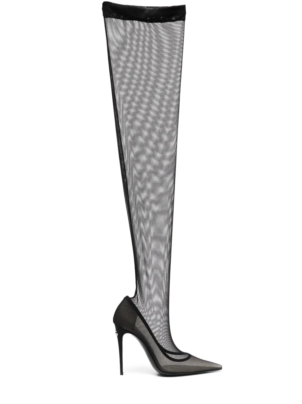 Nero, pelle di vitello, design a punta, soletta con logo e altezza alla coscia.