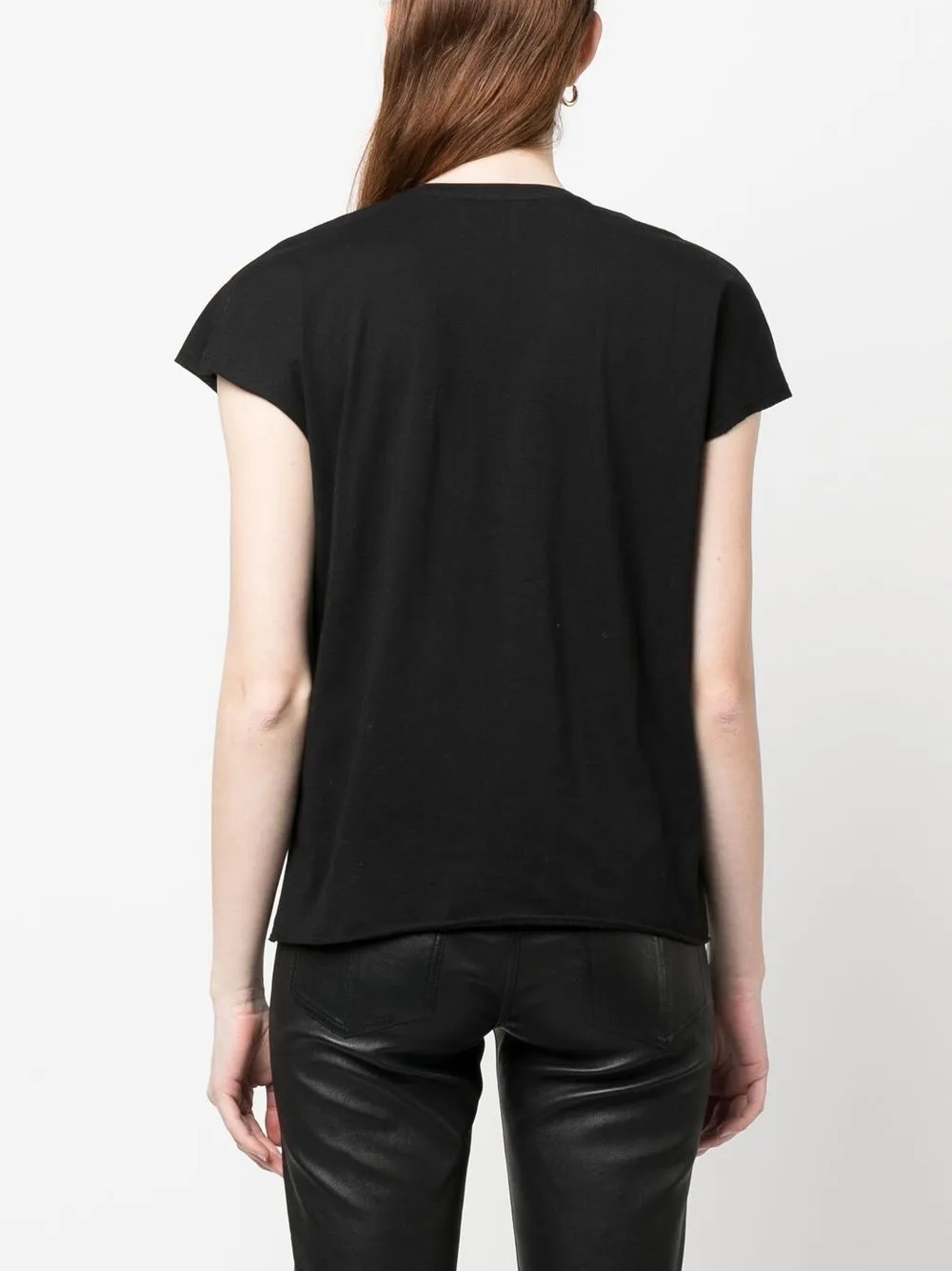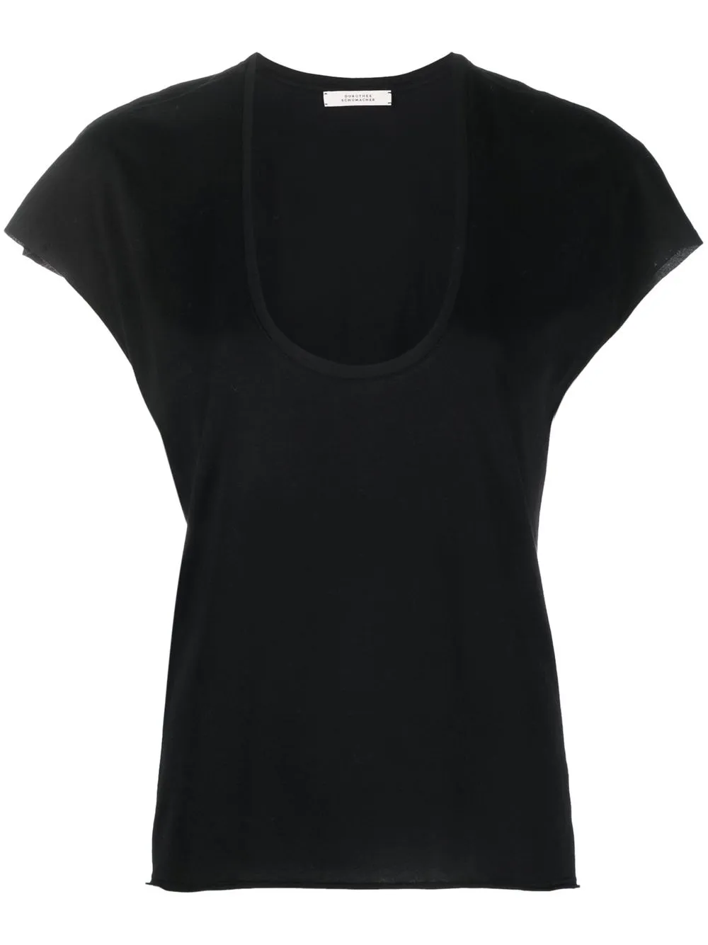 Nero, cotone, scollo profondo a U, maniche ad aletta e orlo curvo.