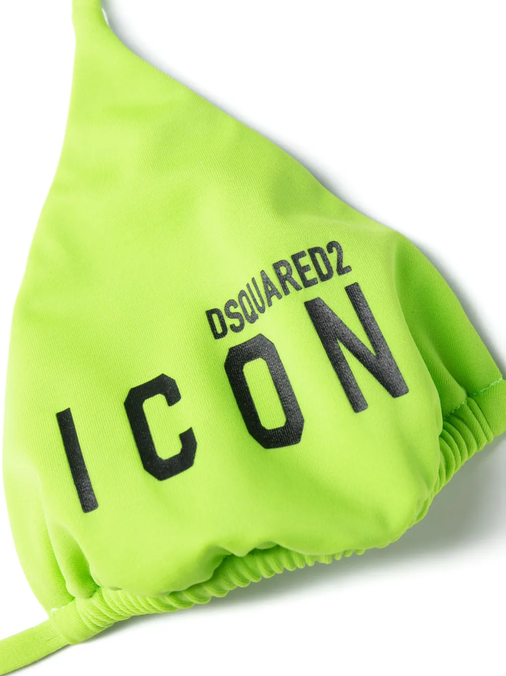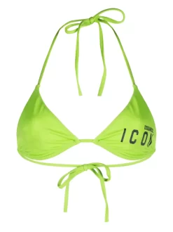 Be Icon triangle bikini top from DSQUARED2 featuring parakeet green, black, stretch-design, signature Icon motif, logo print to the front, triangle cup, halterneck tie fastening, rear tie fastening and sleeveless. Be mindful to try on swimwear over your own garments..