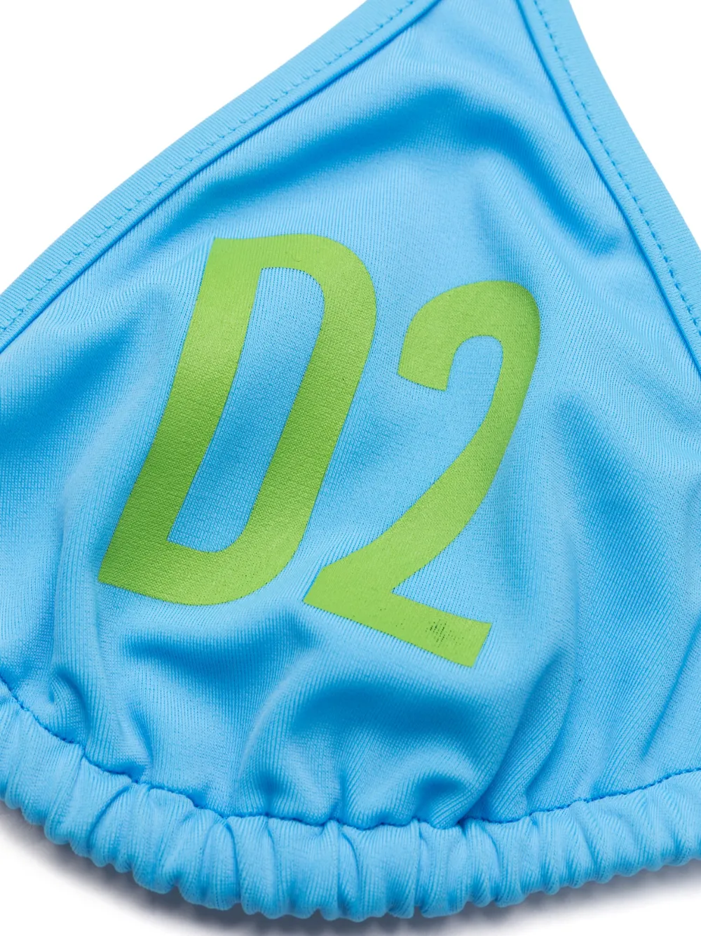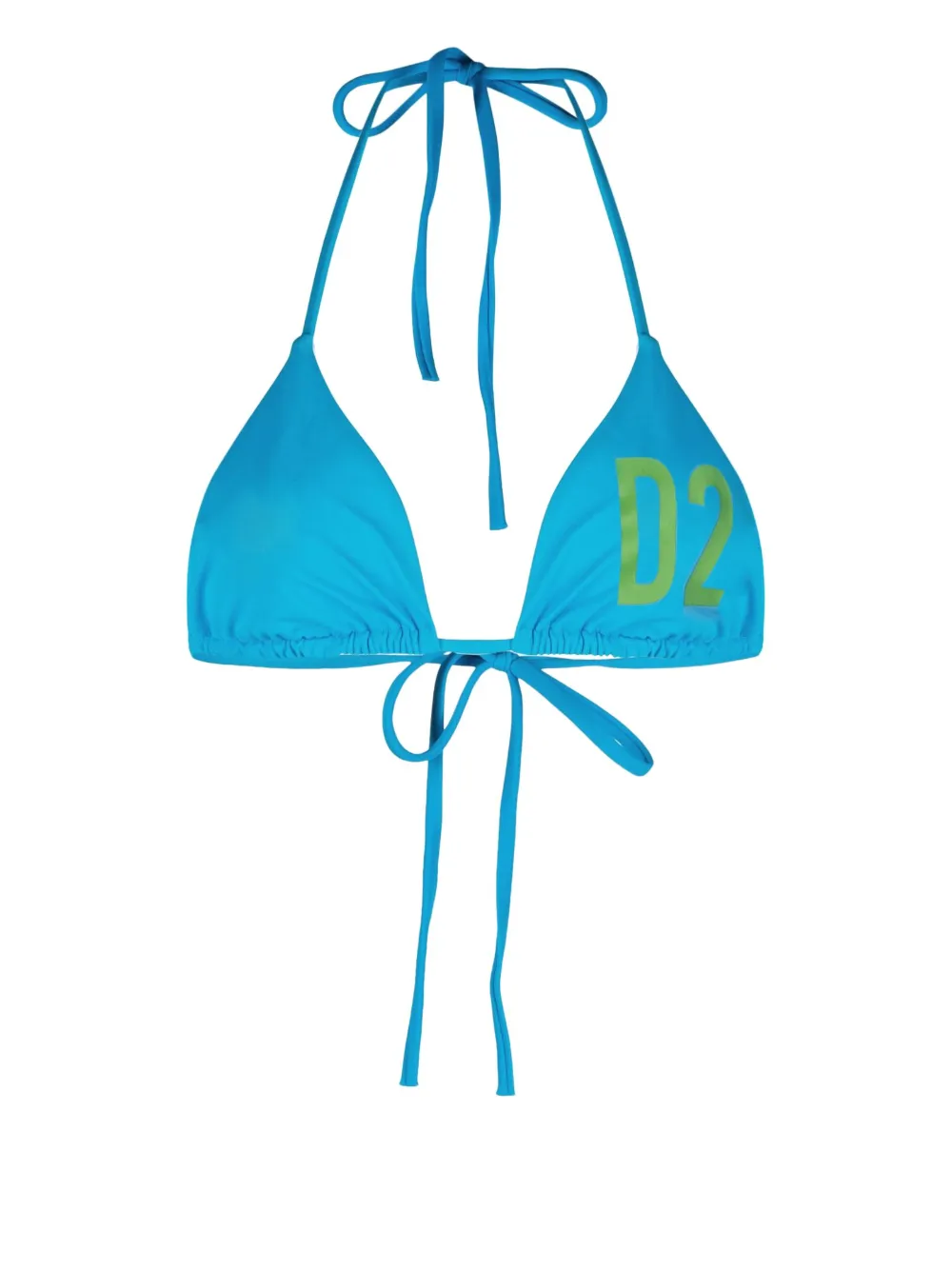 Technicolour triangle bikini top from DSQUARED2 featuring cyan blue, parakeet green, stretch-design, logo print to the front, triangle cup, halterneck tie fastening, rear tie fastening and sleeveless. Be mindful to try on swimwear over your own garments..