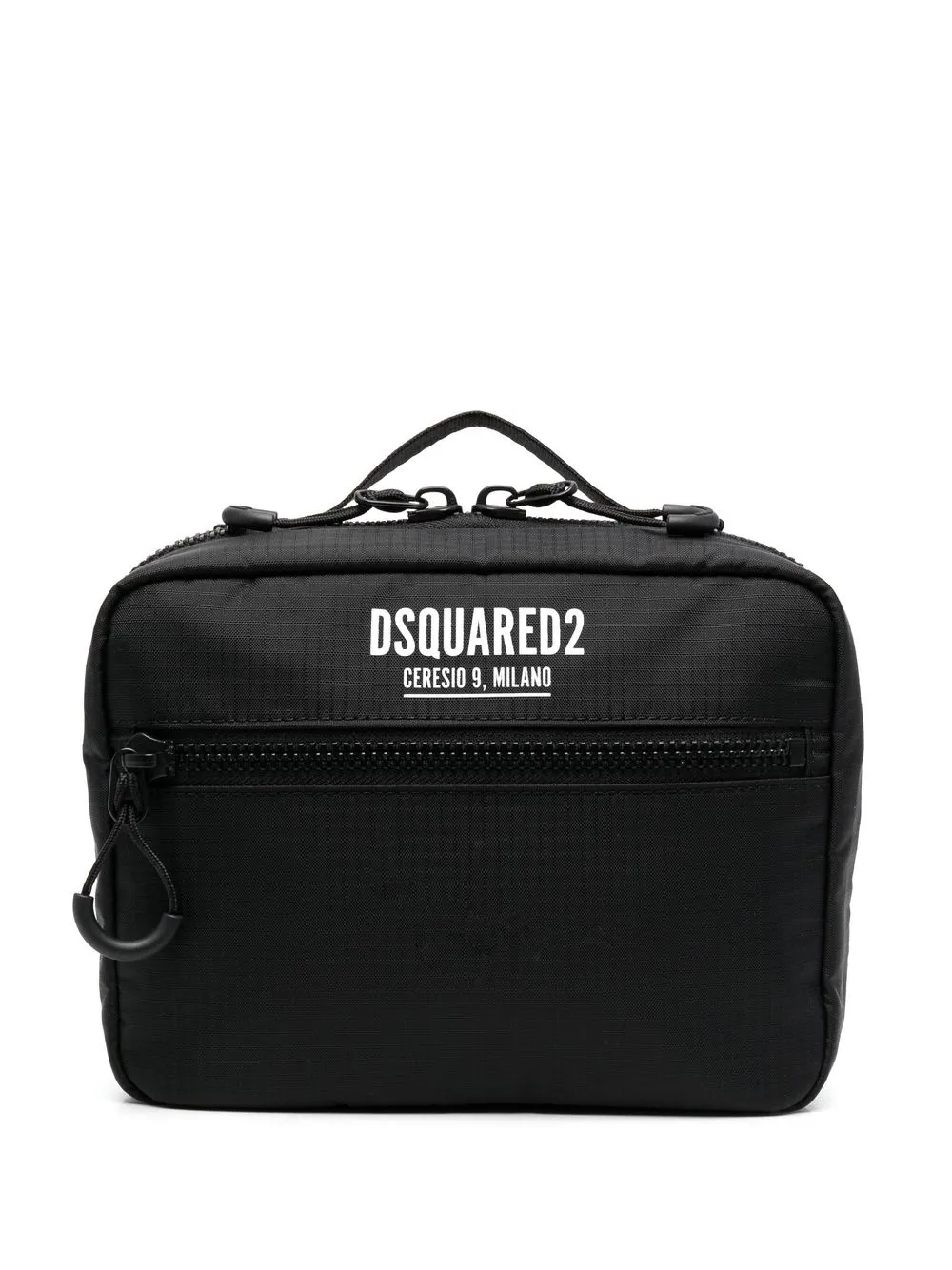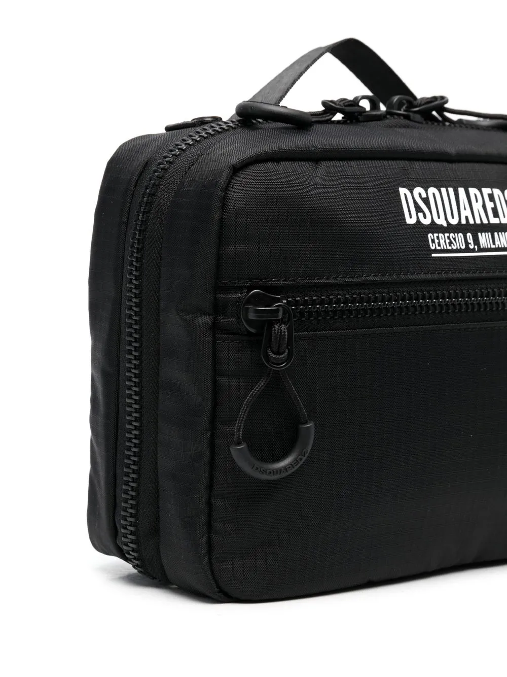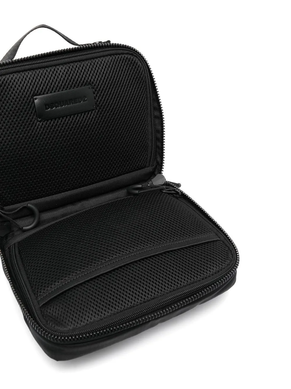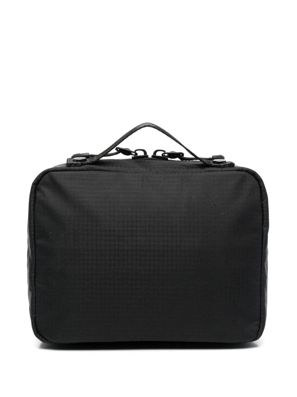 Nero, stampa con logo sul davanti, chiusura con zip a doppio cursore, tasca frontale con zip e manico piatto.