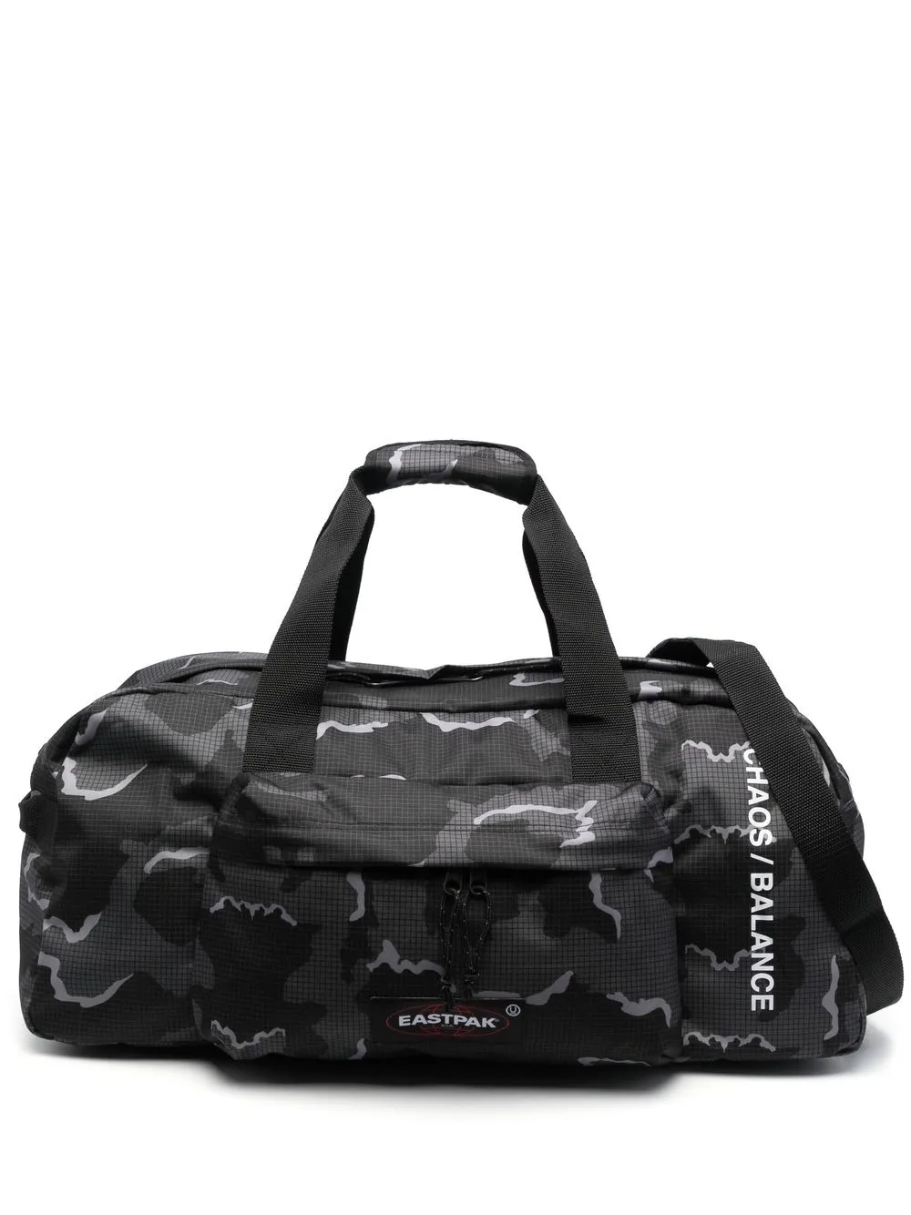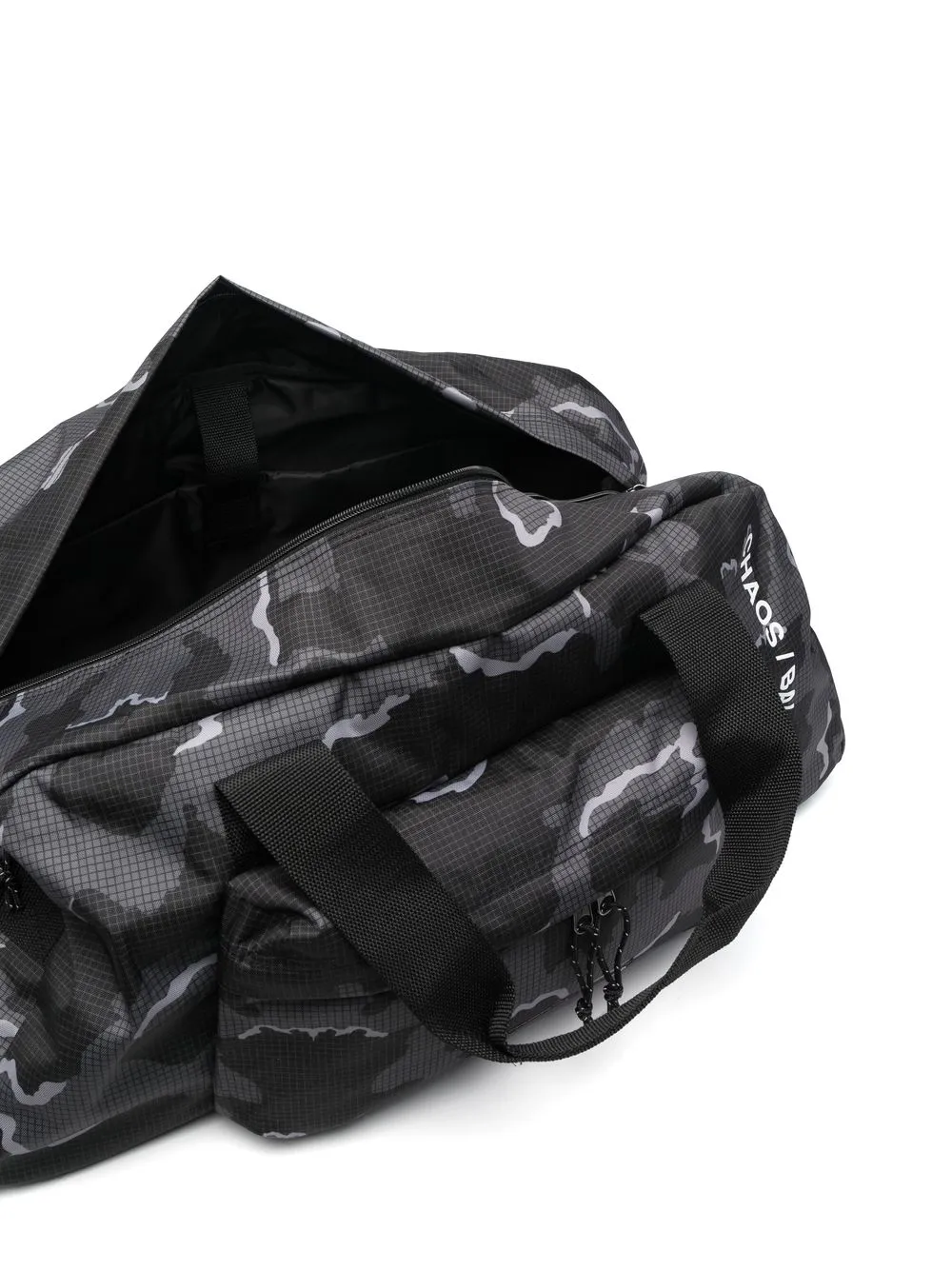 Nero, stampa mimetica, motivo a griglia, applicazione frontale con logo, scomparto frontale con zip, due manici, tracolla regolabile e rimovibile, chiusura superiore con zip e scomparto unico.