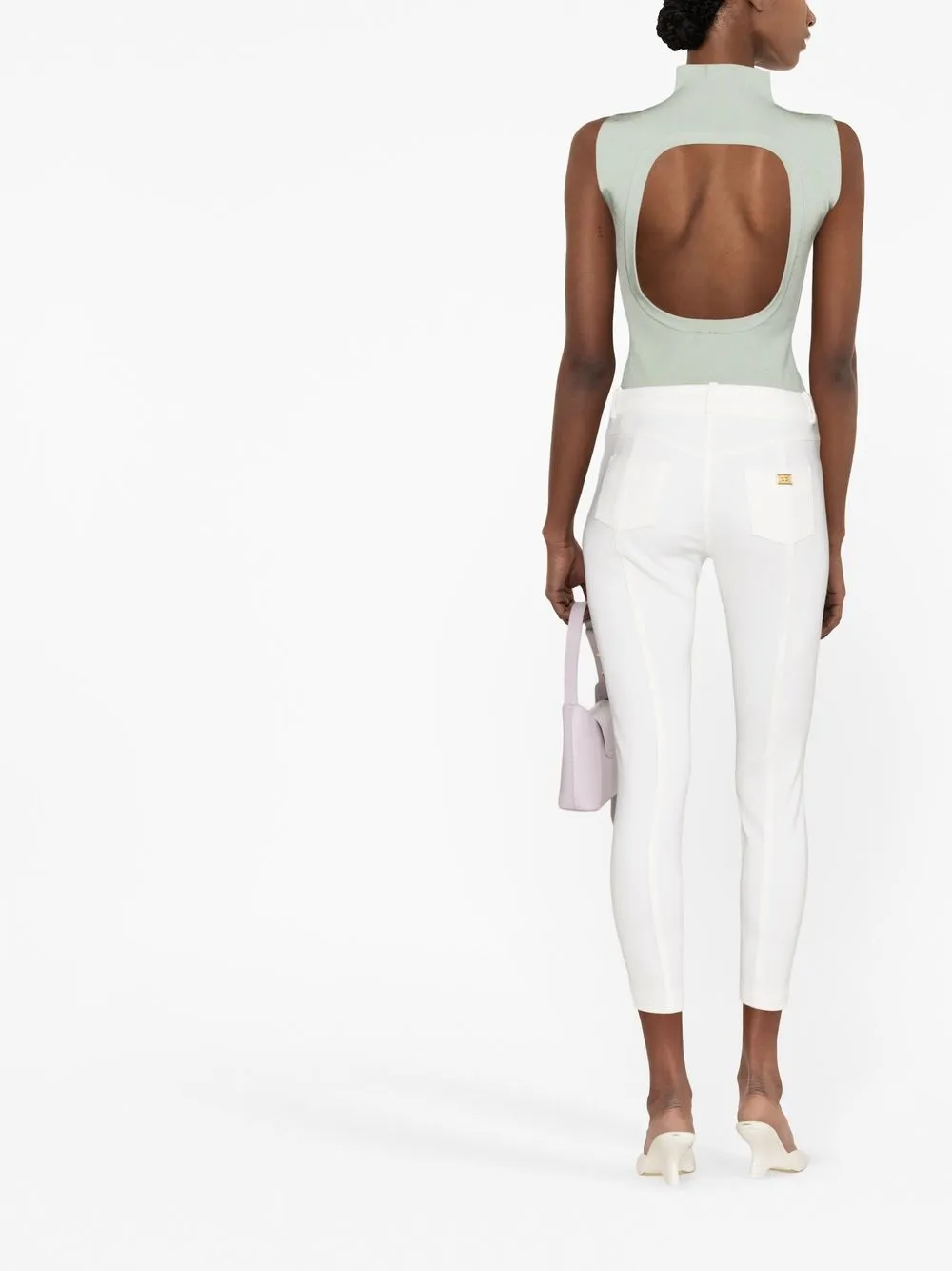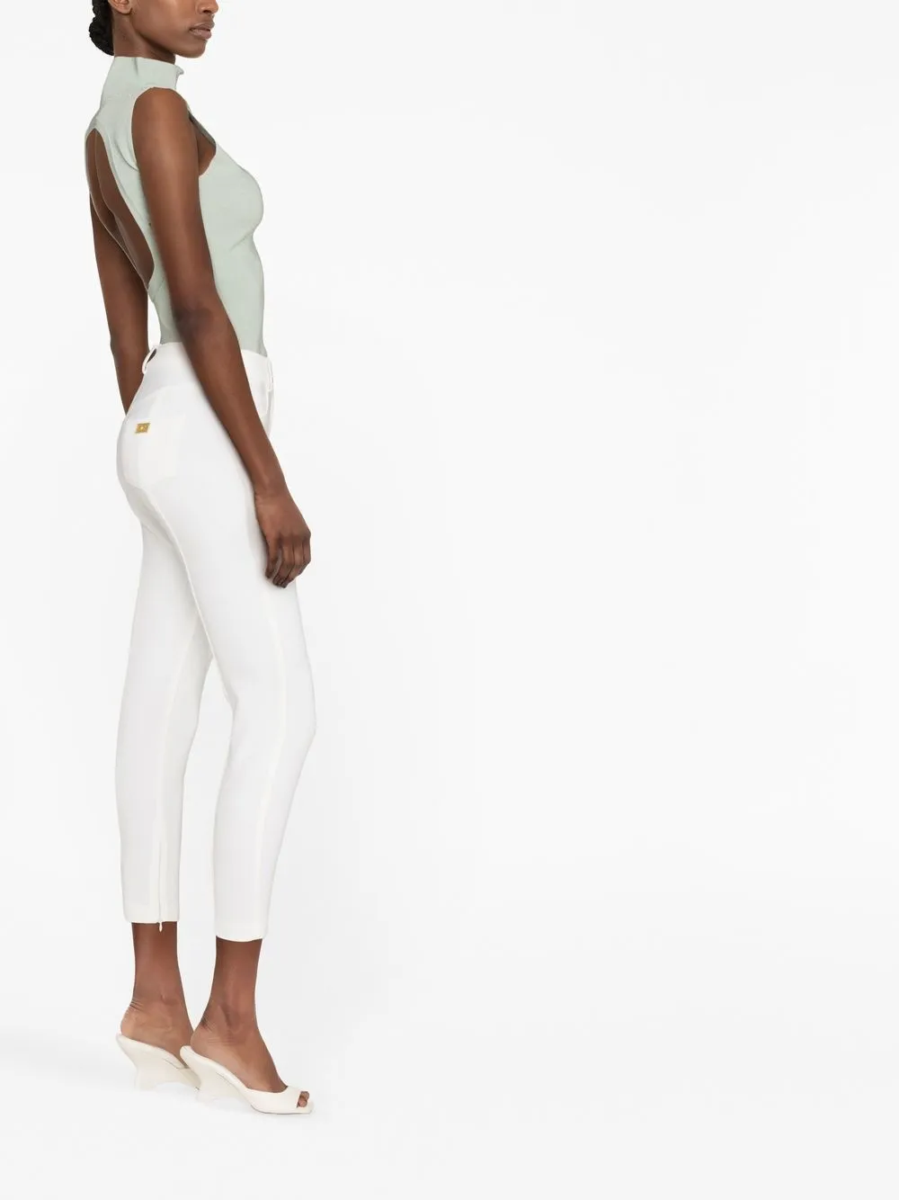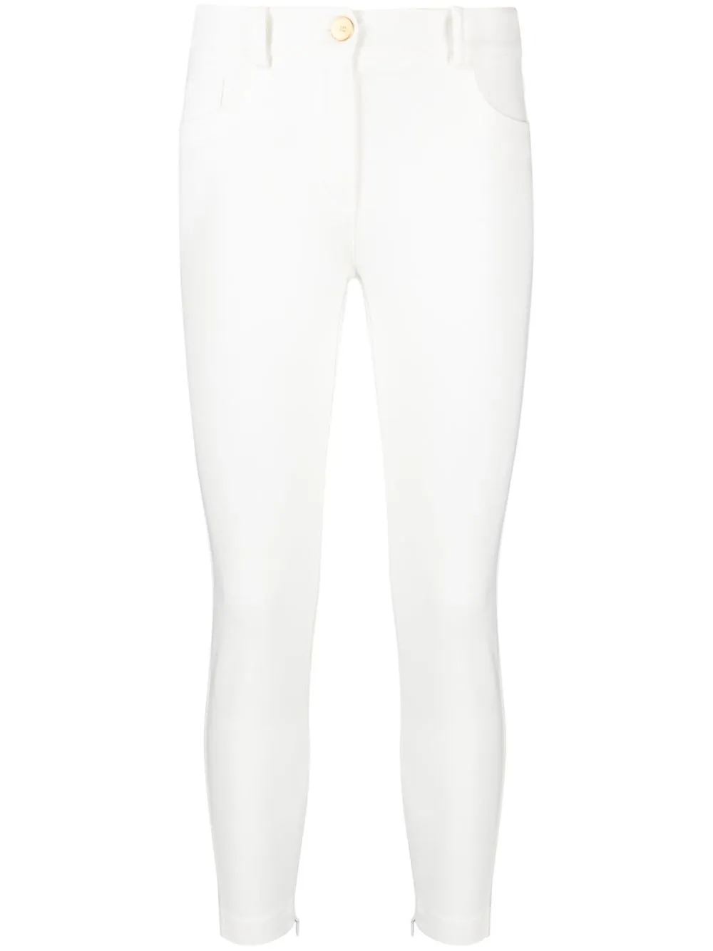 Tonalità bianco avorio, design elasticizzato, vita alta, passanti, design classico a cinque tasche, chiusura frontale con bottoni e zip, taglio skinny e taglio crop.