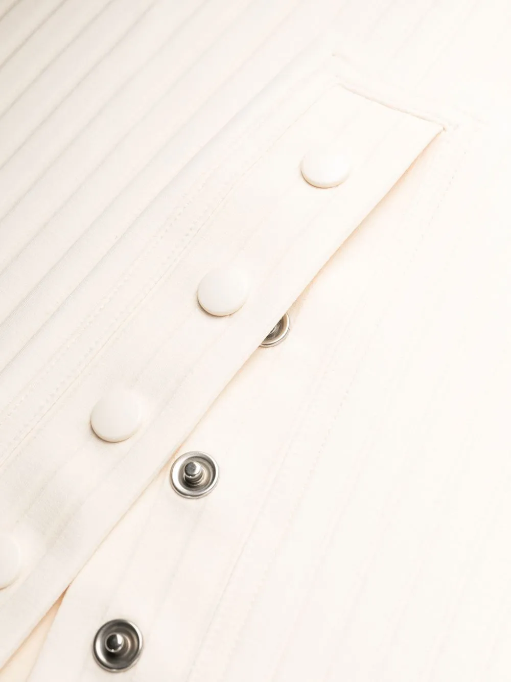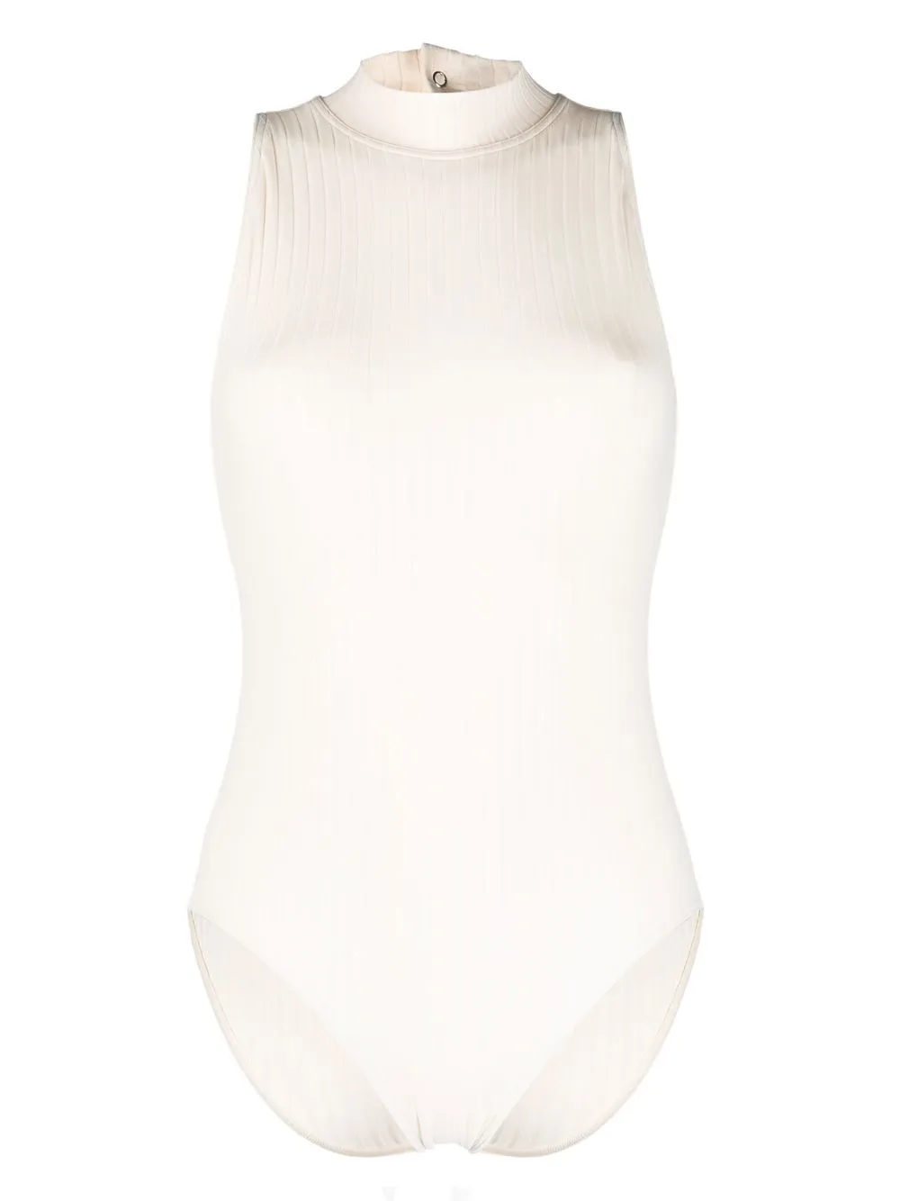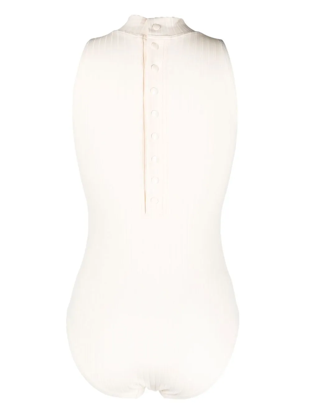 Bianco crema, design elasticizzato, dettaglio a coste, collo alto, chiusura posteriore con bottone a pressione e senza maniche. I costumi da bagno devono essere provati indossando il proprio indumento intimo.
