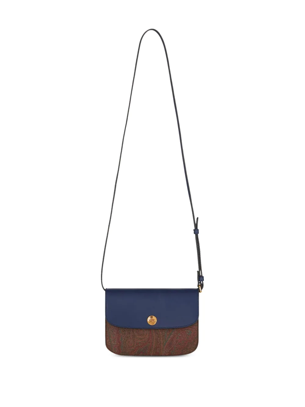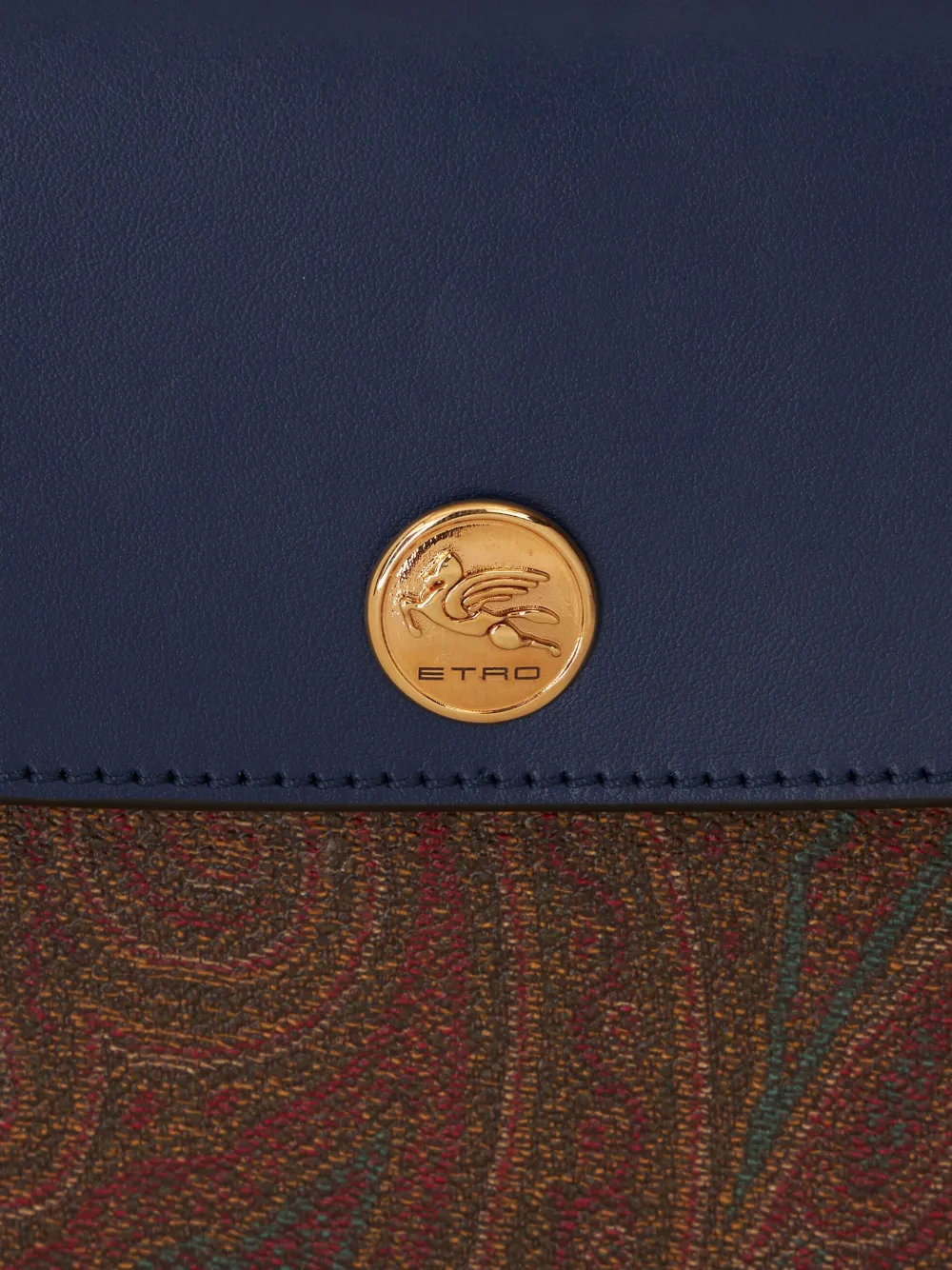 Blu, pelle di vitello, placca con logo, dettagli color oro, pattina nella parte superiore, chiusura magnetica, design con fascia singola, scomparto interno diviso e fodera in pelle scamosciata.