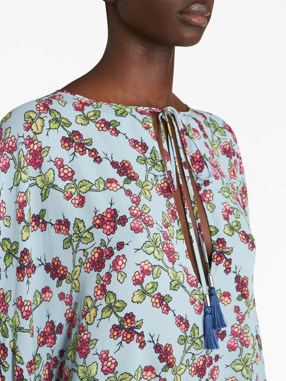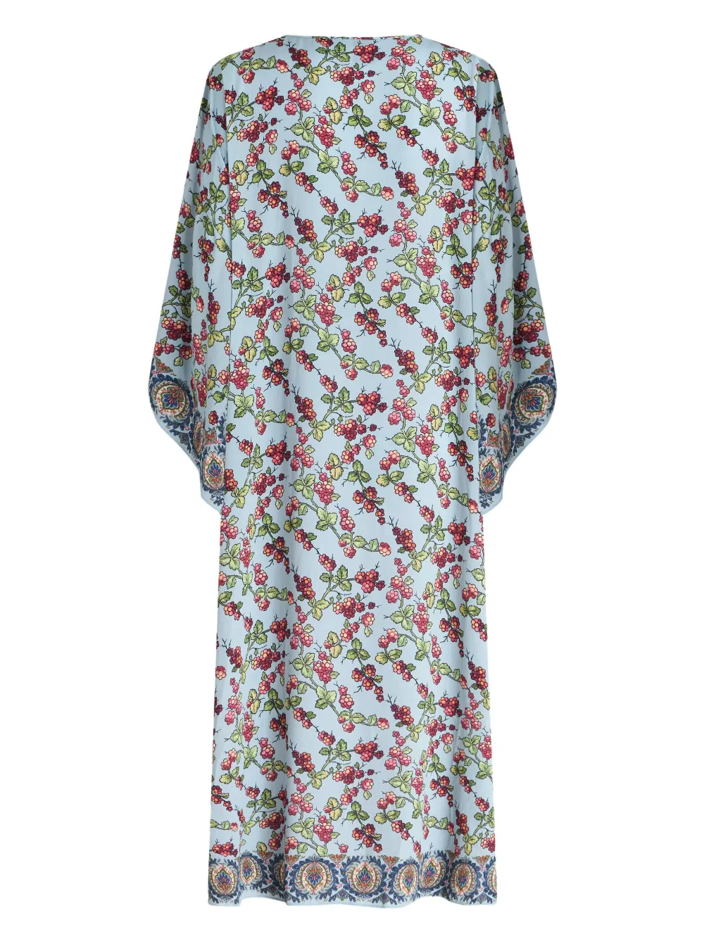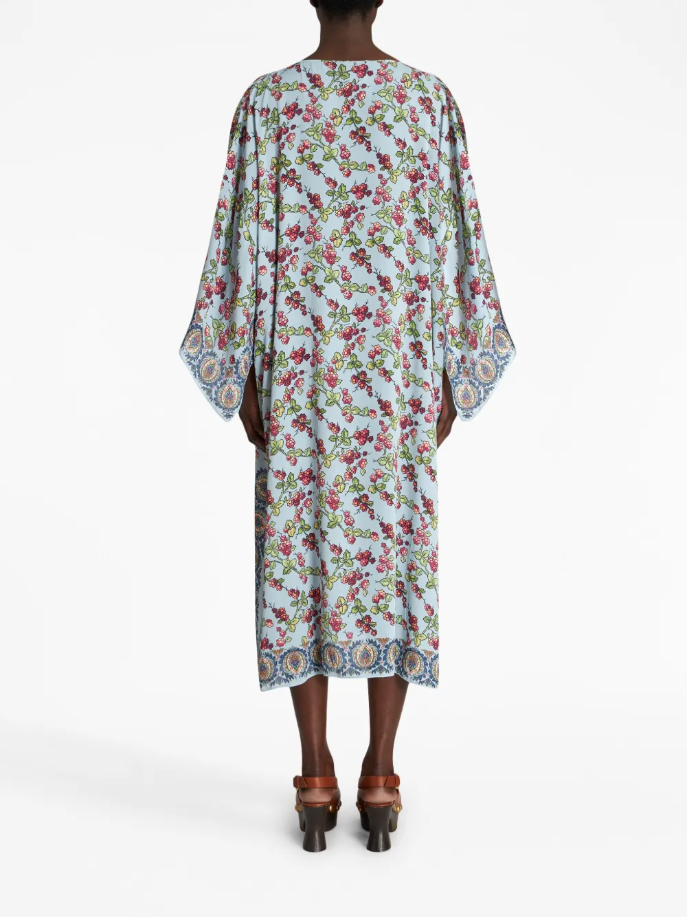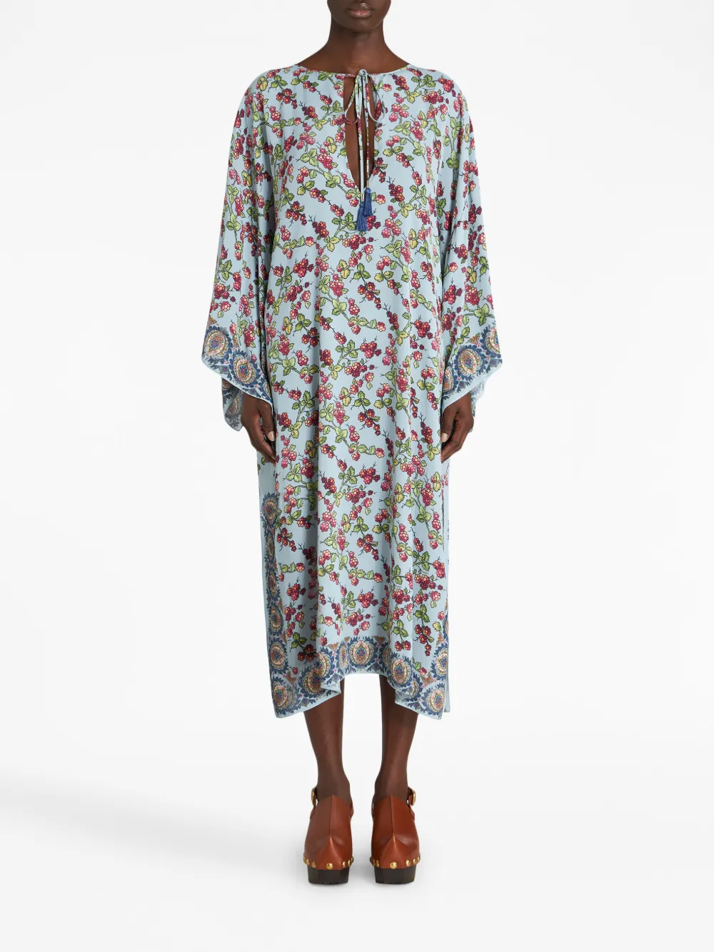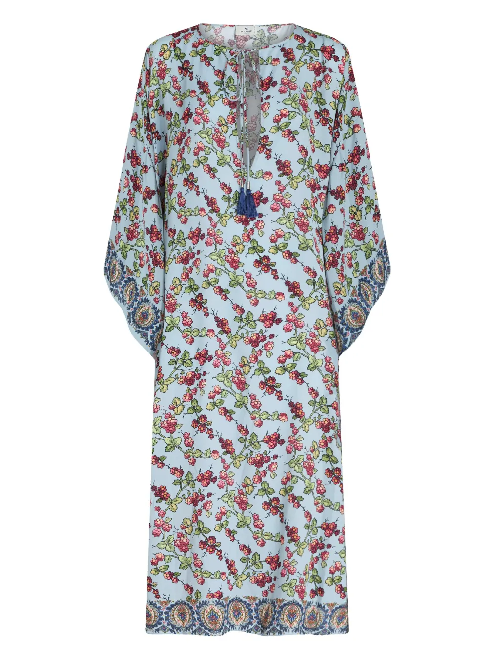 Blu chiaro, silhouette stile caftano, crêpe de chine, stampa con fiori all-over, stampa paisley, dettaglio nappina, scollo rotondo, chiusura frontale con fiocco e lunghezza media.