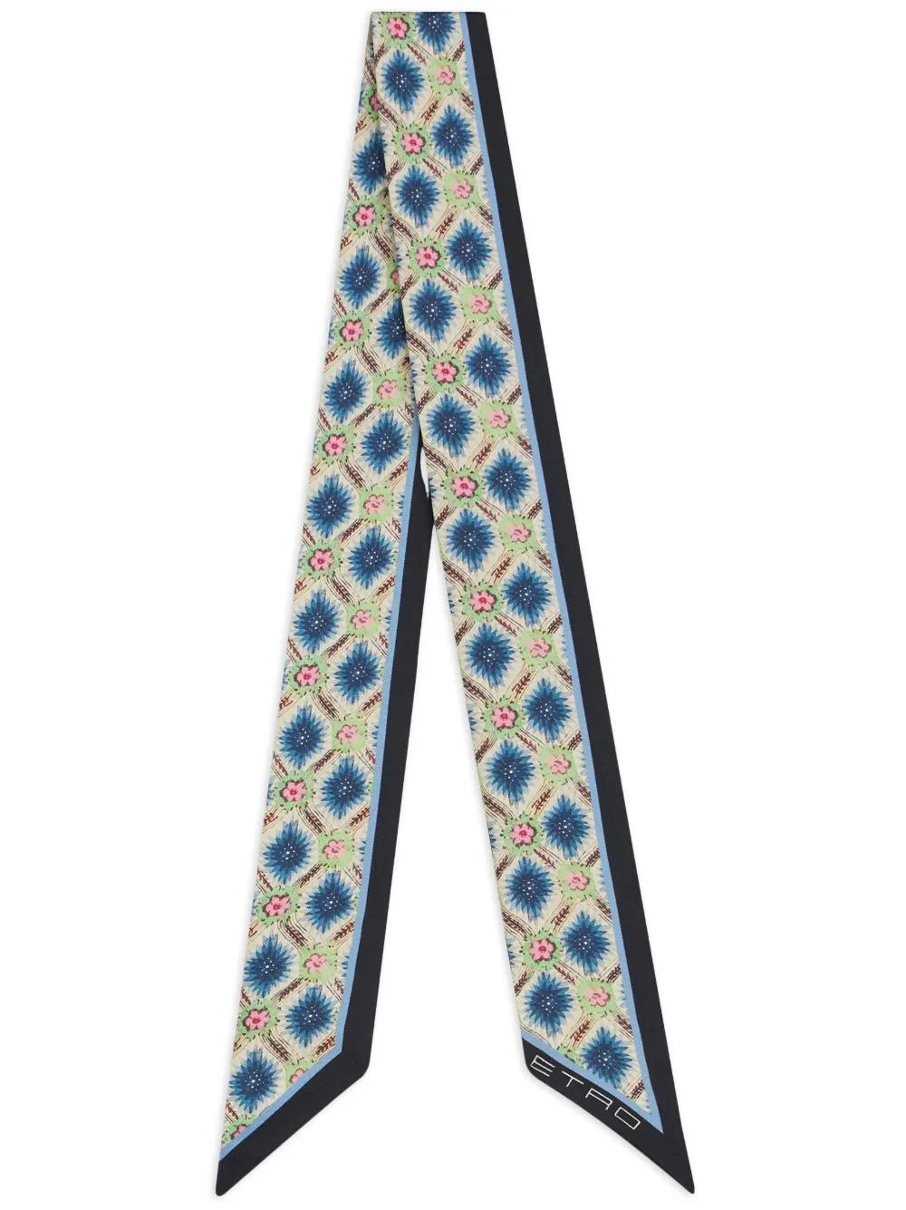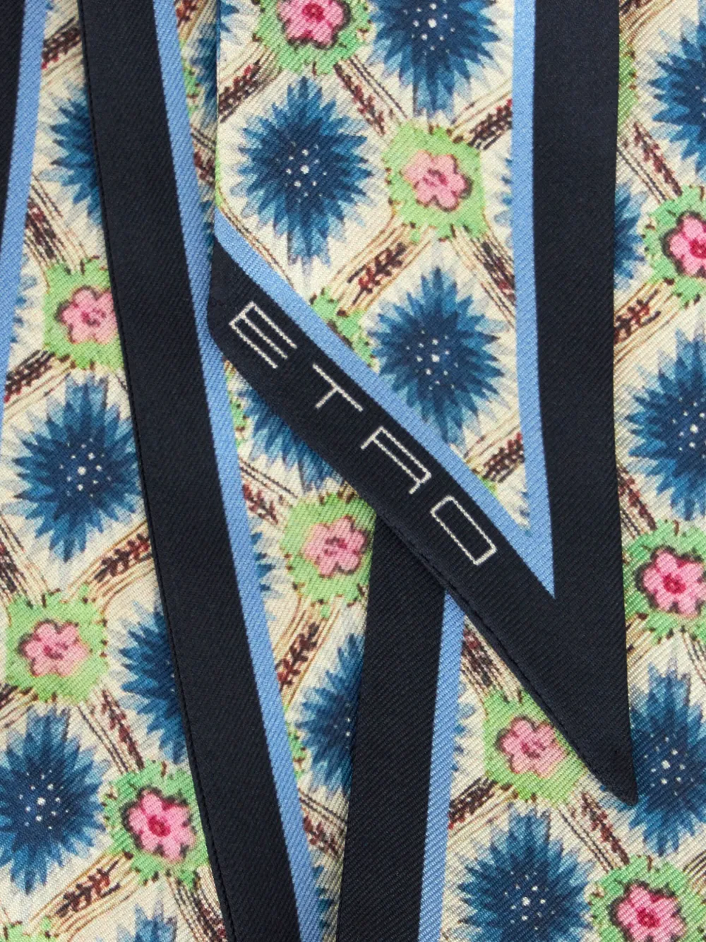 Blu cobalto, multicolore, seta, stampa con fiori all-over, orlo con logo stampato e estremità a punta.