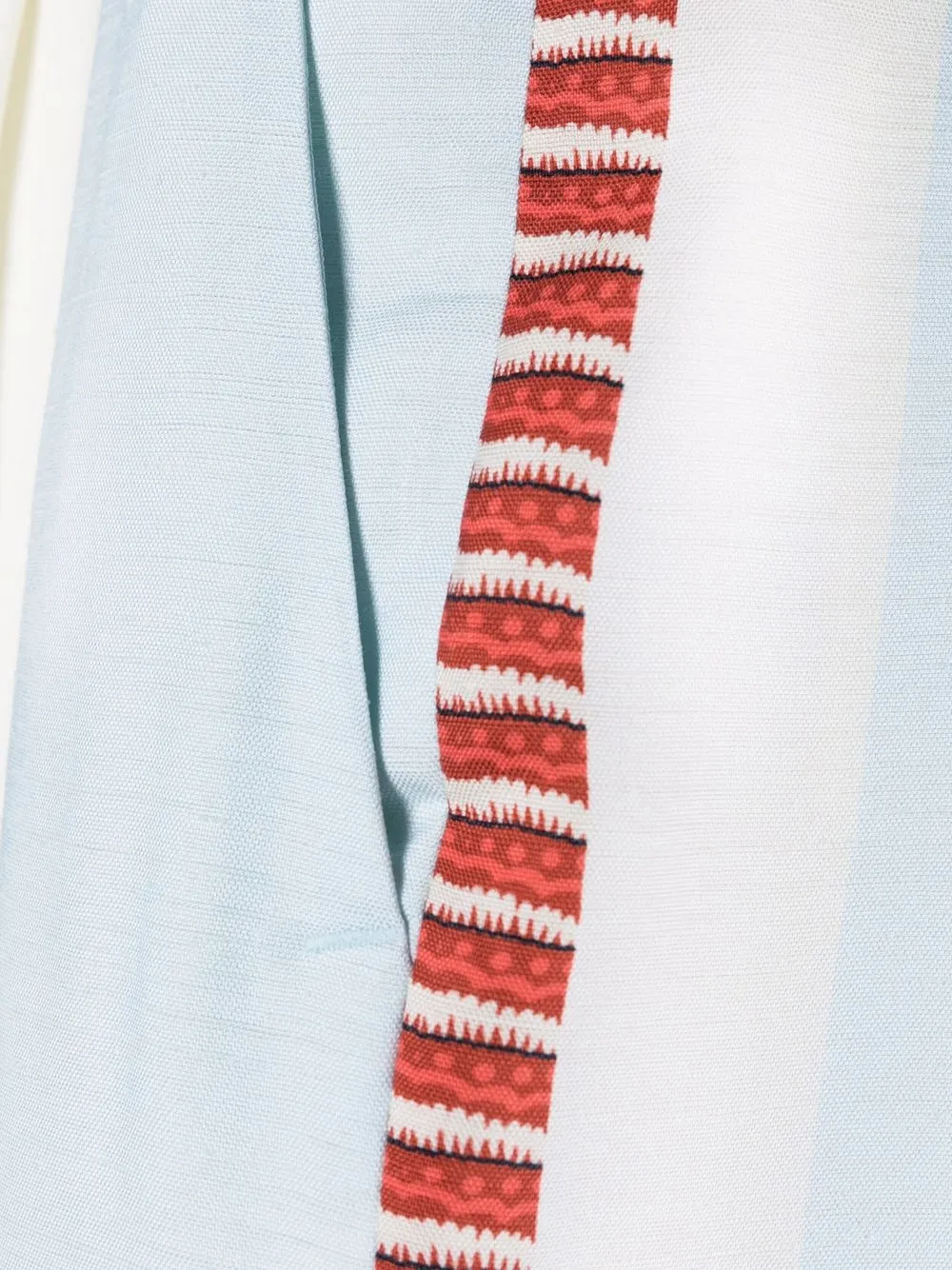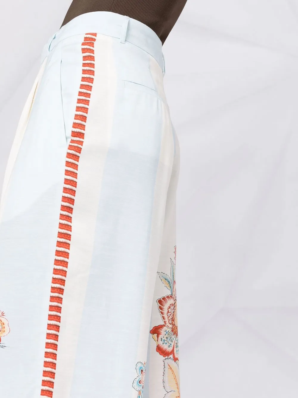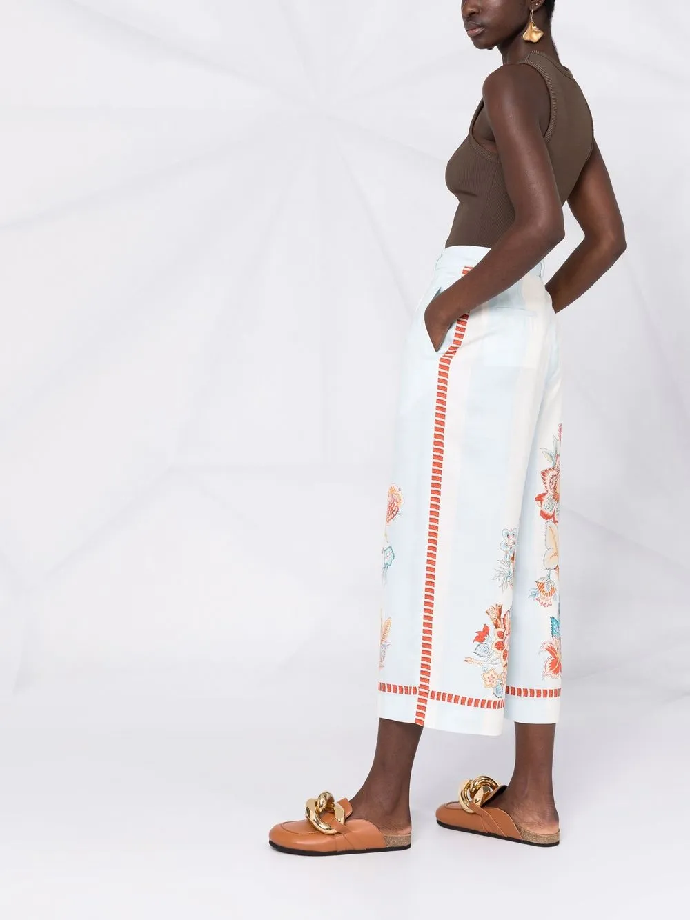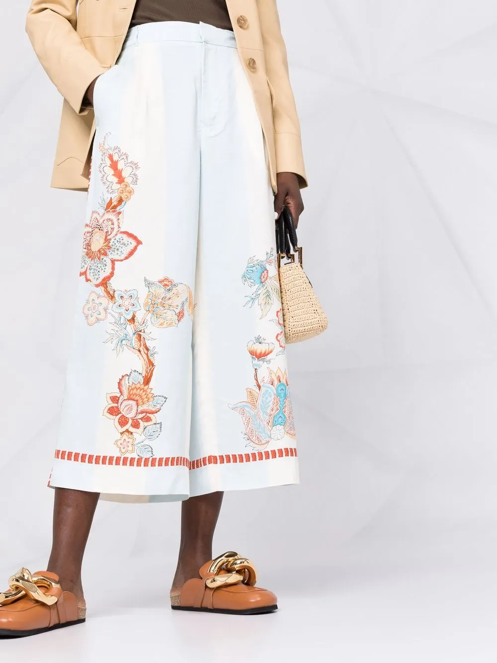 Stampa grafica all-over, vita alta, passanti, chiusura frontale con bottoni e zip, due tasche laterali a soffietto, due tasche posteriori a filetto, vestibilità gamba ampia e taglio crop. Colore: multicolore.