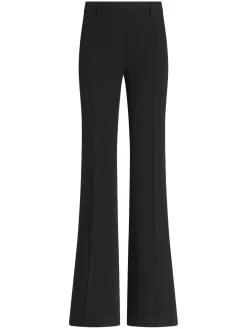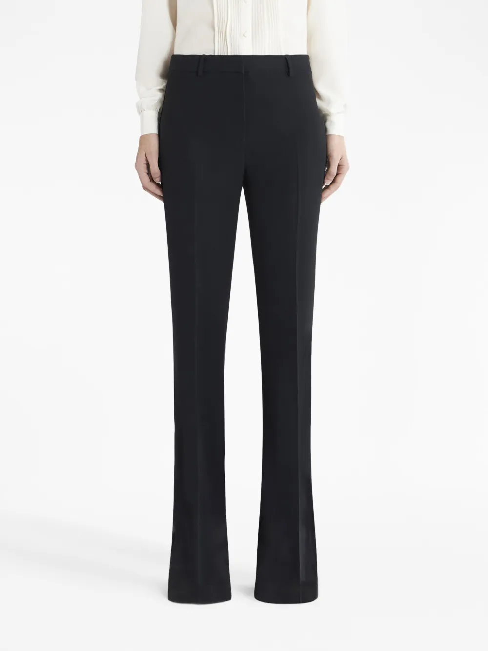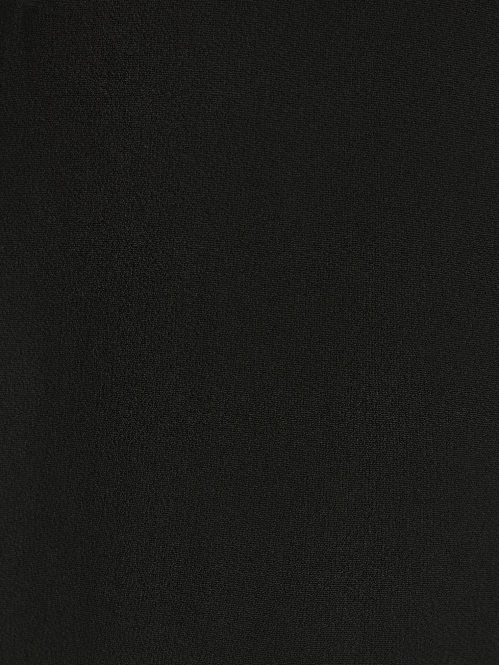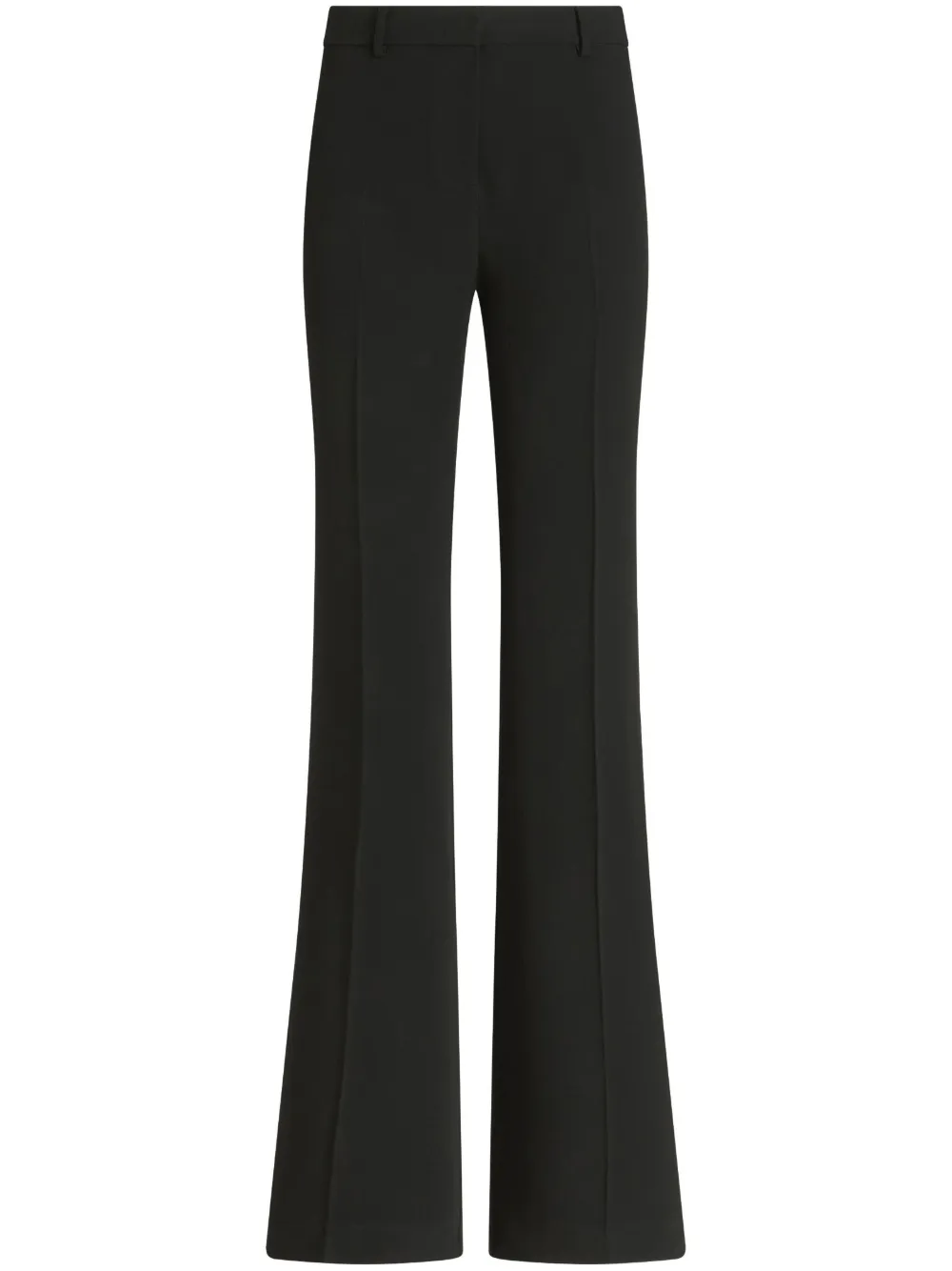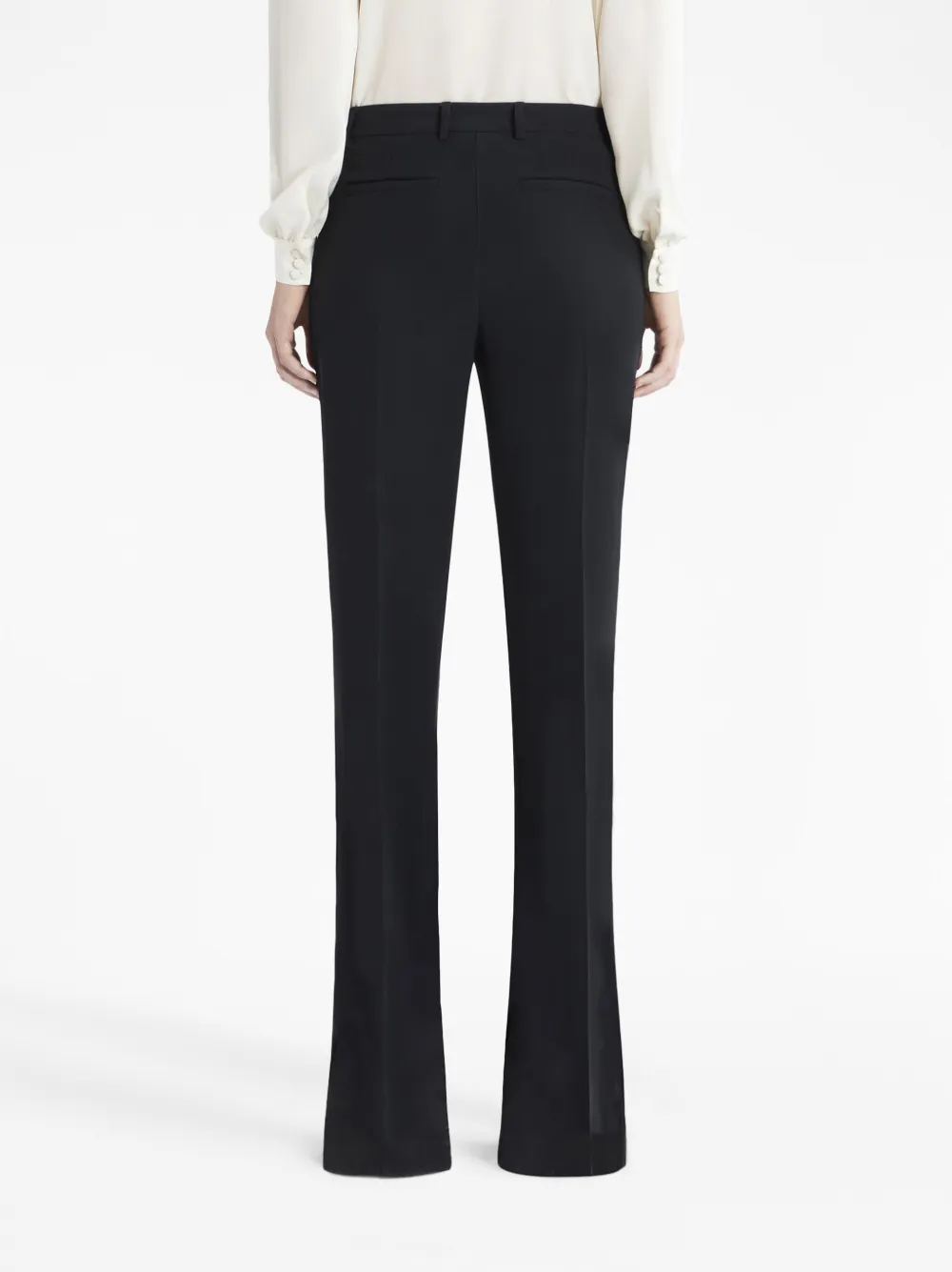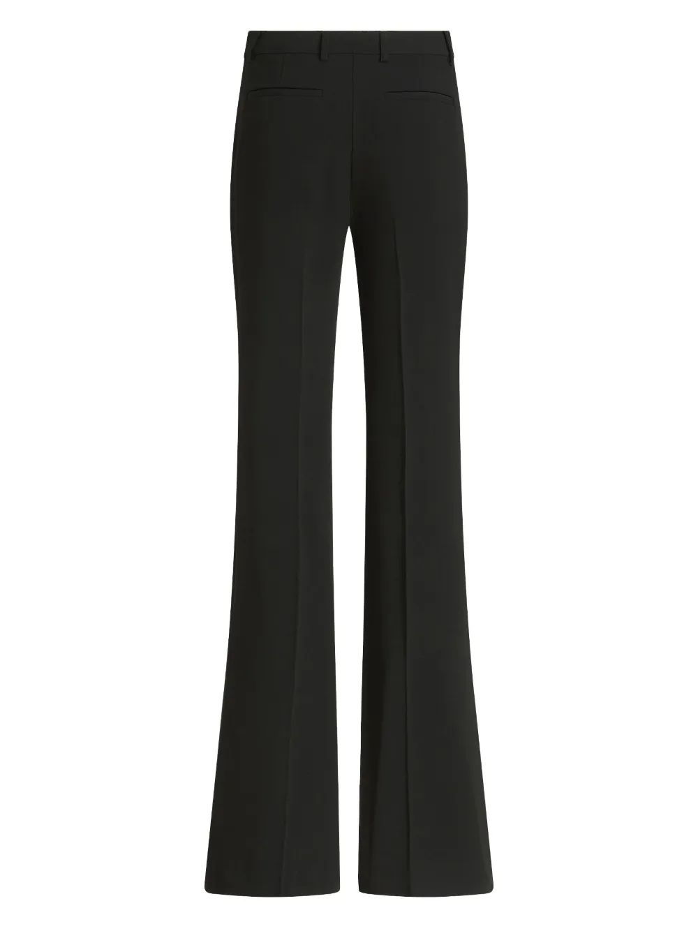 Nero, design elasticizzato, vita media, chiusura frontale nascosta, piega stirata, due tasche laterali a filetto, due tasche posteriori a filetto, passanti e taglio svasato.