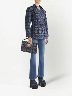 Borgogna, pelle di vitello, tela, stampa paisley, logo ricamato, dettagli color oro, chiusura superiore con zip, manico piatto laterale e scomparto unico.