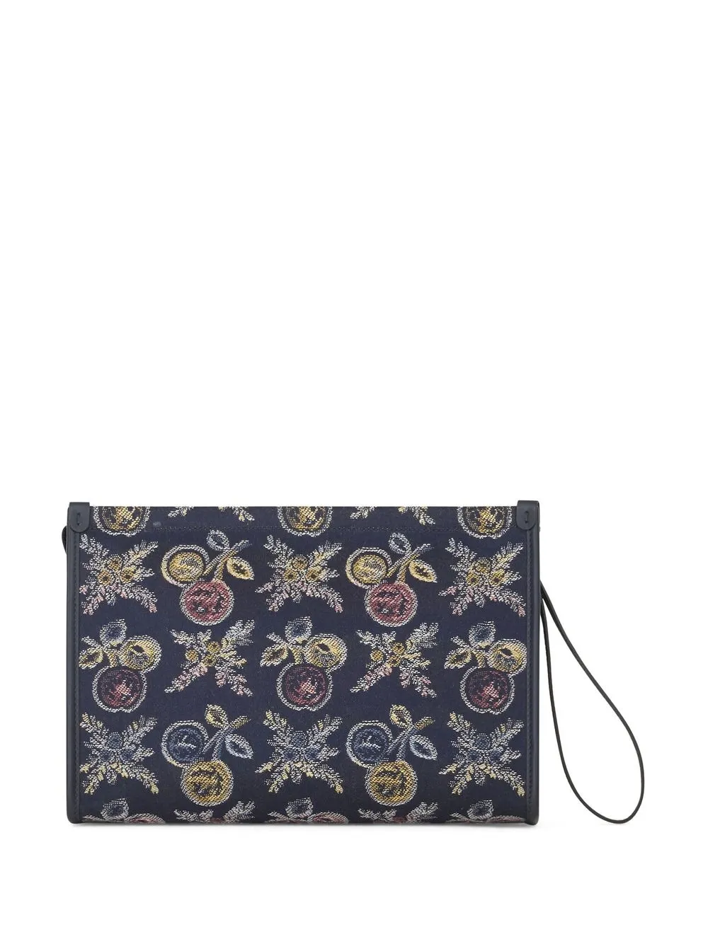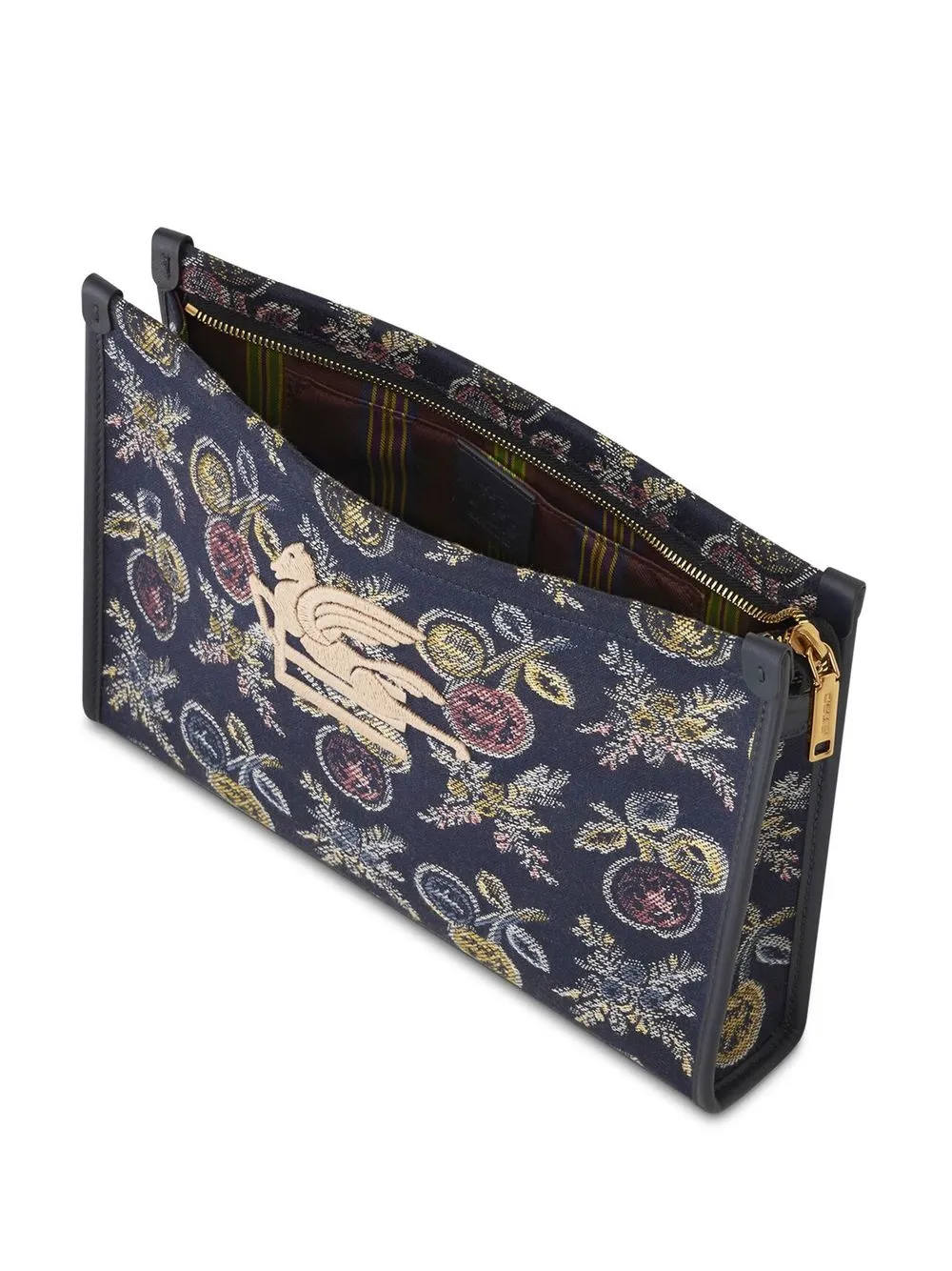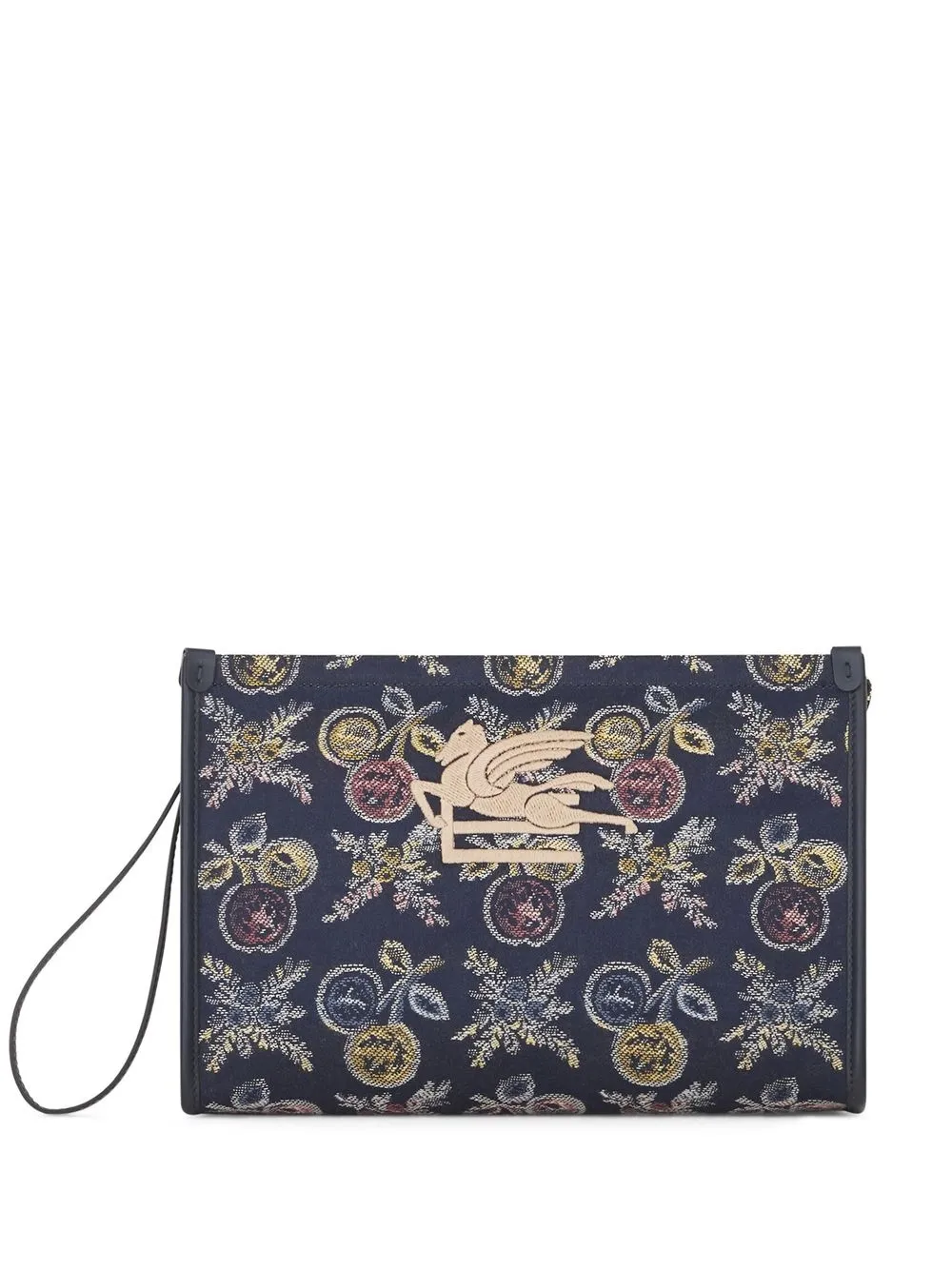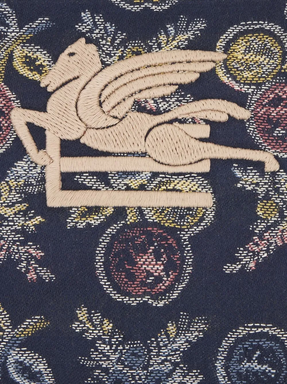 Blu navy, misto cotone, motivo jacquard, caratteristico motivo Pegaso, orlo con ribattitura a contrasto, cinturino da polso rimovibile, chiusura superiore con zip e tasca interna a soffietto.