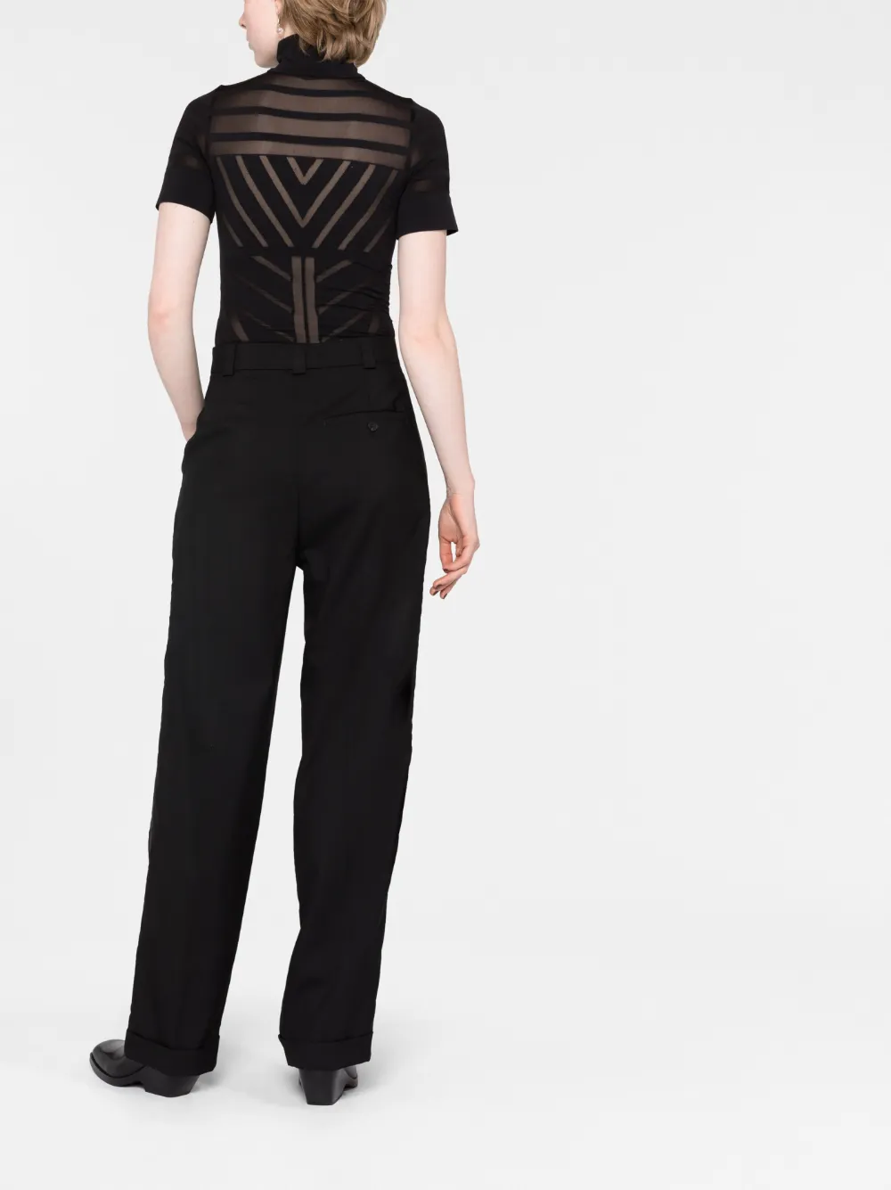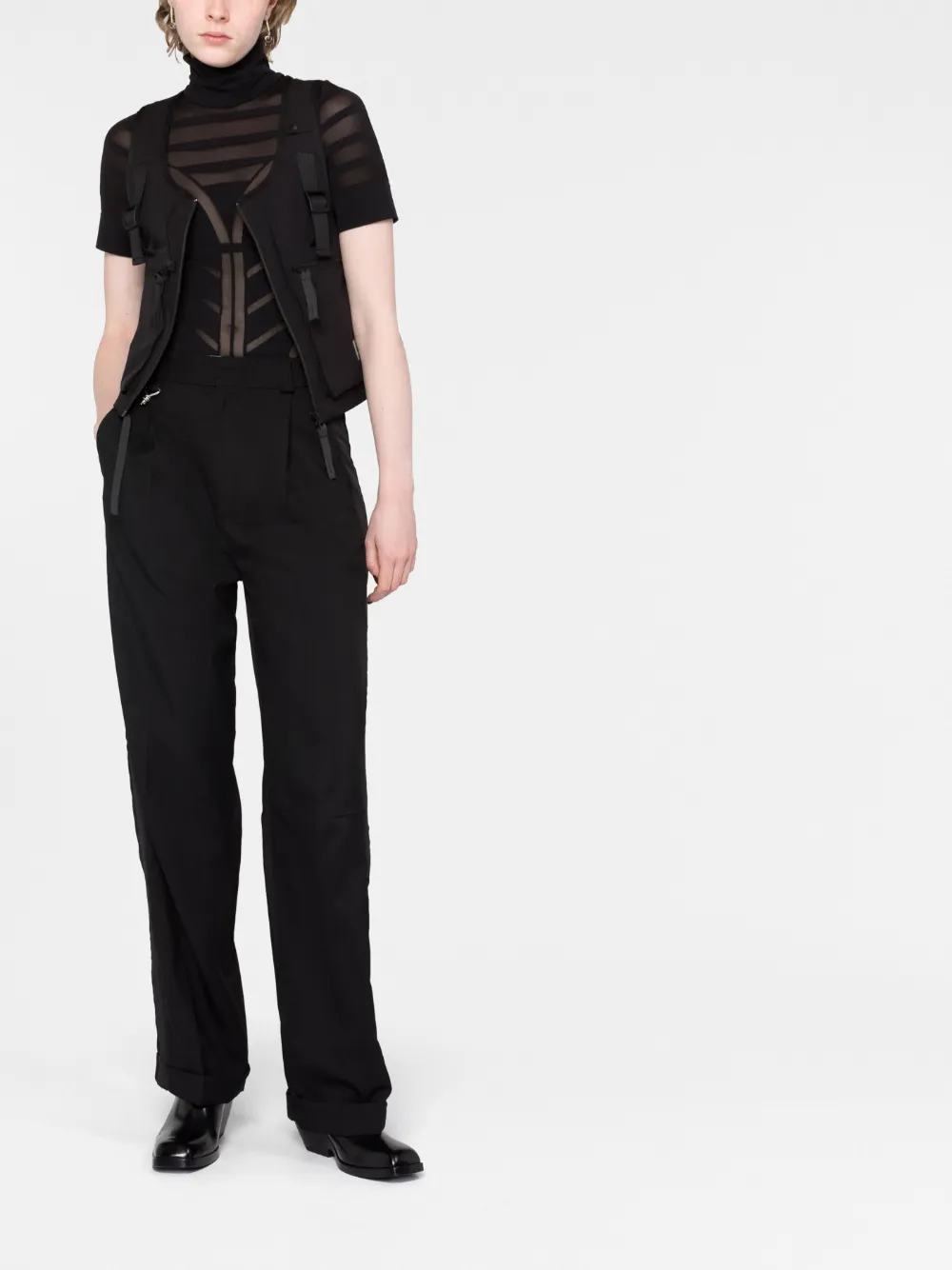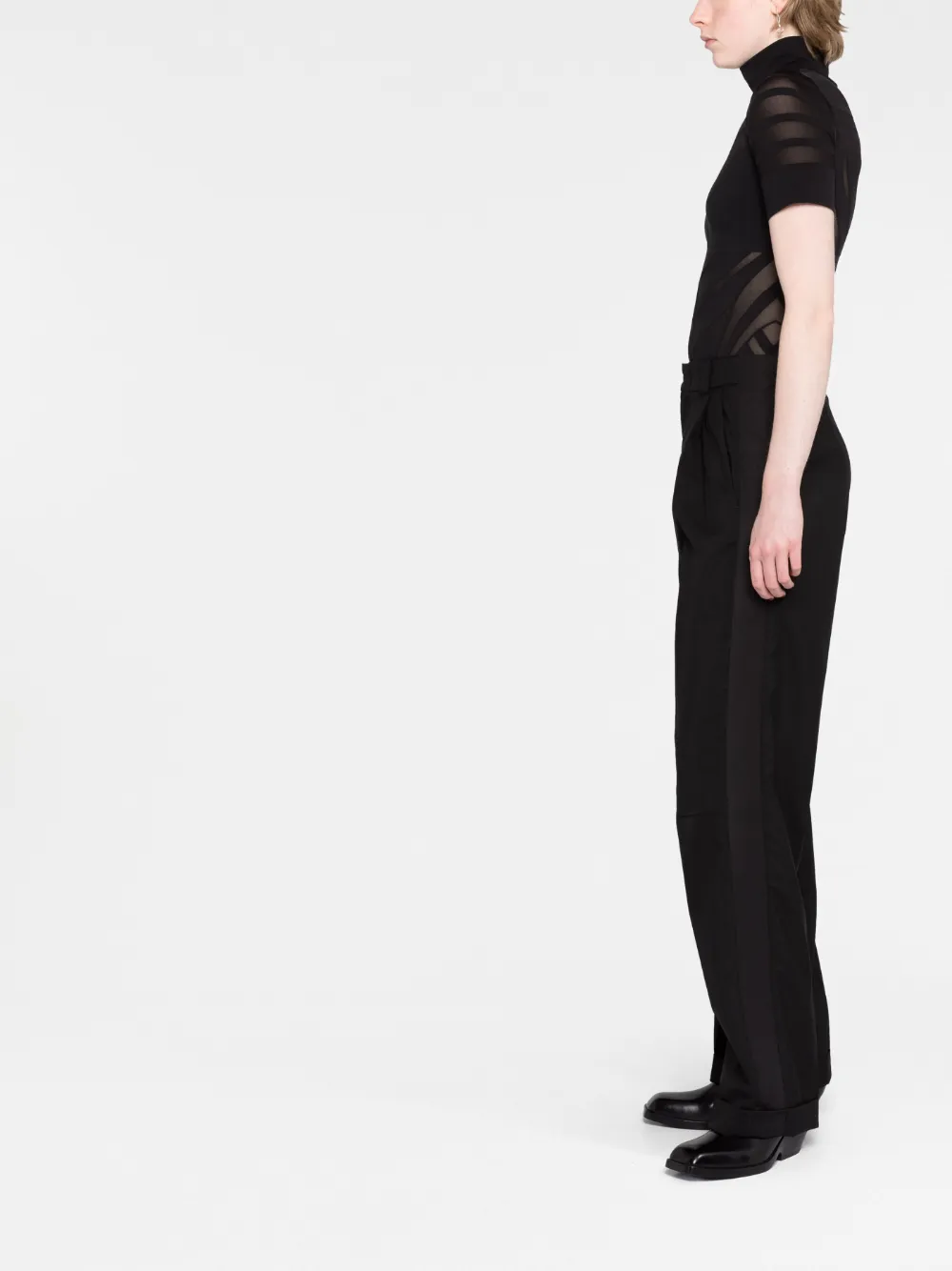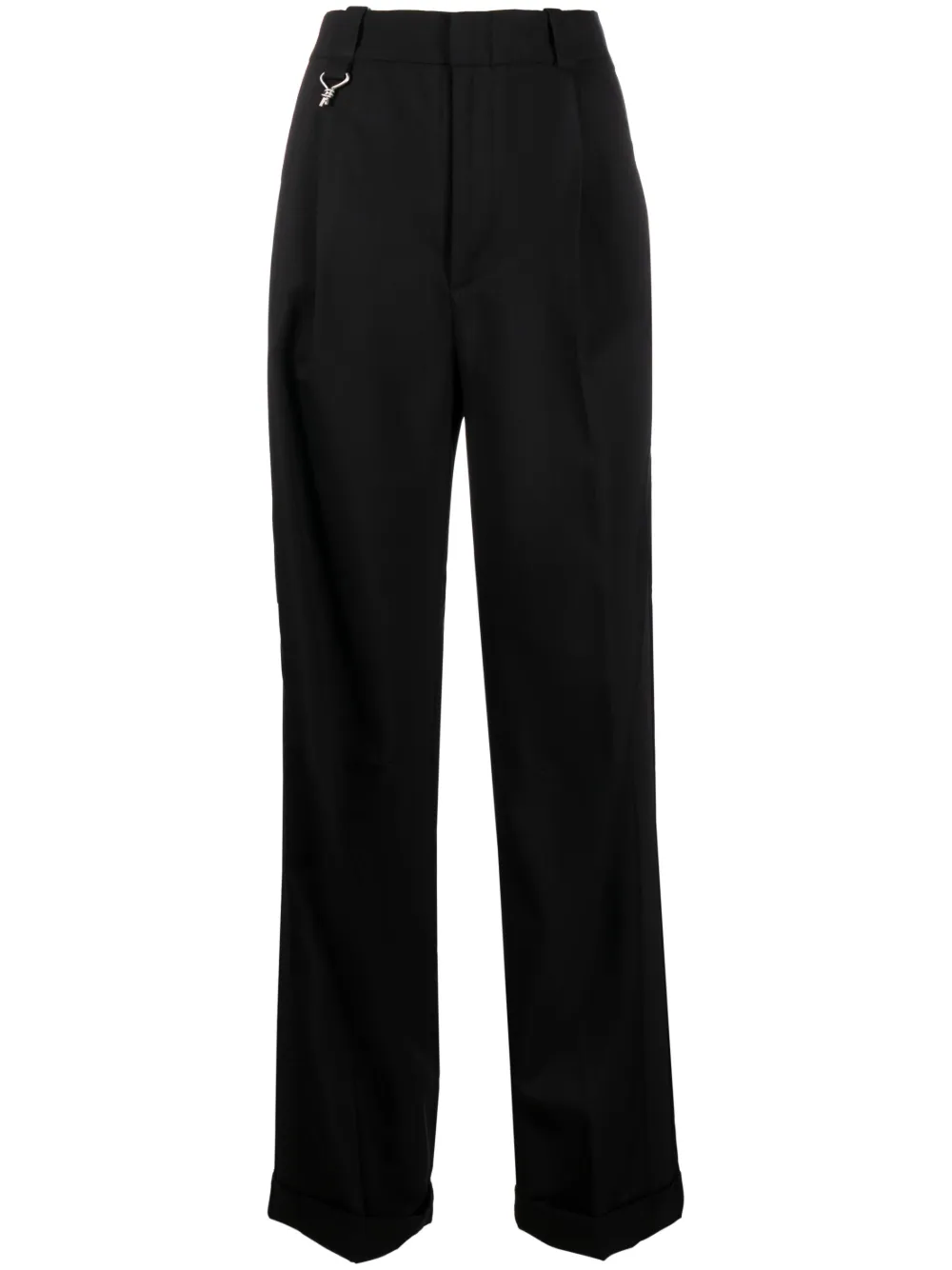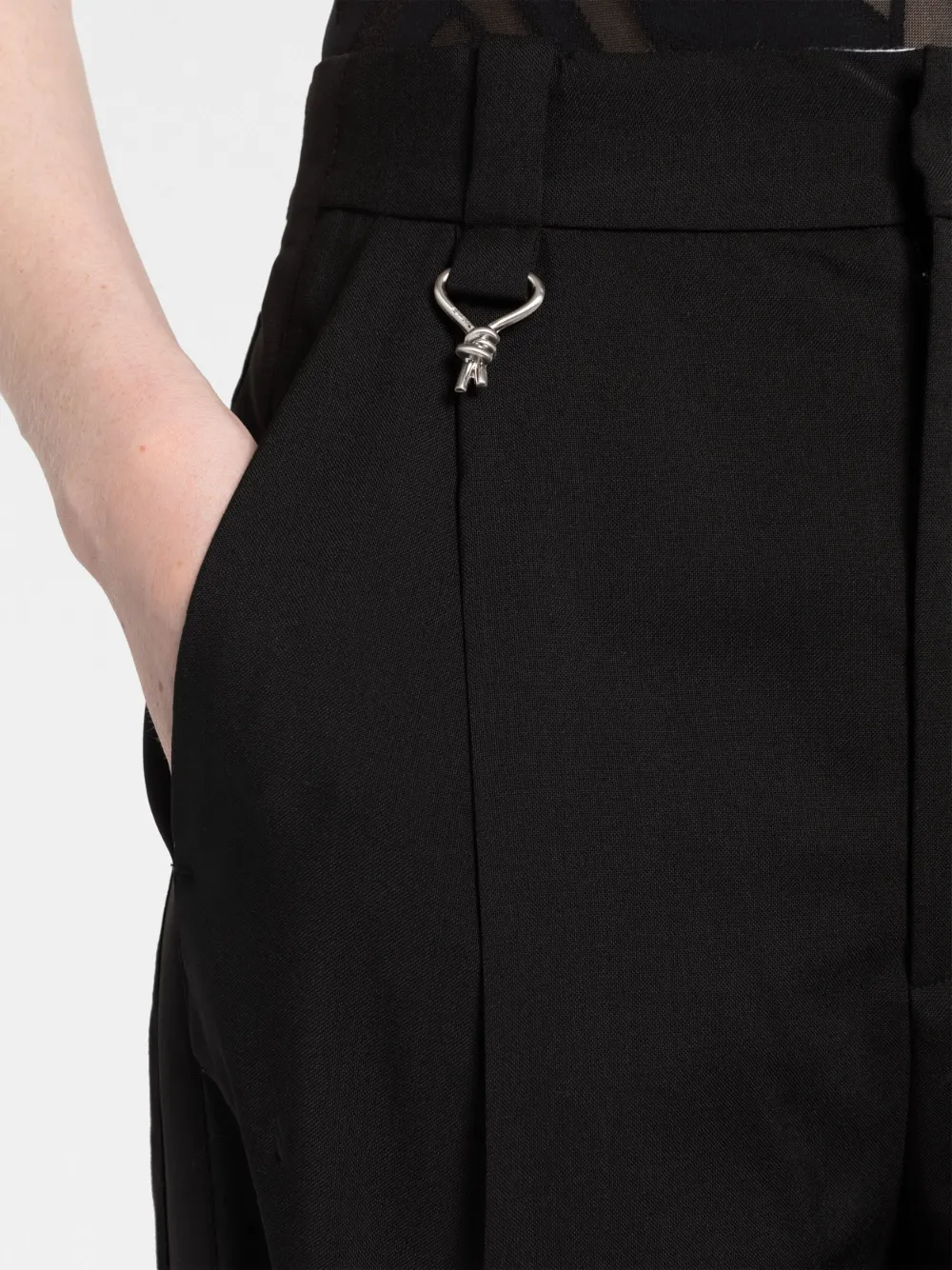 Orlo con risvolto, chiusura frontale nascosta, due tasche con inserti e due tasche posteriori a filetto.