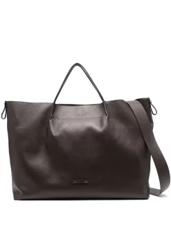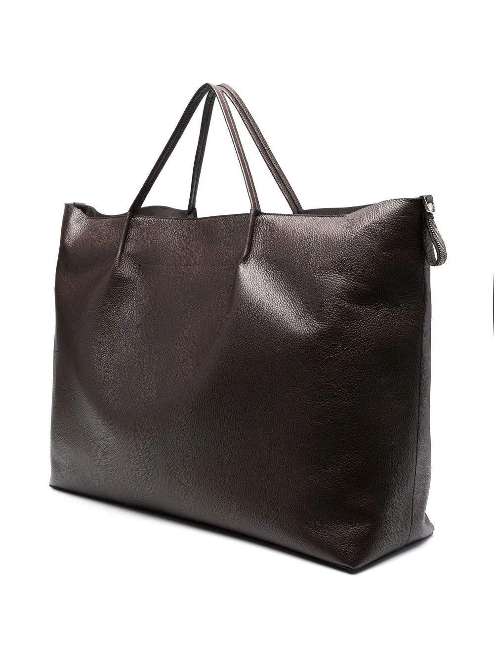 Caffè, cuoio, trama zigrinata, chiusura magnetica nascosta, due manici, scomparto unico e tasca interna con zip.