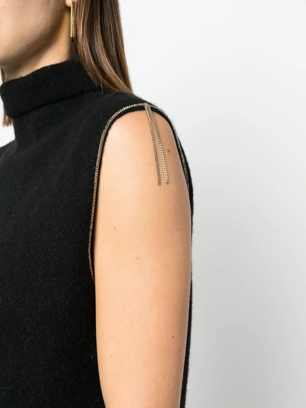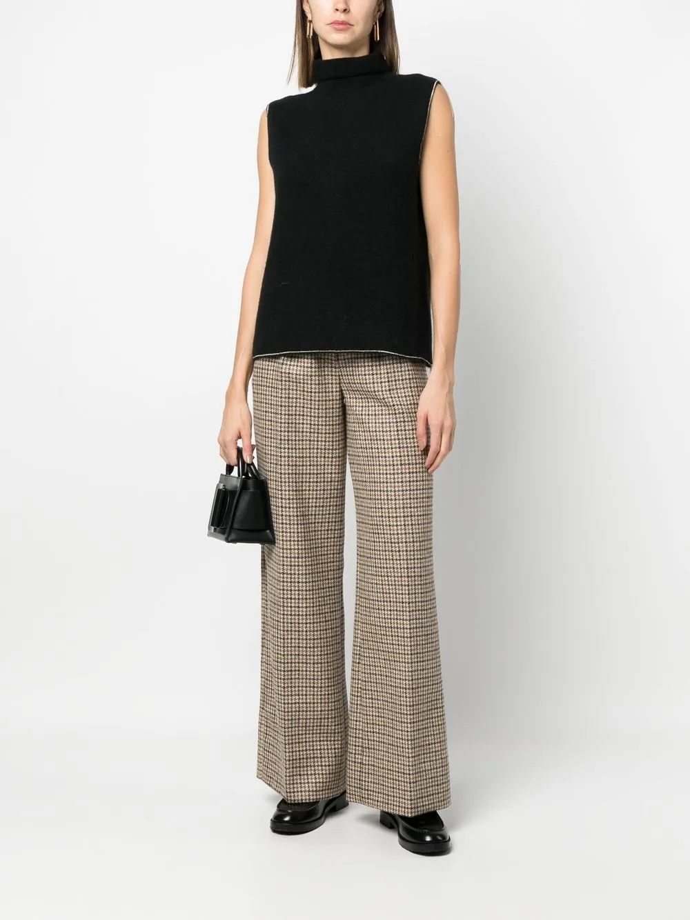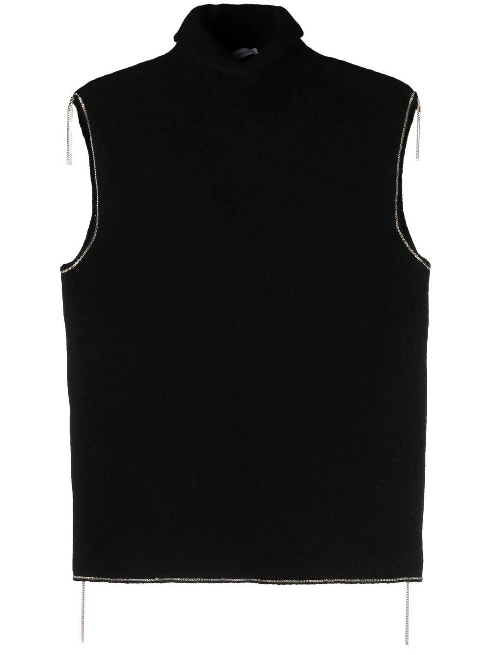 Bordo a contrasto, collo alto, senza maniche e orlo dritto.