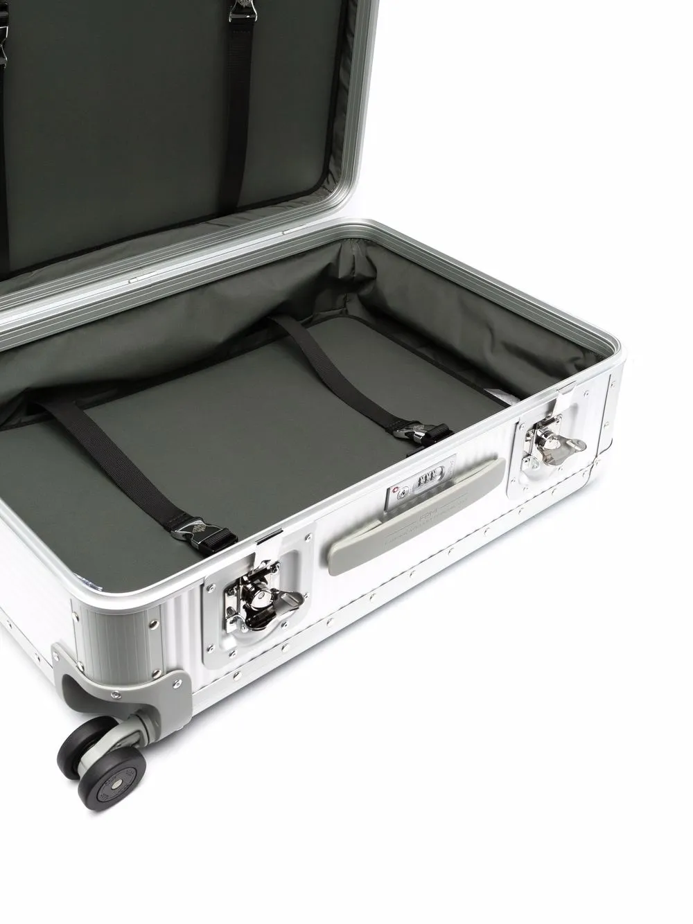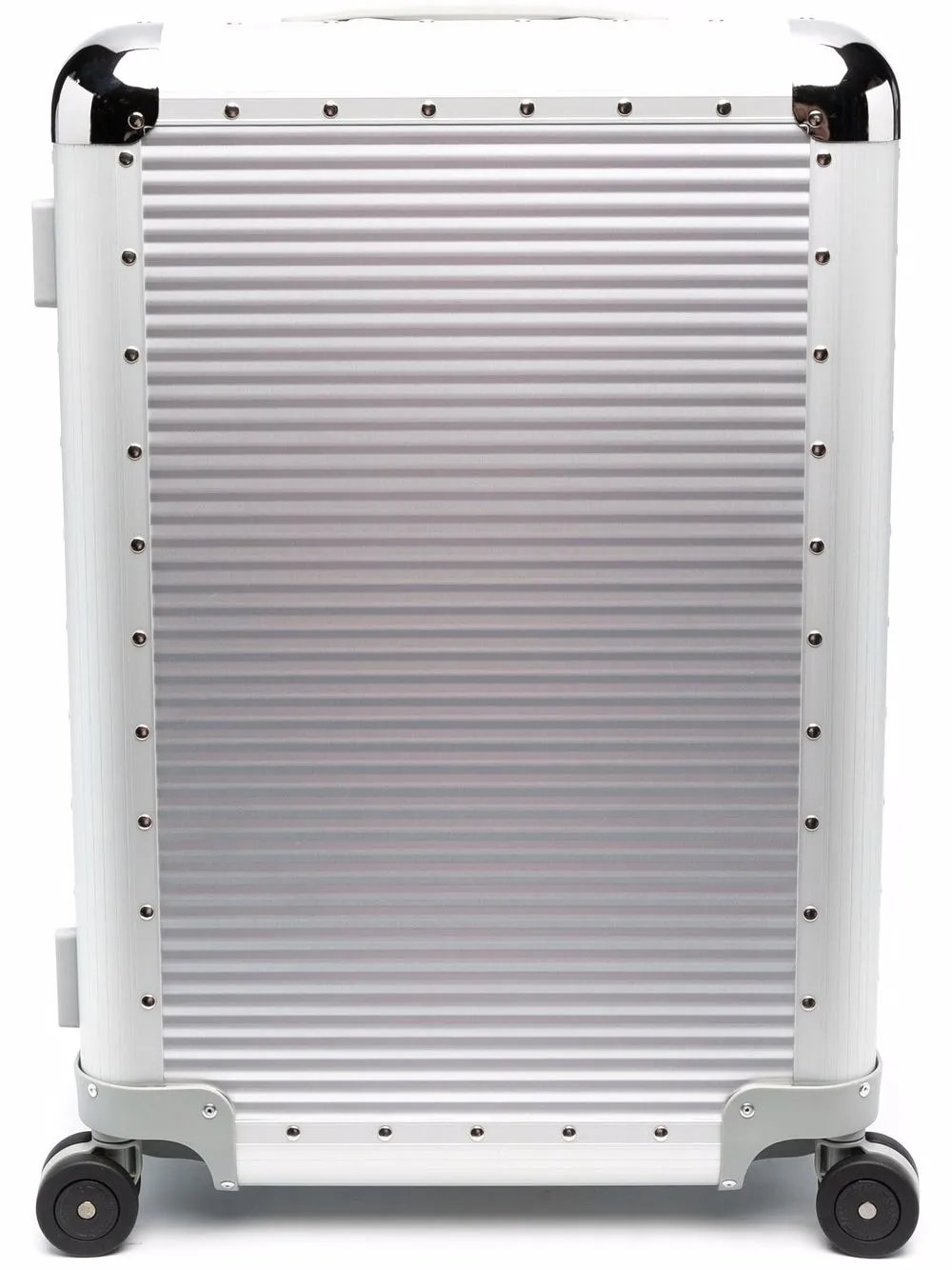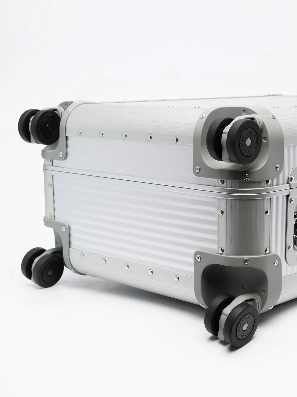 Manico piatto, chiusura con fermaglio e quattro ruote.