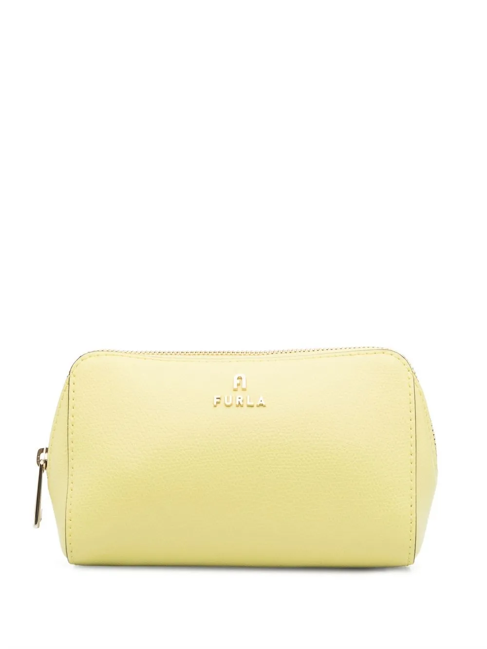 Giallo, logo in lettere color oro, chiusura superiore con zip, scomparto unico e applicazione interna con logo.