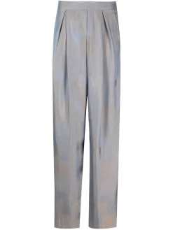 Blu chiaro, marrone chiaro, stampa patchwork, design a palazzo, due tasche frontali a marsupio e orlo dritto.