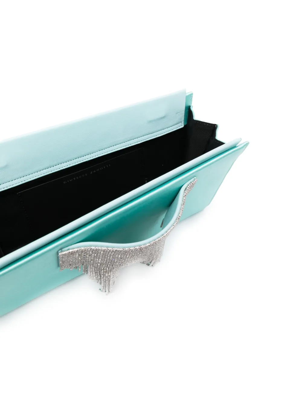 Blu acquamarina, finitura satinata, modello a busta, chiusura magnetica, scomparto unico e decorazione in cristalli.