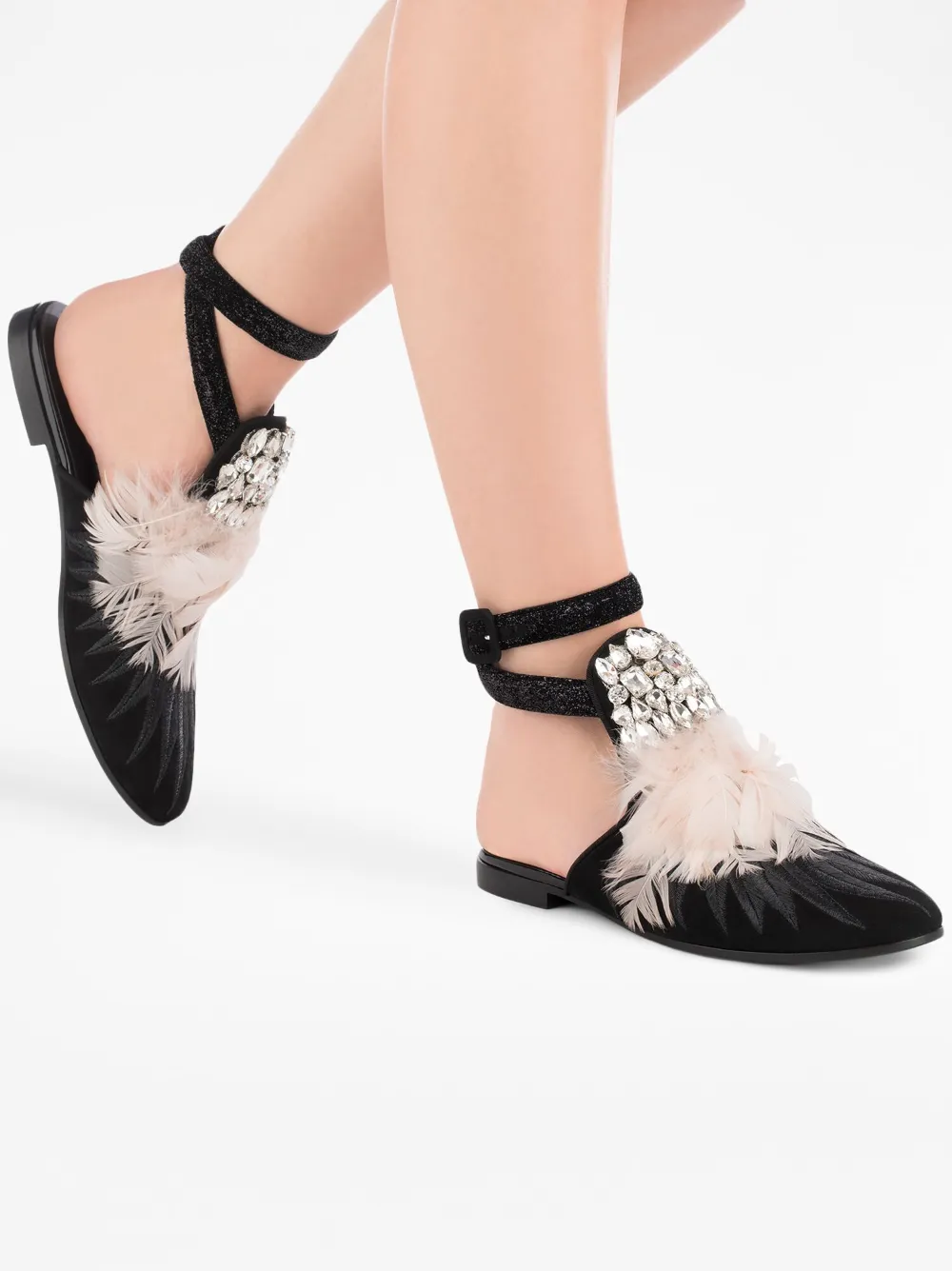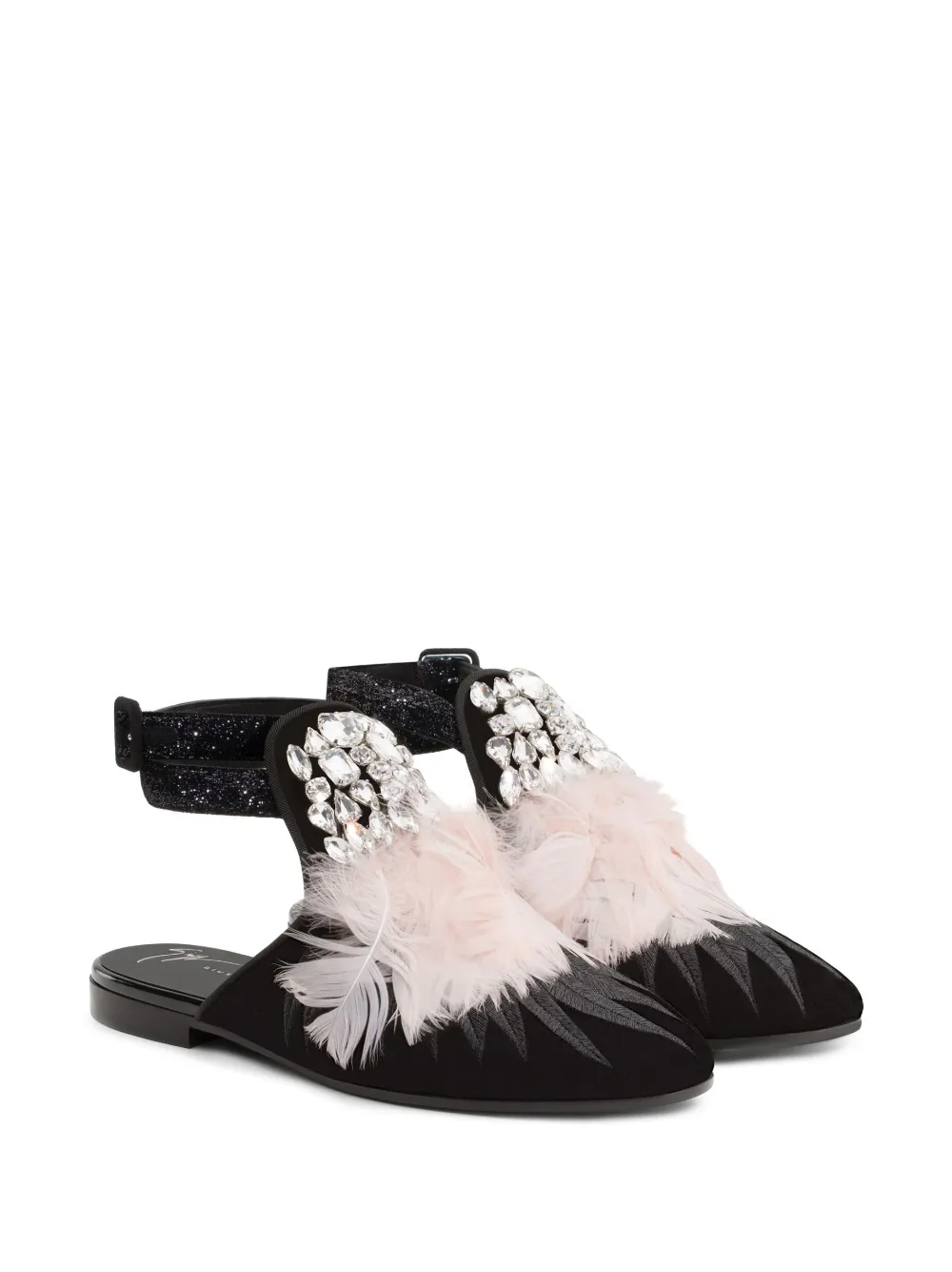 Nero intenso, multicolore, pelle di vitello, velluto, design a giro, decorazione in cristalli, dettaglio con piume, soletta con logo, punta smussata, chiusura alla caviglia con fibbia e suola piatta in pelle.