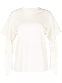 Girocollo, maniche corte, maniche con ricamo e design a più strati. Materiale: cotone.