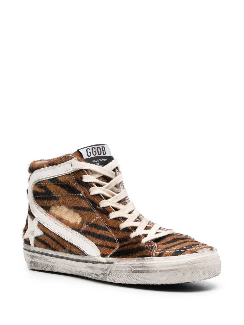 Marrone, pelle di vitello, motivo animalier, caratteristica applicazione laterale a stella, dettaglio laterale a righe, punta tonda, chiusura frontale con lacci, applicazione con logo sulla linguetta, altezza alla caviglia, soletta con logo e suola in gomma.
