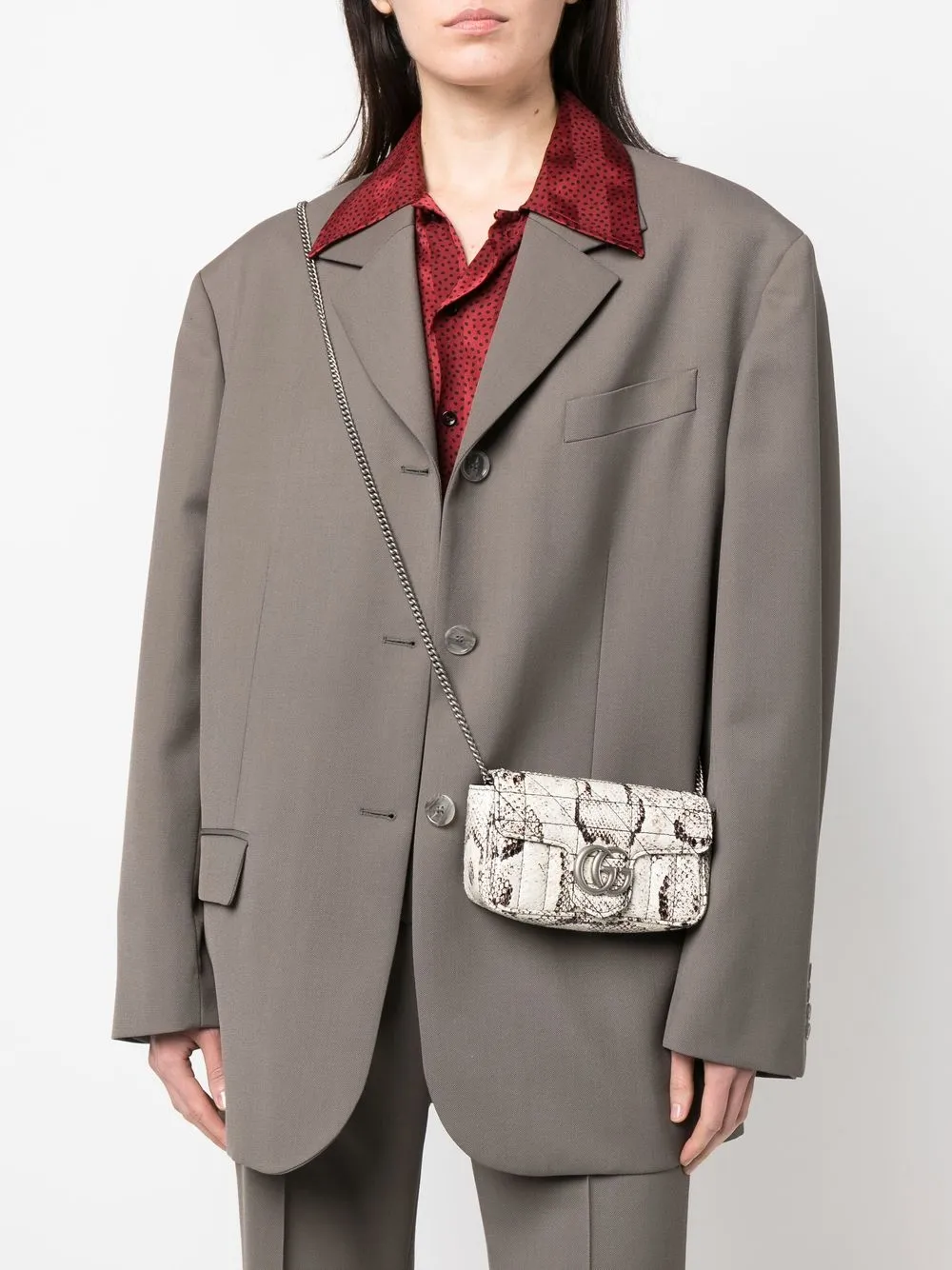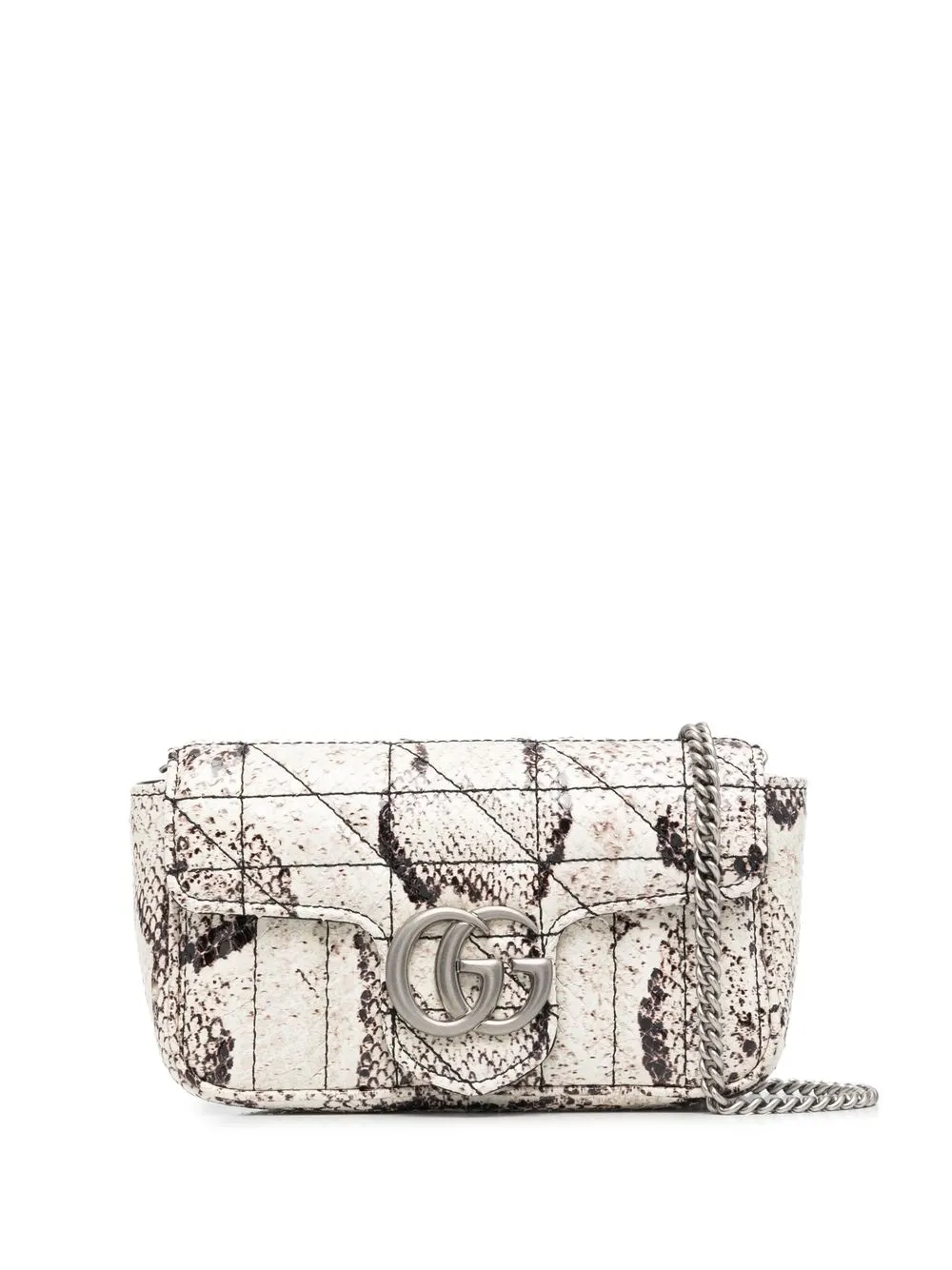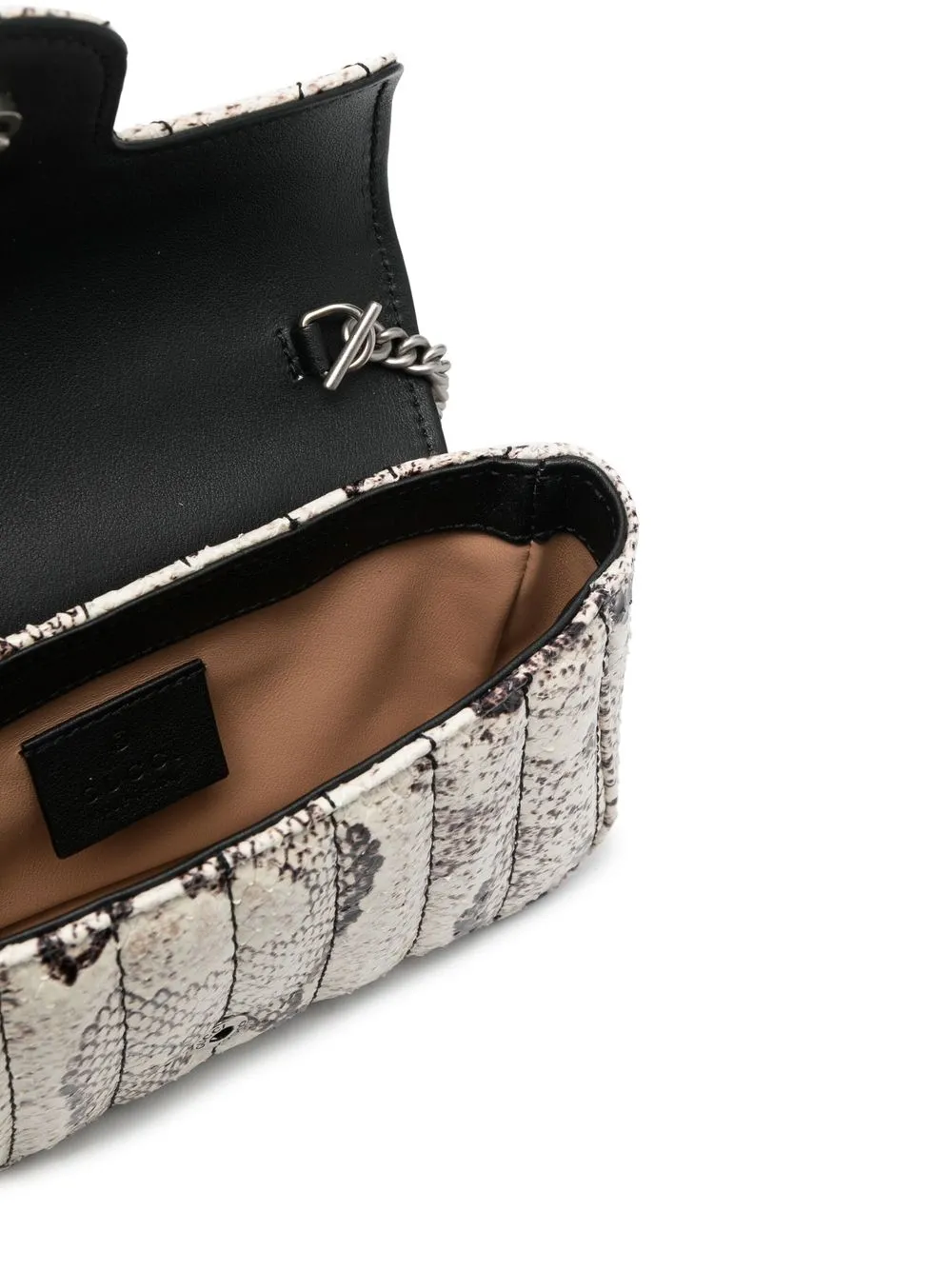 Tonalità bianco avorio, multicolore, pelle di vitello, stampa pitonata, parte superiore ripiegata con bottoni a pressione, tela con motivo GG, dettagli color argento, tracolla rimovibile con catena e applicazione interna con logo.