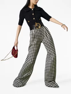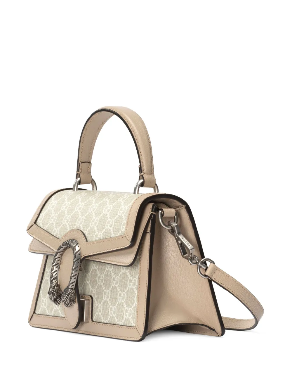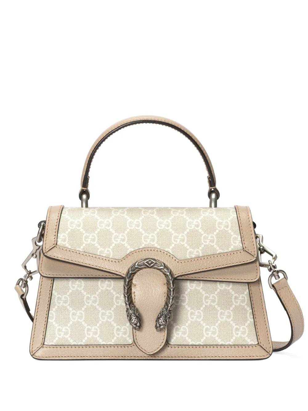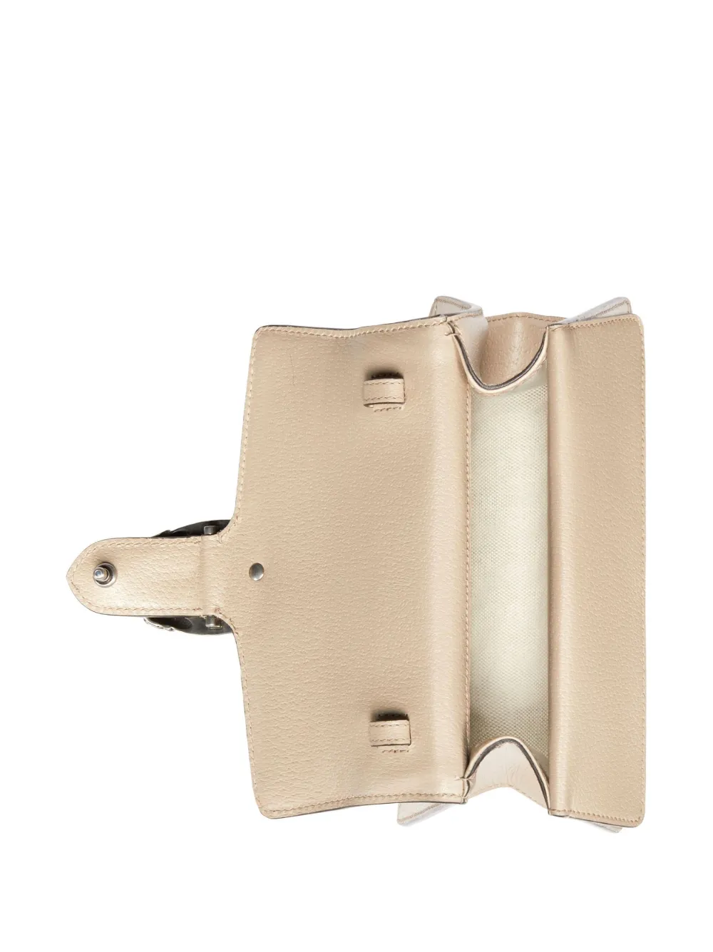Beige chiaro, bianco opaco, pelle, tela con motivo GG, placca con logo, manico singolo, tracolla regolabile e rimovibile, parte superiore ripiegata con bottoni a pressione e scomparto unico.