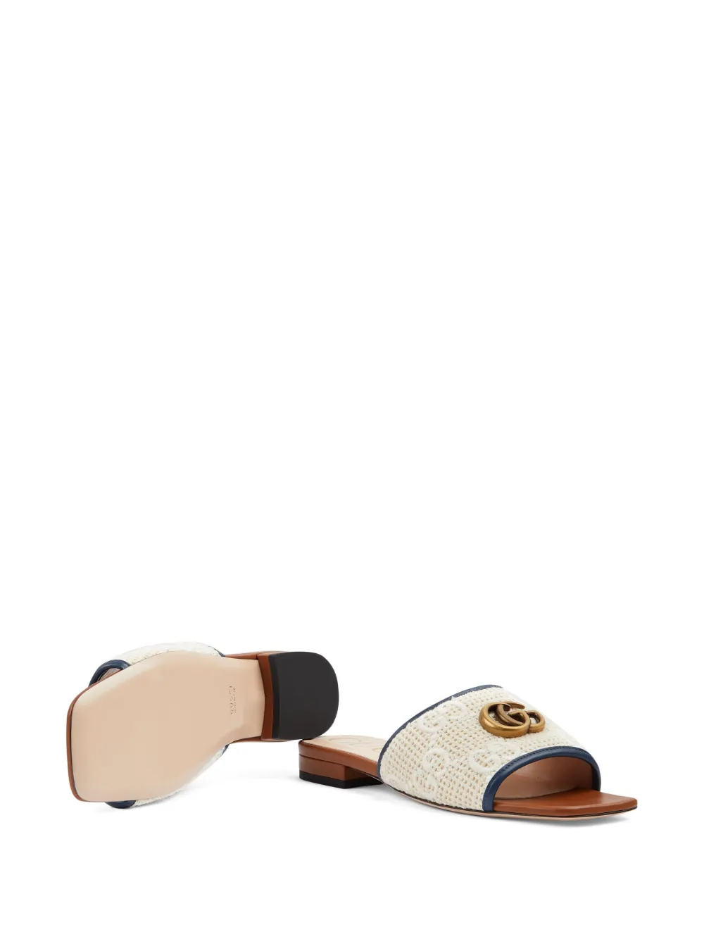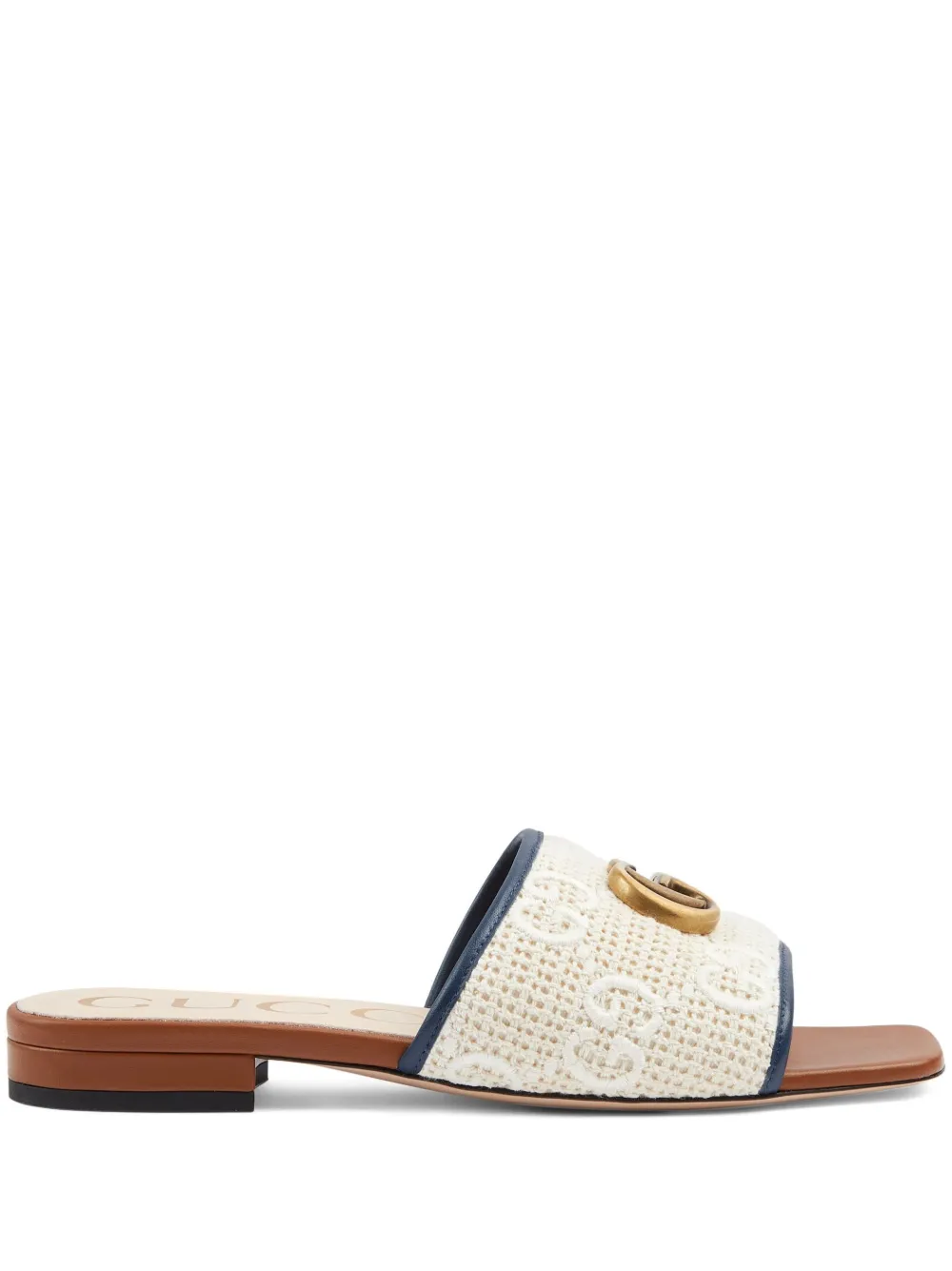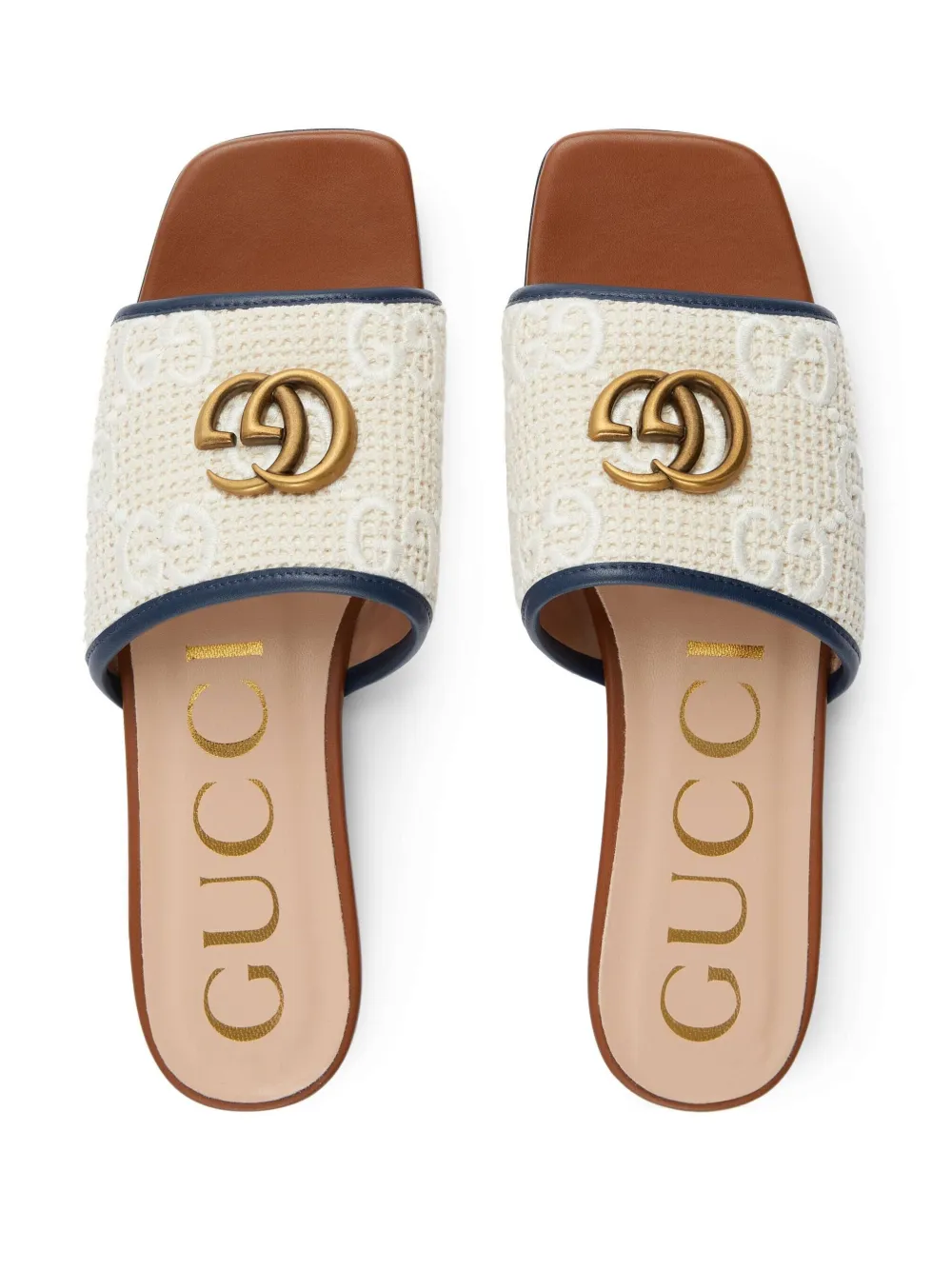 Écru, bianco, blu navy, tela/pelle, caratteristico quadrante con stampa GG, soletta in pelle con logo, design slip-on e tacco largo basso.