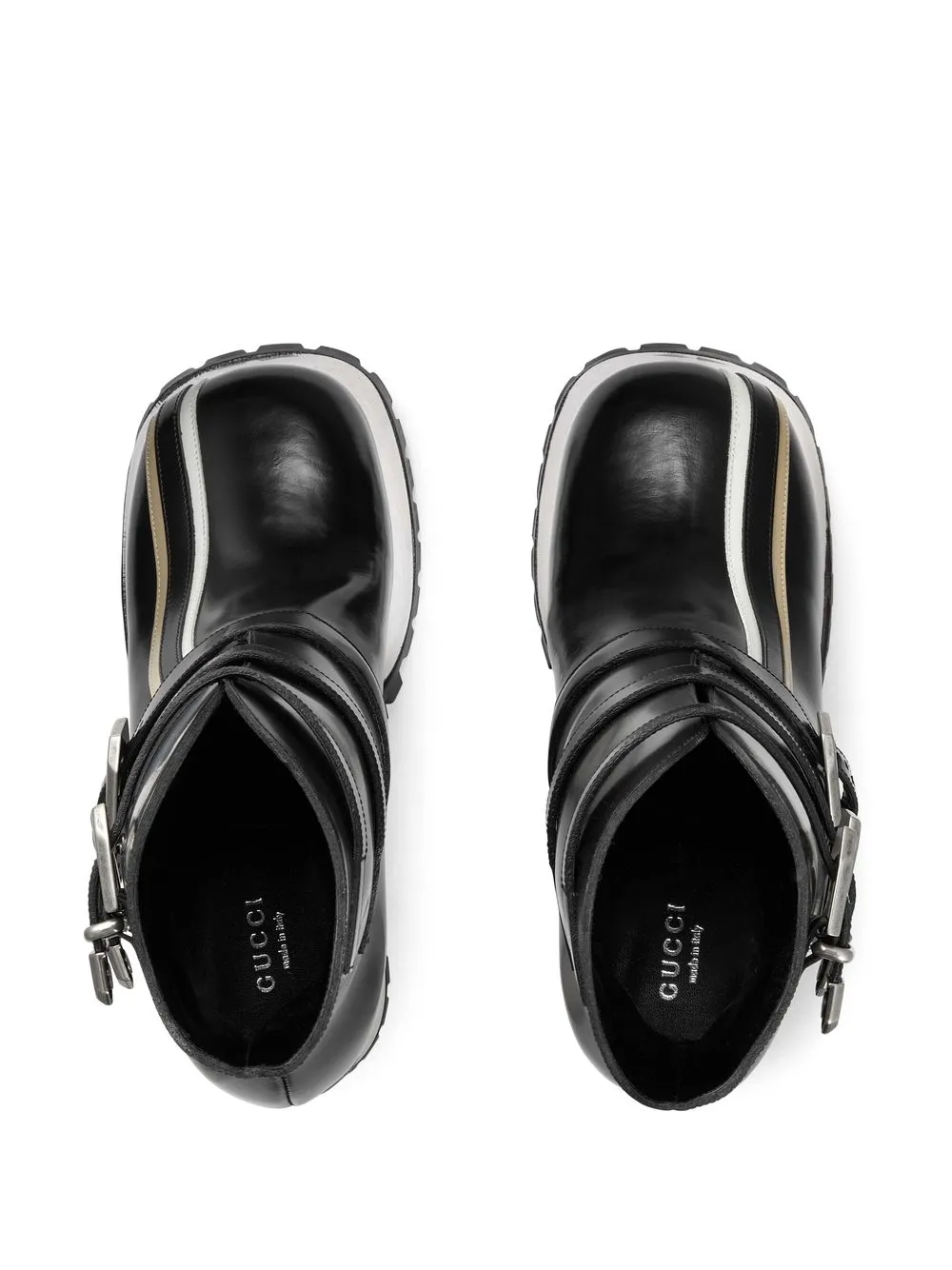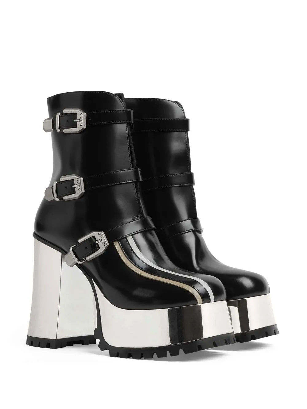 Nero, pelle, dettagli color argento, chiusura laterale con fibbia, altezza alla caviglia, punta quadrata, plateau e tacco largo alto.