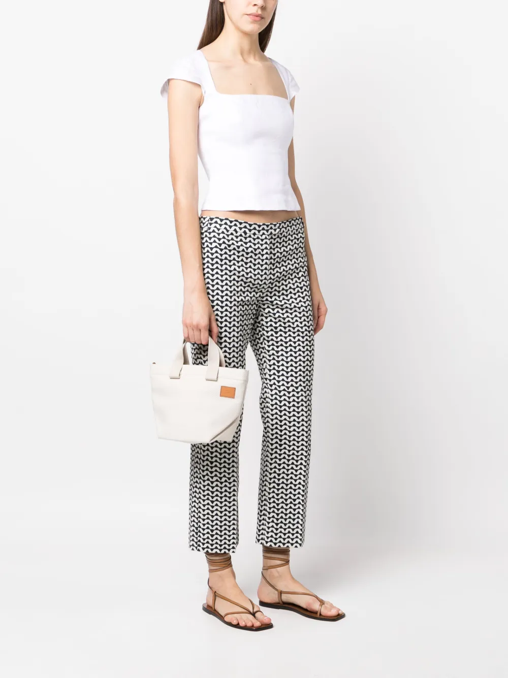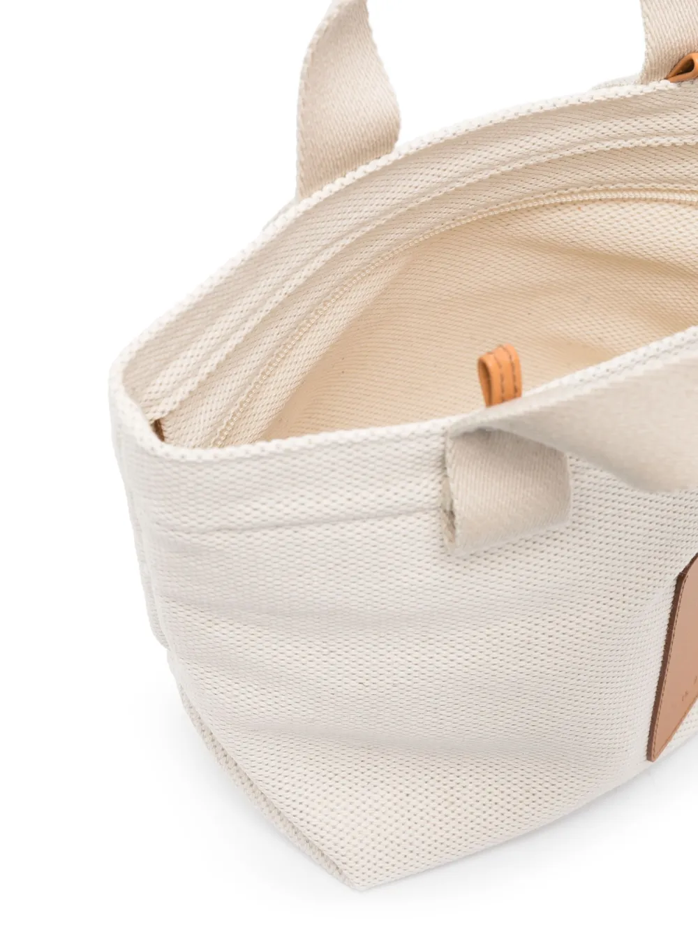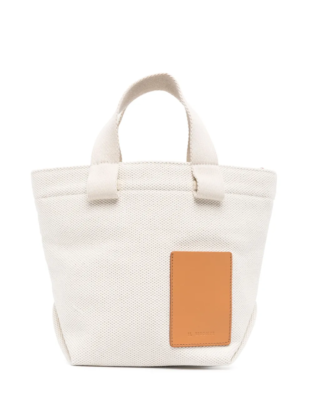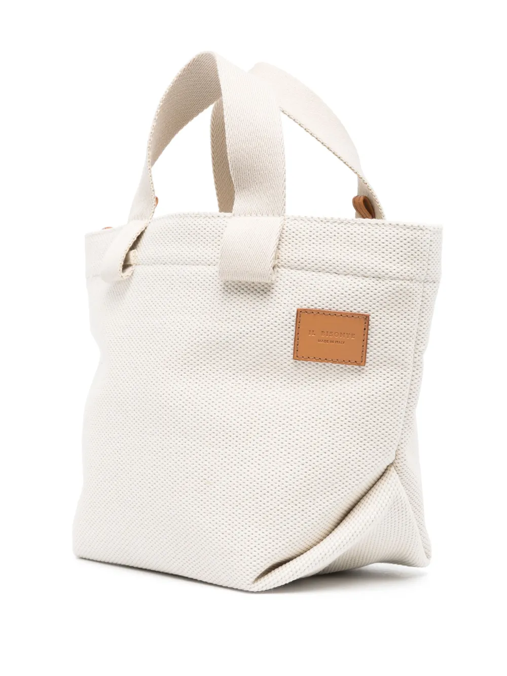 Écru, trama piquet, applicazione frontale con logo, manici piatti, chiusura superiore con zip e scomparto unico.