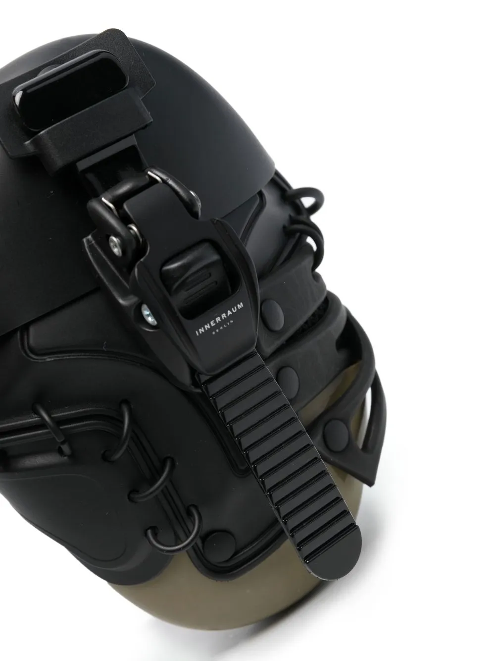 Cachi, nero intenso, applicazione tono su tono, tracolla regolabile, chiusura con fibbia e scomparto unico.