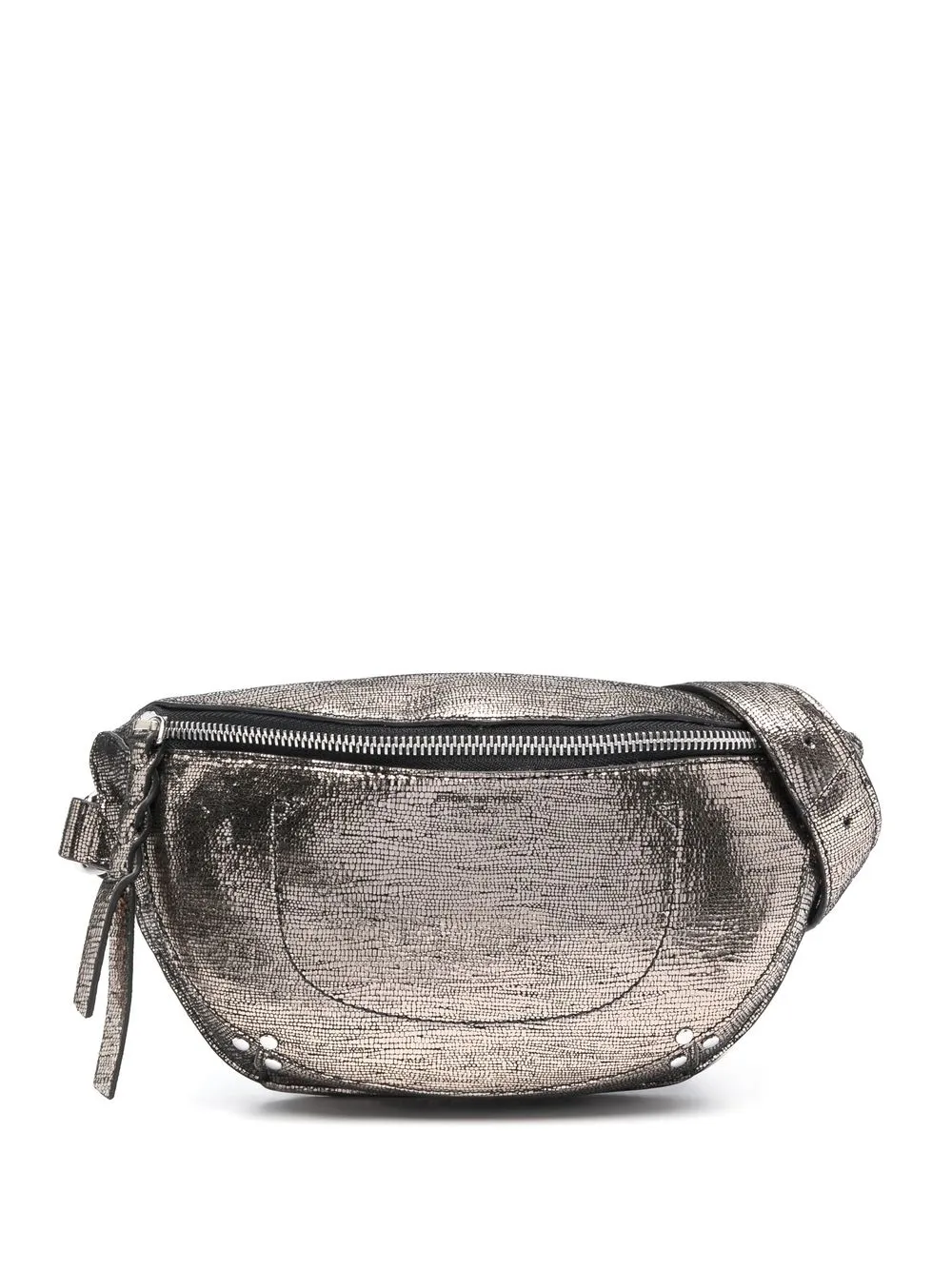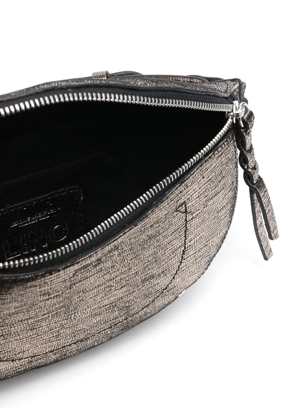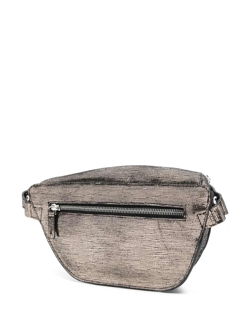 Dettagli color argento, effetto lamé, effetto pelle di lucertola, logo goffrato nella parte anteriore, tasca posteriore con zip, tasca frontale con zip, scomparto unico e fascia in vita regolabile.