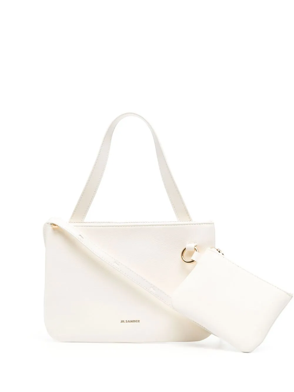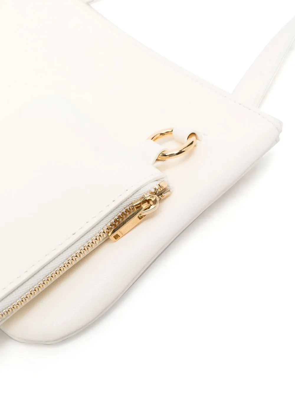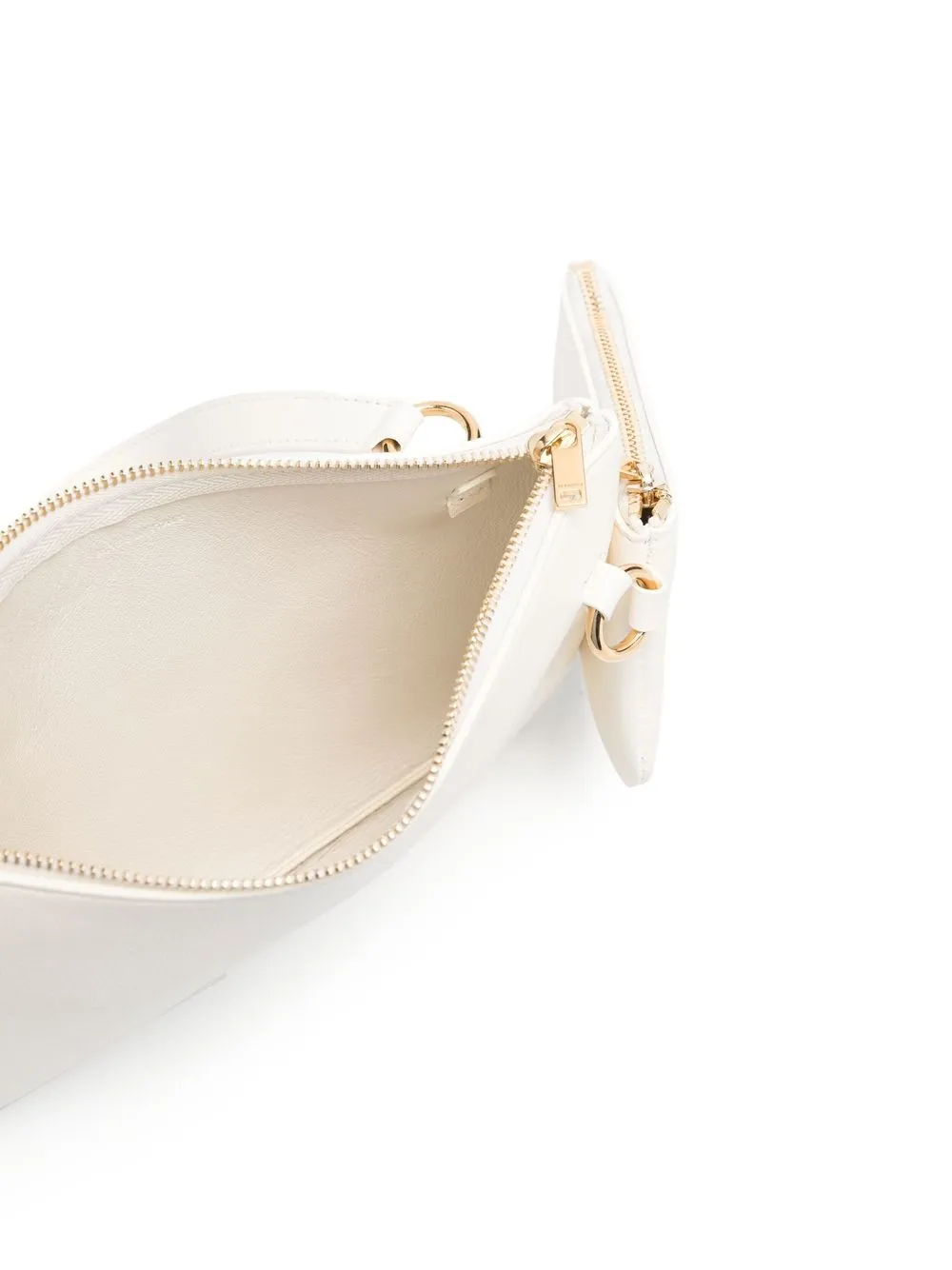 Bianco crema, pelle di vitello, logo in lettere color oro, manico singolo, pouch rimovibile, tracolla regolabile e rimovibile e scomparto unico.