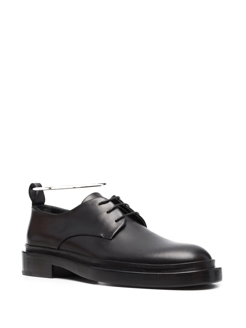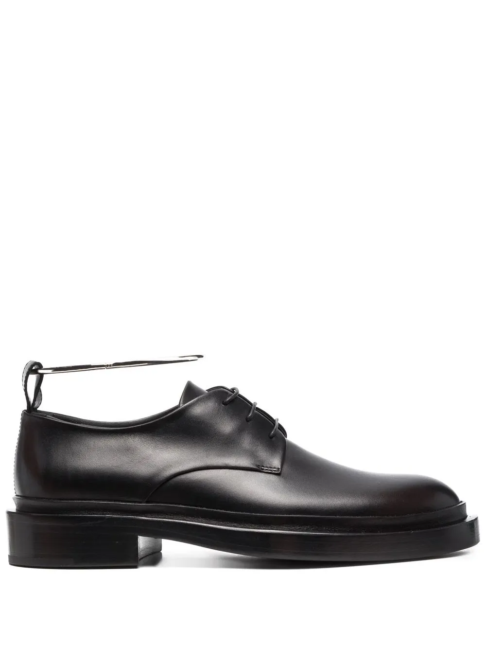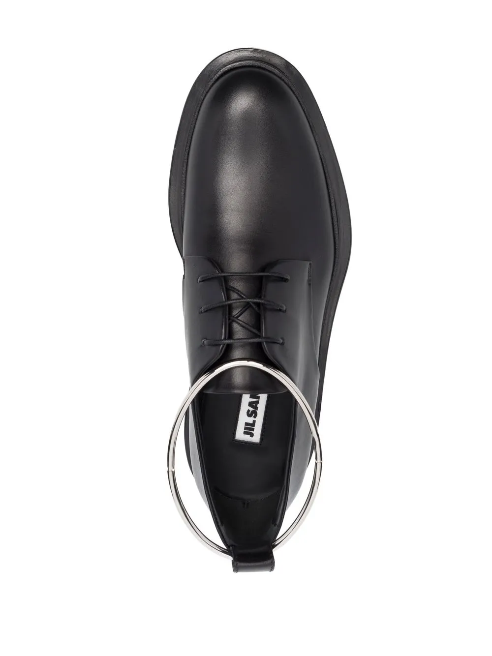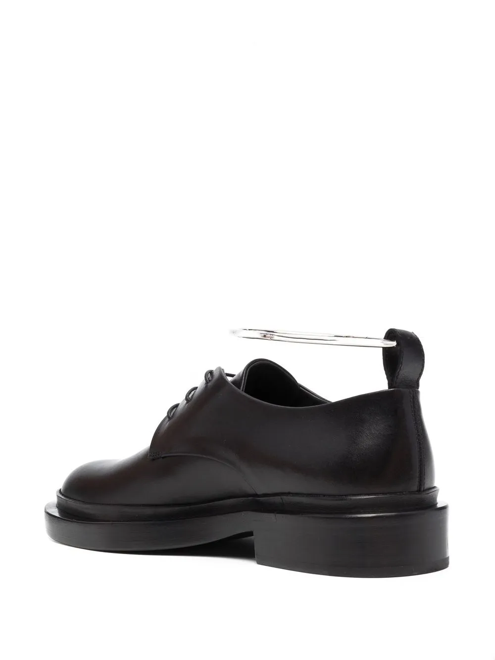 Nero intenso, cuoio, chiusura frontale con lacci, punta tonda, tacco basso e dettagli color argento.