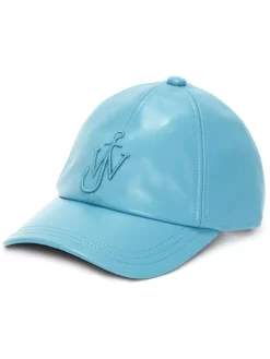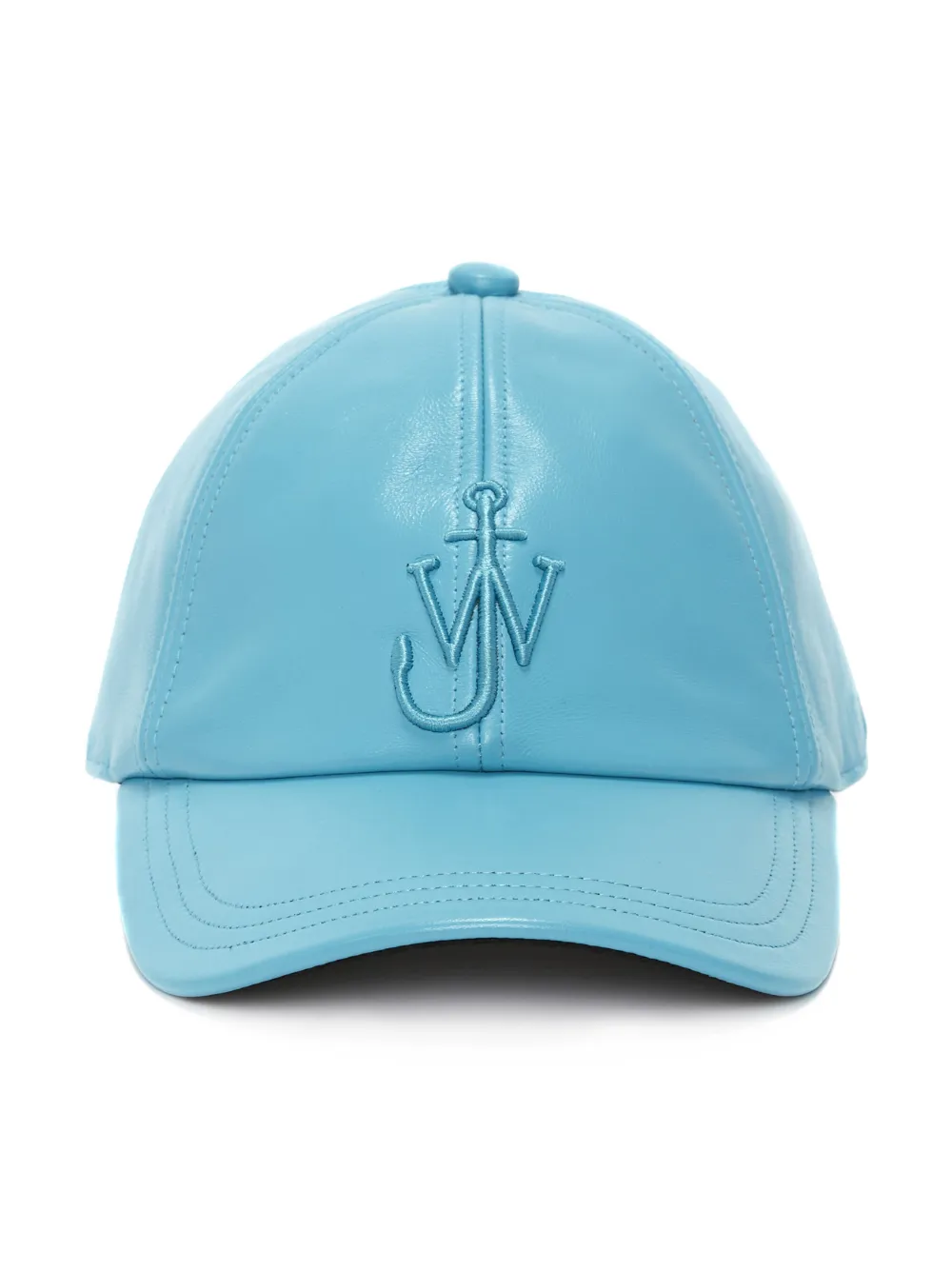 Turchese verde-azzurro, pelle di vitello, cuciture tono su tono, caratteristico logo con ancora JW-initials, ricamo con logo frontale, bottone rivestito in tessuto sulla corona, fascia con fibbia posteriore regolabile e tesa curva.