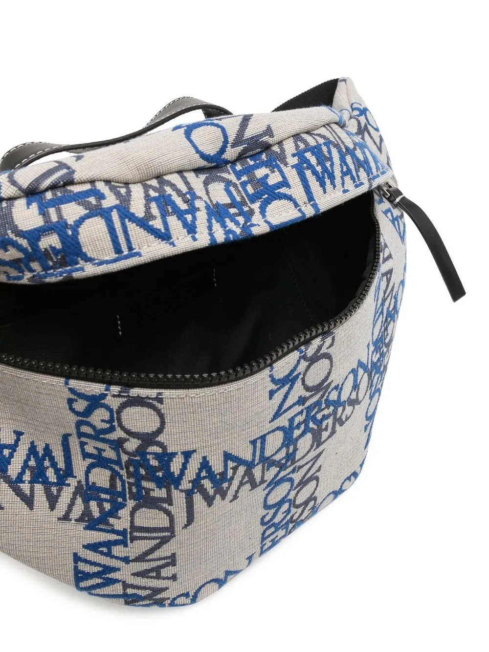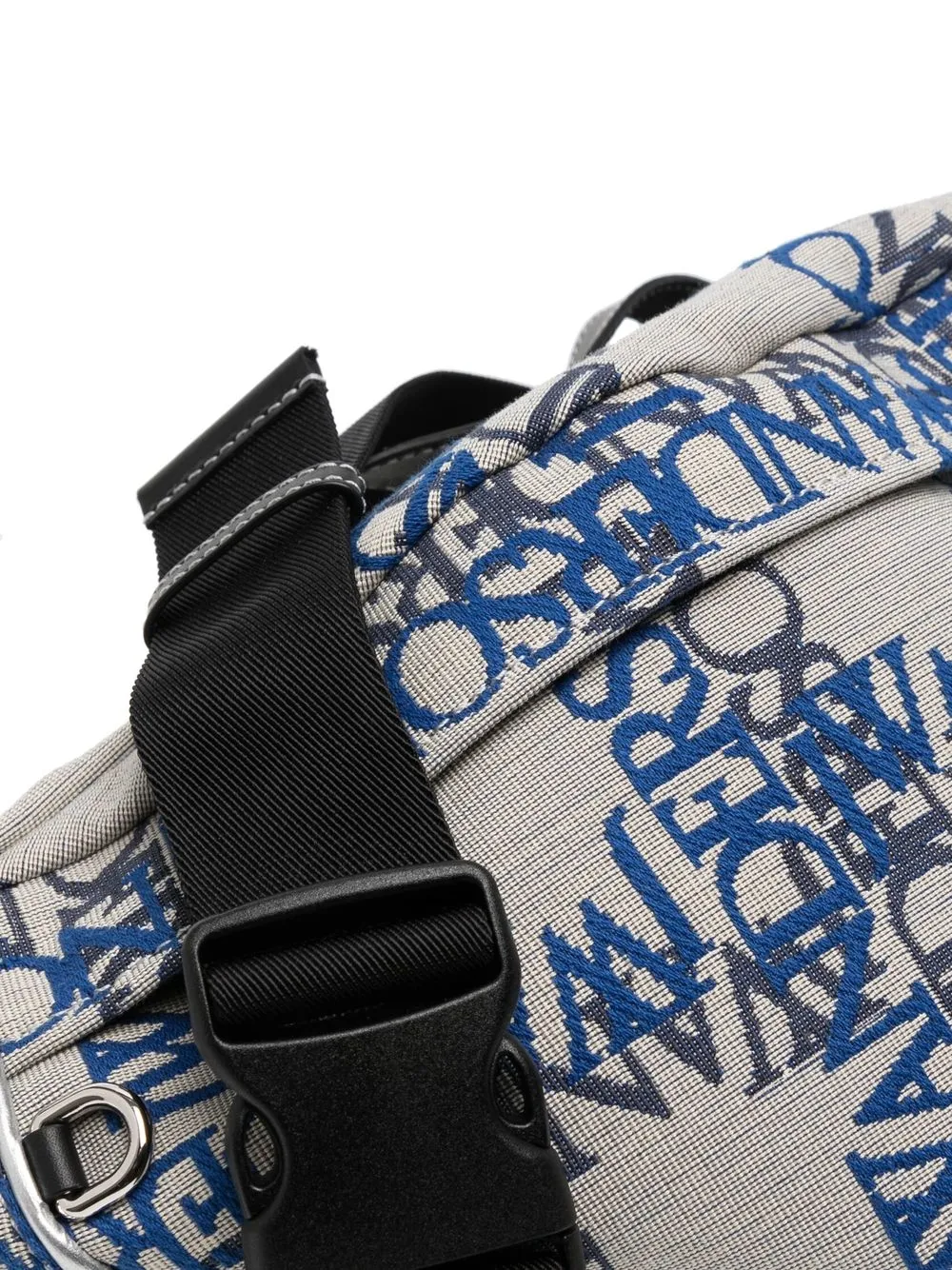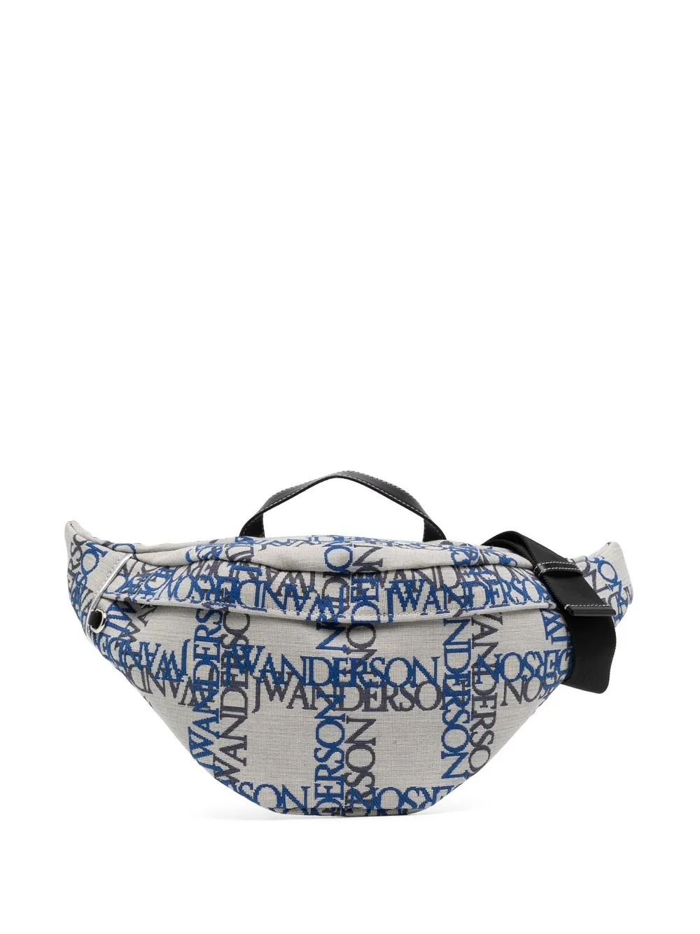 Bianco, blu chiaro, cotone, motivo jacquard con logo, chiusura frontale con zip, design con fascia singola e scomparto unico.