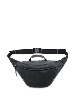 Nero, stampa con logo all-over, motivo a quadri, applicazione posteriore con logo, chiusura superiore con zip, fascia in vita regolabile, manico tondo e scomparto unico.