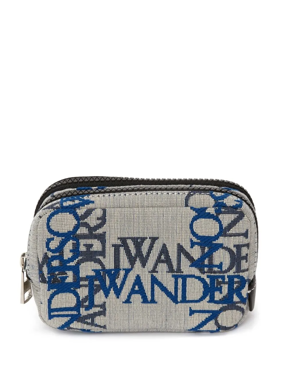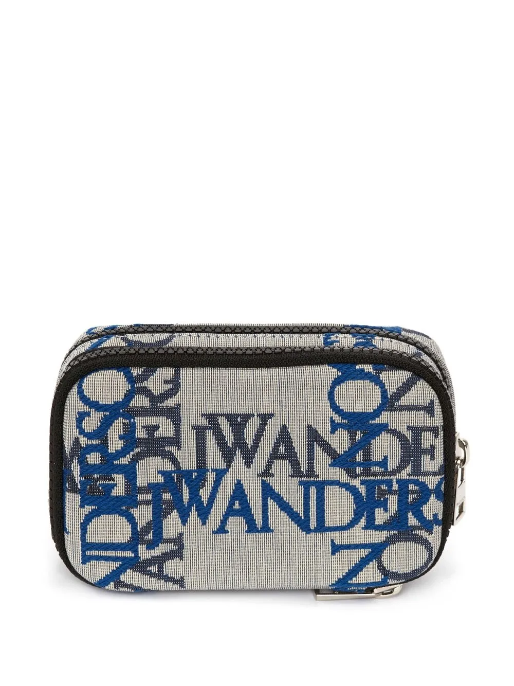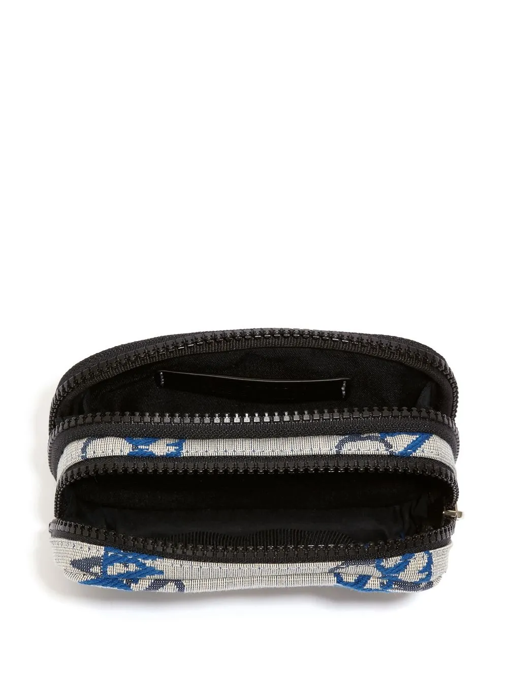 Bianco opaco, blu, misto cotone, motivo jacquard, dettagli color oro, chiusura con zip a giro, scomparto unico e design rettangolare.
