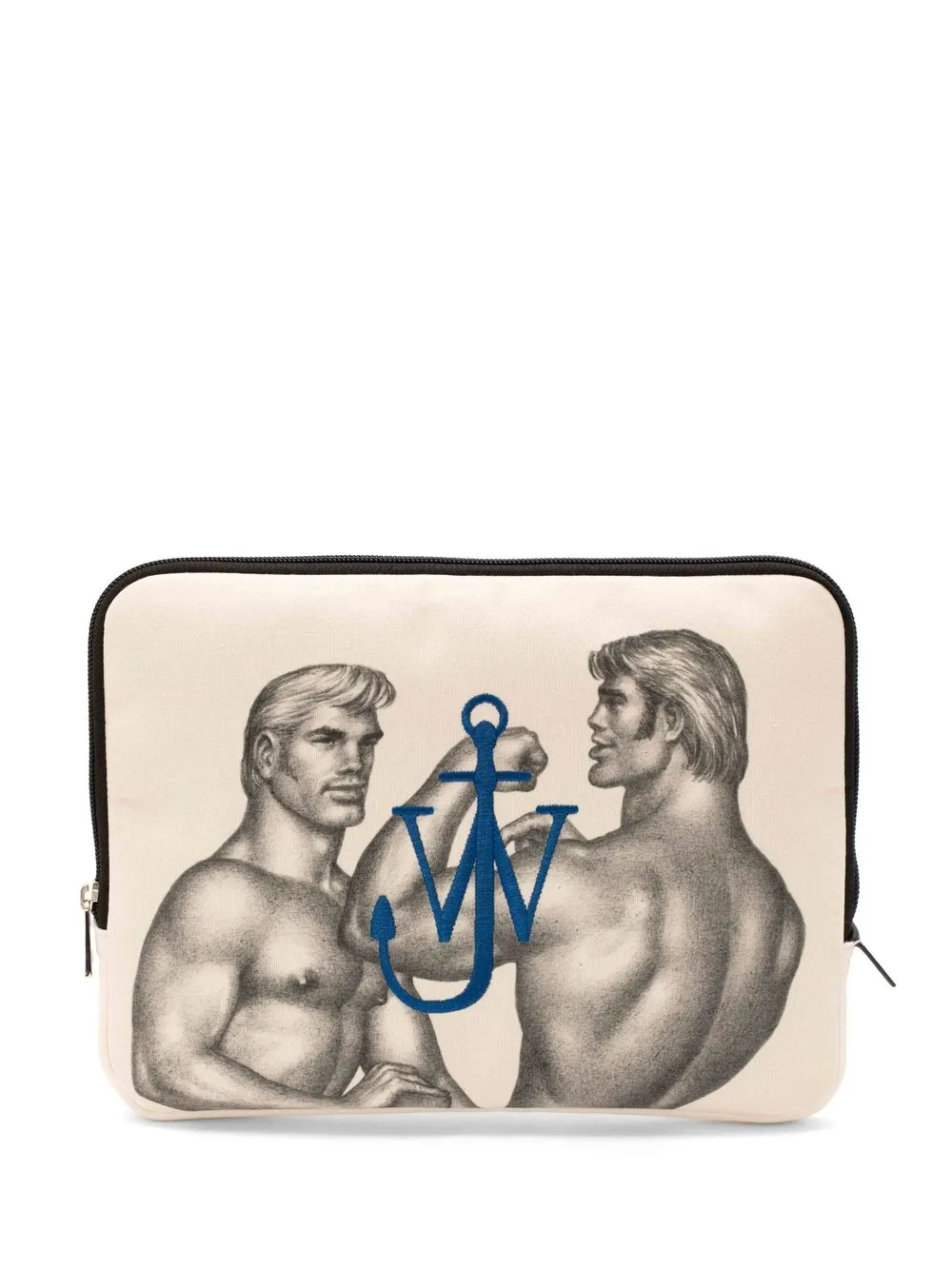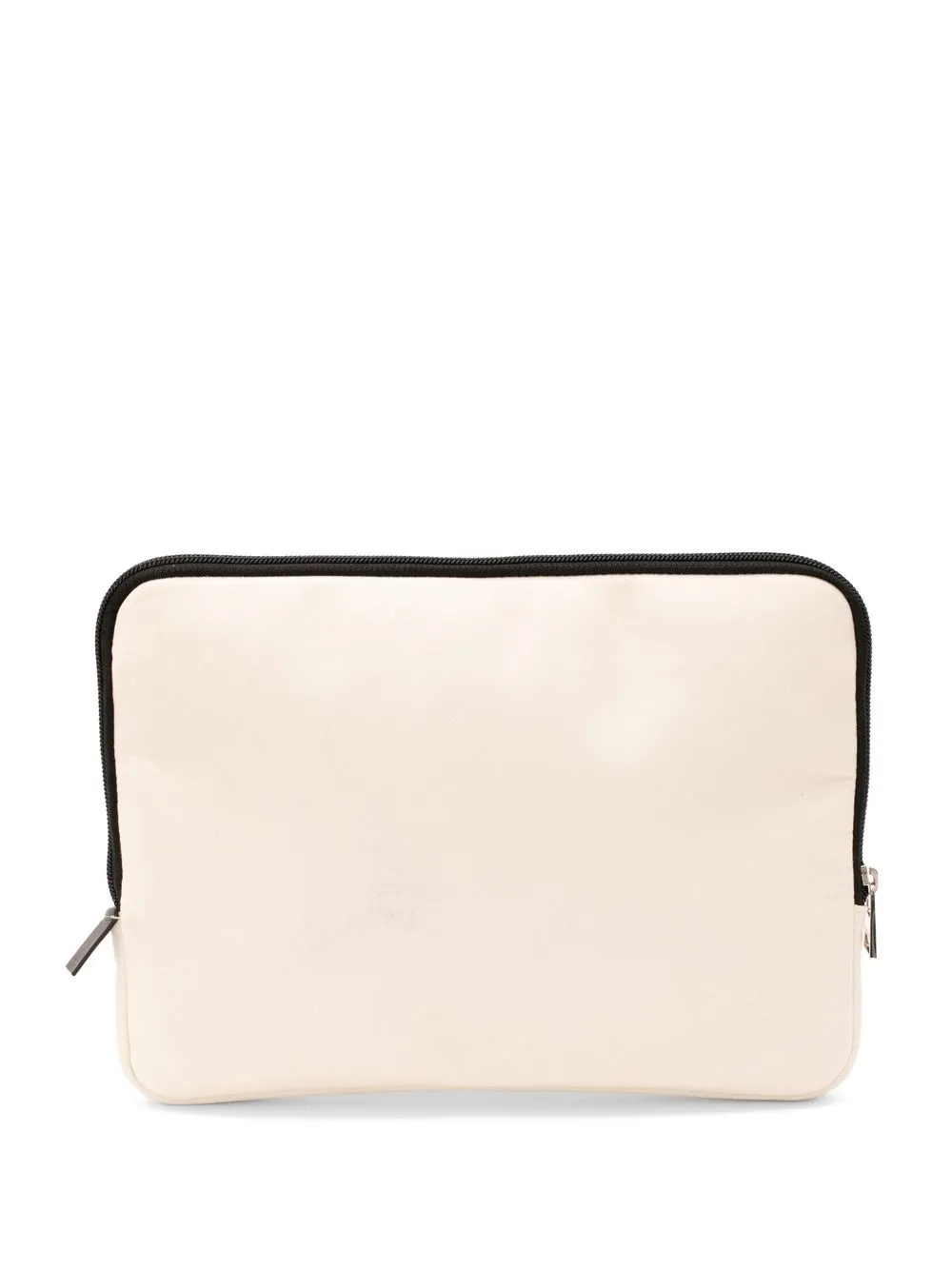 Nero/bianco, rifiniture in pelle, stampa con illustrazione, chiusura superiore con zip, scomparto unico e applicazione interna con logo.