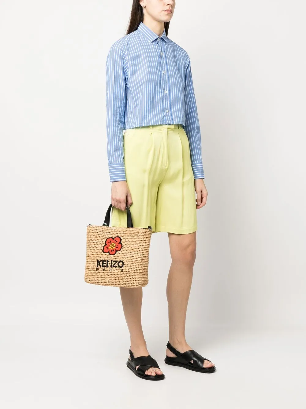 Color sabbia, design con rafia intrecciata, caratteristico motivo Boke Flower, logo ricamato, applicazione interna con logo, scomparto unico, tasca interna con zip, due manici e tracolla rimovibile.