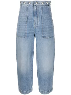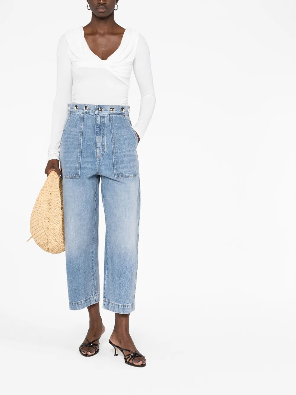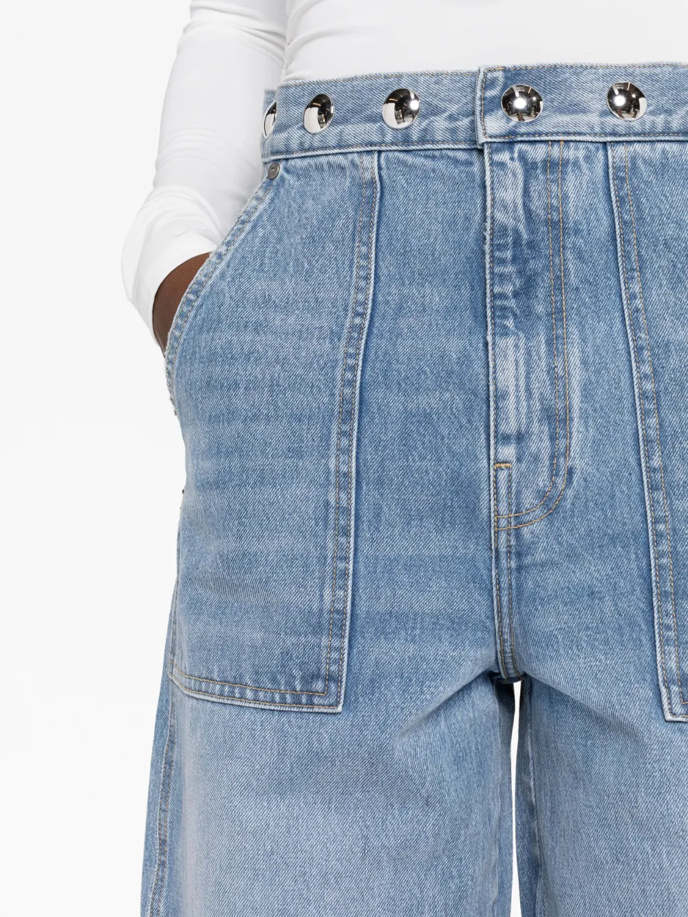 Azzurro cielo, cotone, denim, vita alta, dettaglio con borchie, dettagli color argento, chiusura frontale nascosta, tasche laterali, due tasche posteriori applicate, taglio boyfriend e taglio crop.