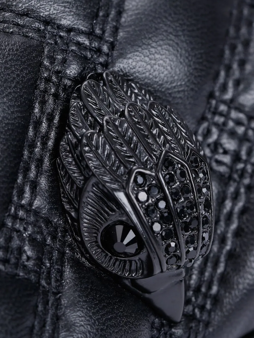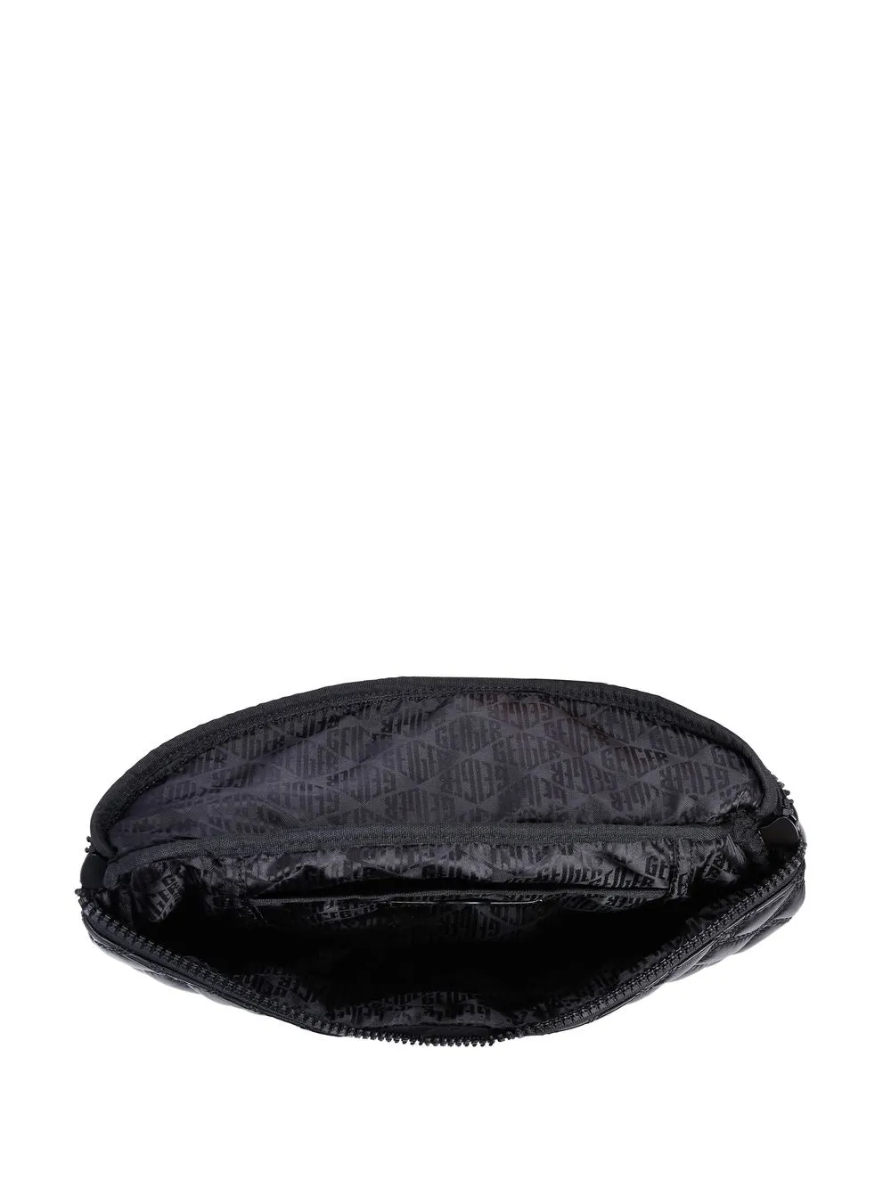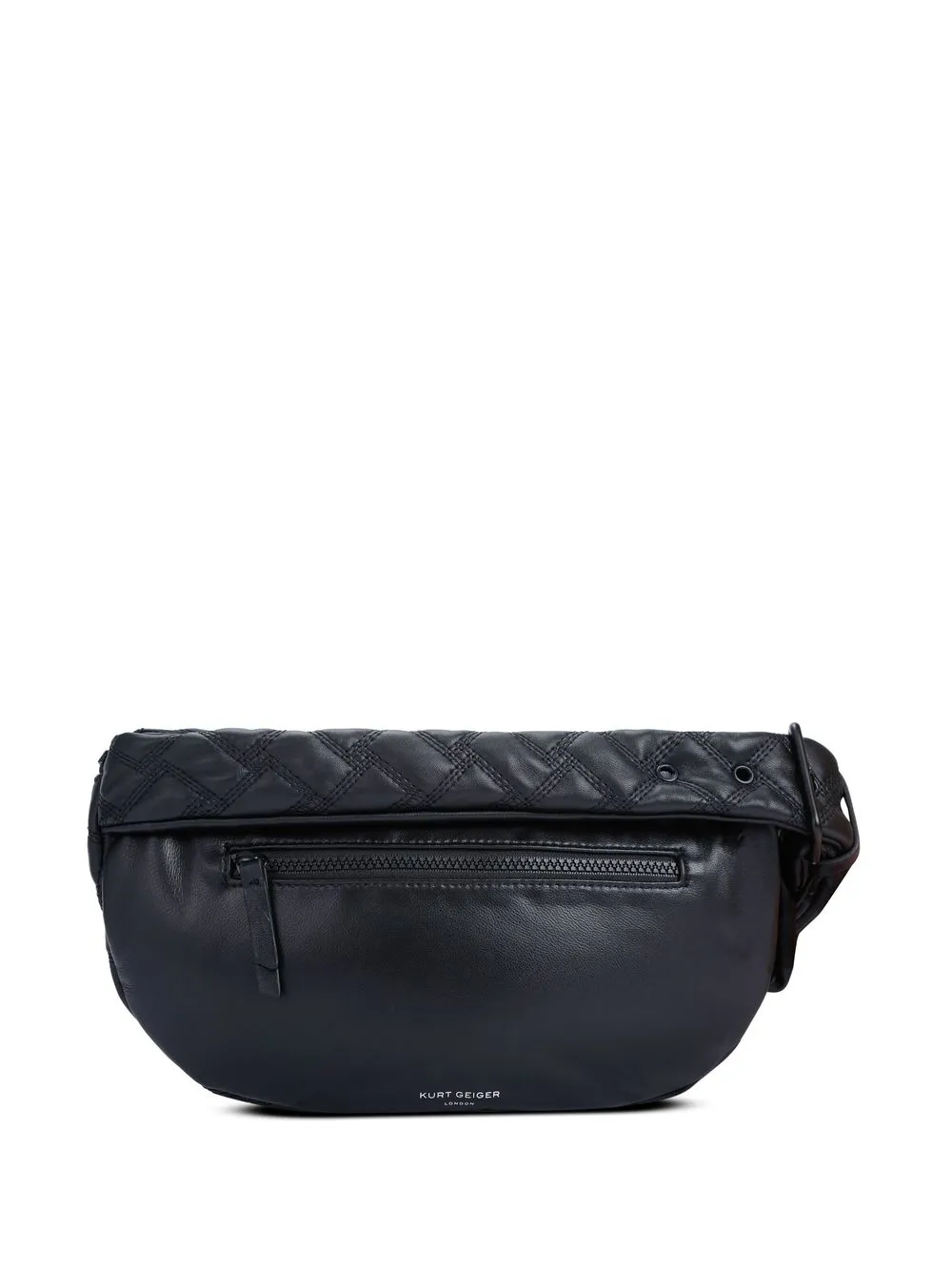 Nero, pelle di agnello, finitura imbottita, placca con logo, fascia in vita regolabile e chiusura posteriore con zip.
