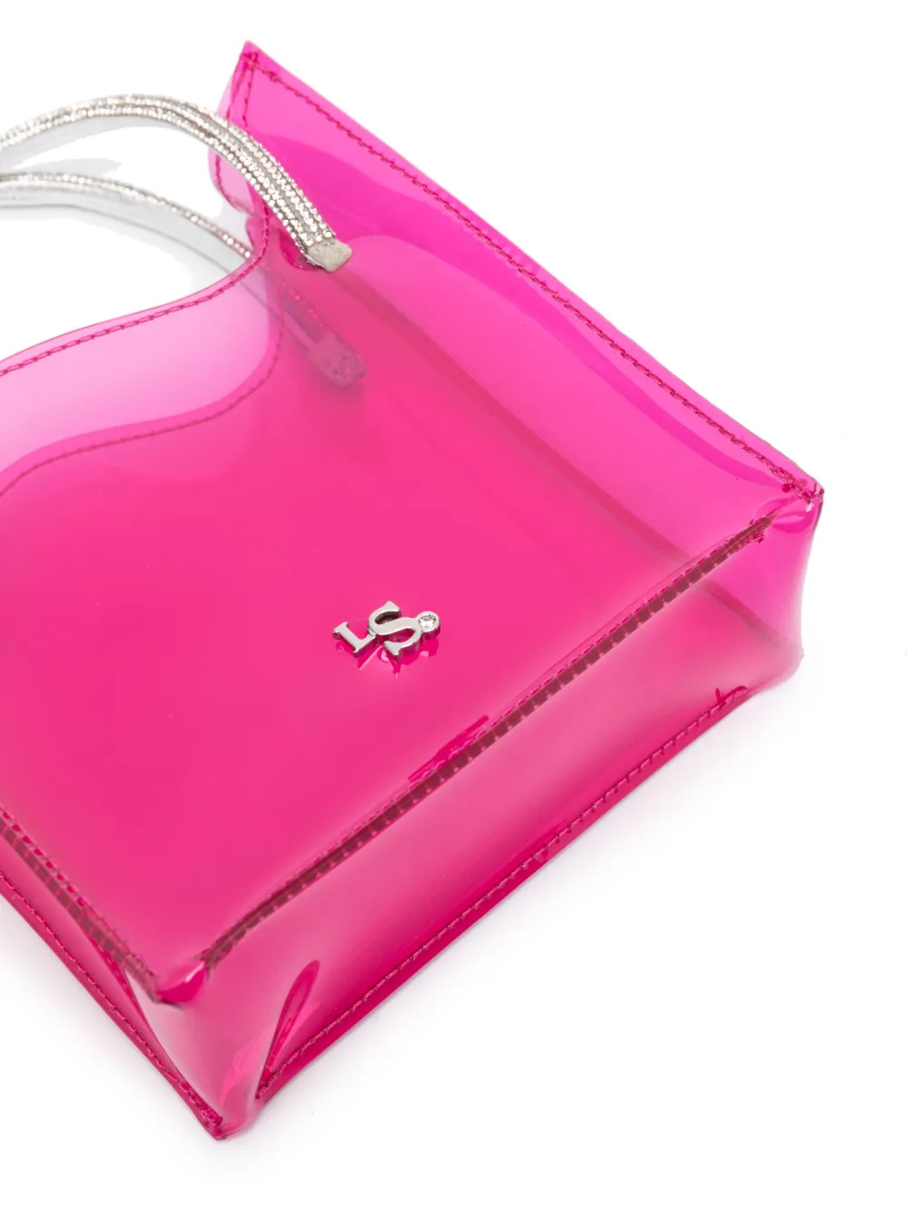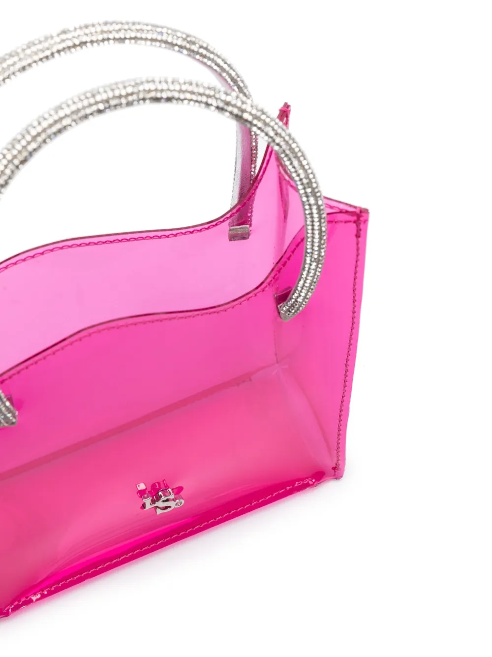 Rosa shocking, design trasparente, decorazione in cristalli, logo in lettere color argento, due manici tondi, parte superiore aperta e scomparto unico.