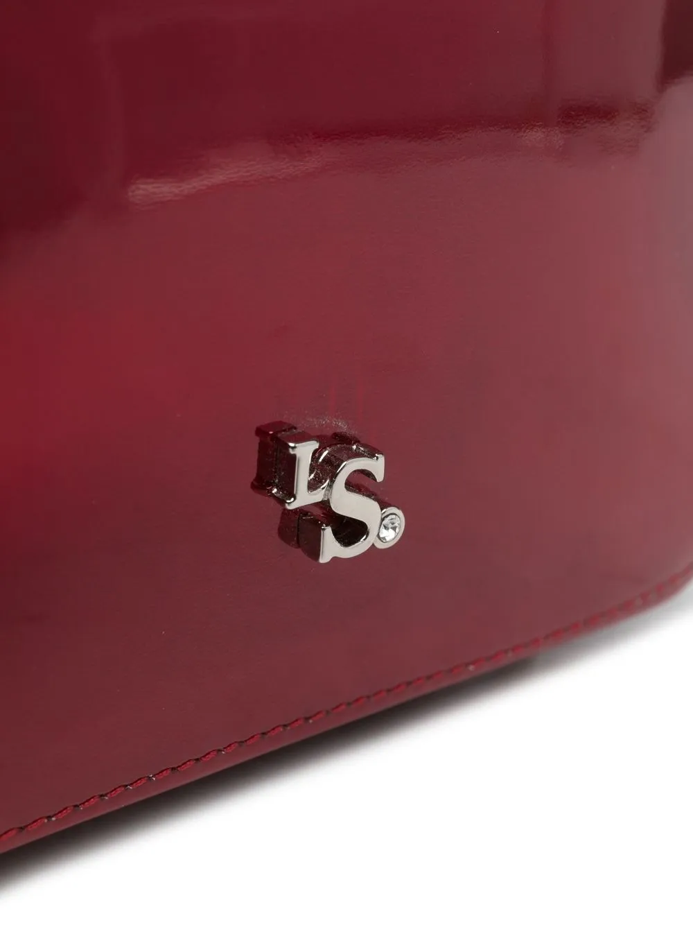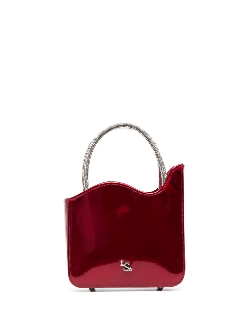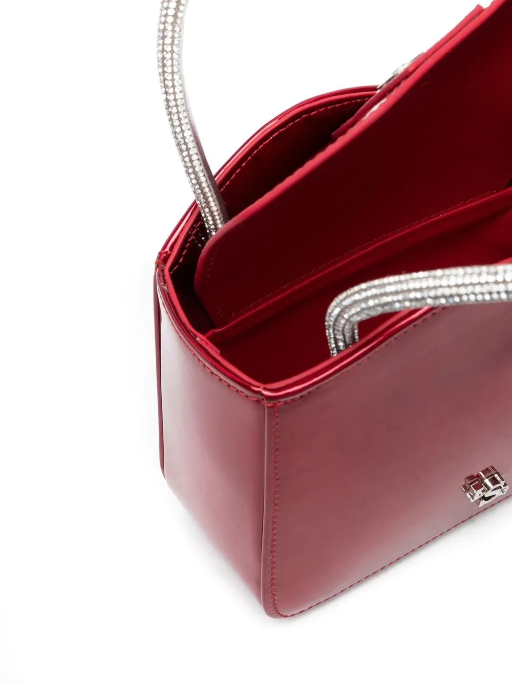 Rosso bordeaux, pelle verniciata, decorazione con cristalli, modello asimmetrico, placca con logo color argento, due manici tondi laterali e scomparto interno diviso.
