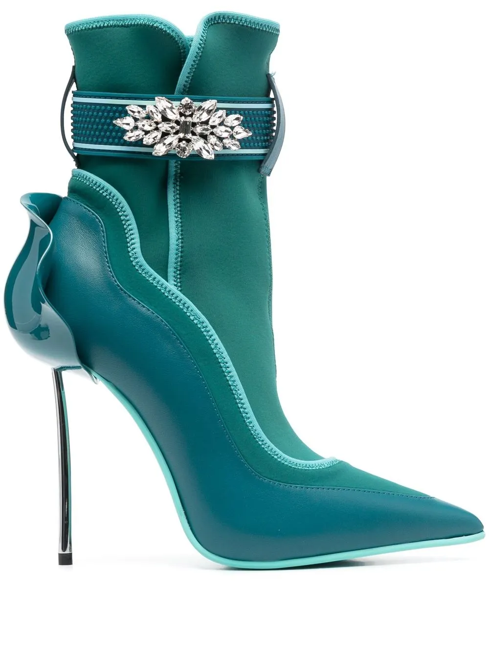 Foglia di tè scuro, pelle di vitello, dettaglio con pannelli a contrasto, fascia alla caviglia con decorazione in cristalli, design a punta, chiusura a strappo alla caviglia, altezza alla caviglia, tacco alto a stiletto, fodera in pelle e suola in gomma.