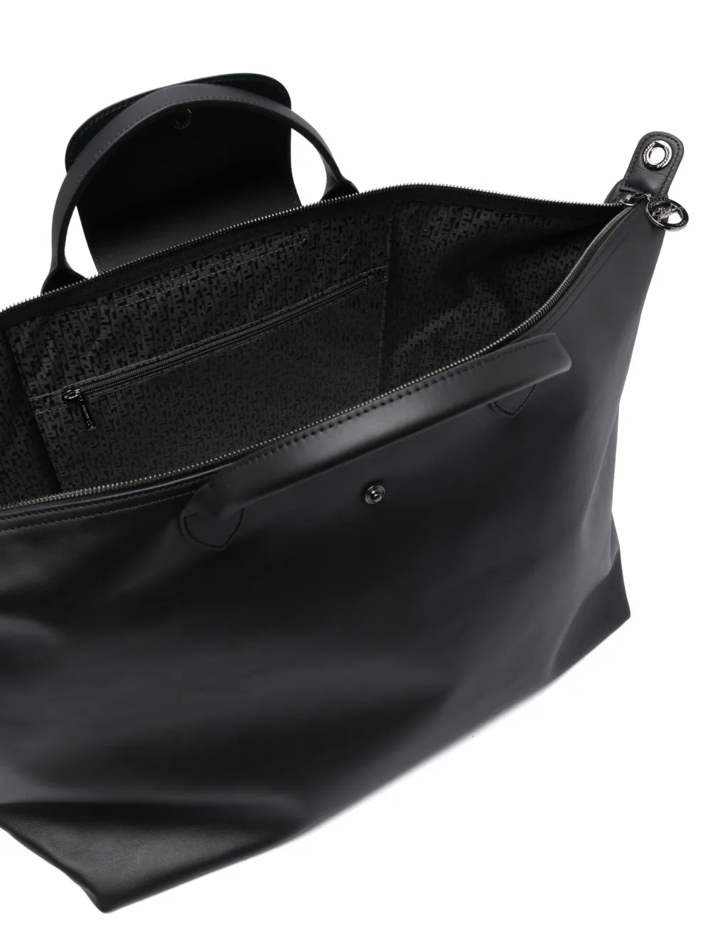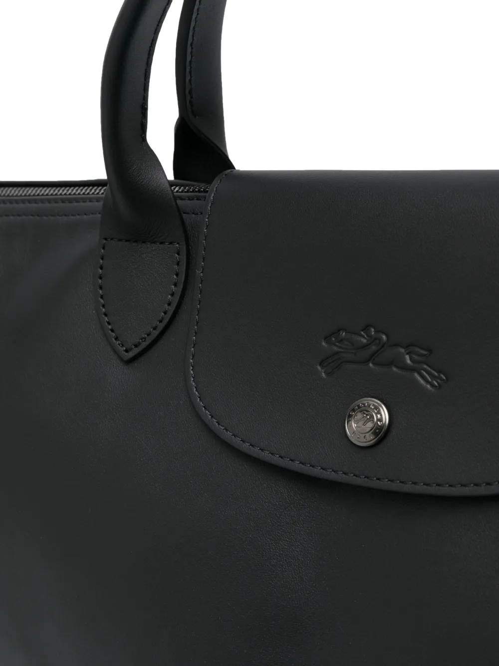 small Le Pliage travel bag from LONGCHAMP featuring black, calf leather, embossed logo to the front, top zip fastening, two rolled top handles, magnetic fastening and main compartment.