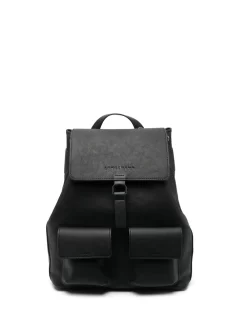 Nero intenso, pelle di vitello, trama martellata, logo goffrato nella parte anteriore, due tasche frontali con pattina, chiusura con fibbia color argento, manico superiore, spalline regolabili, chiusura superiore a coulisse, scomparto unico e tasca interna con zip.