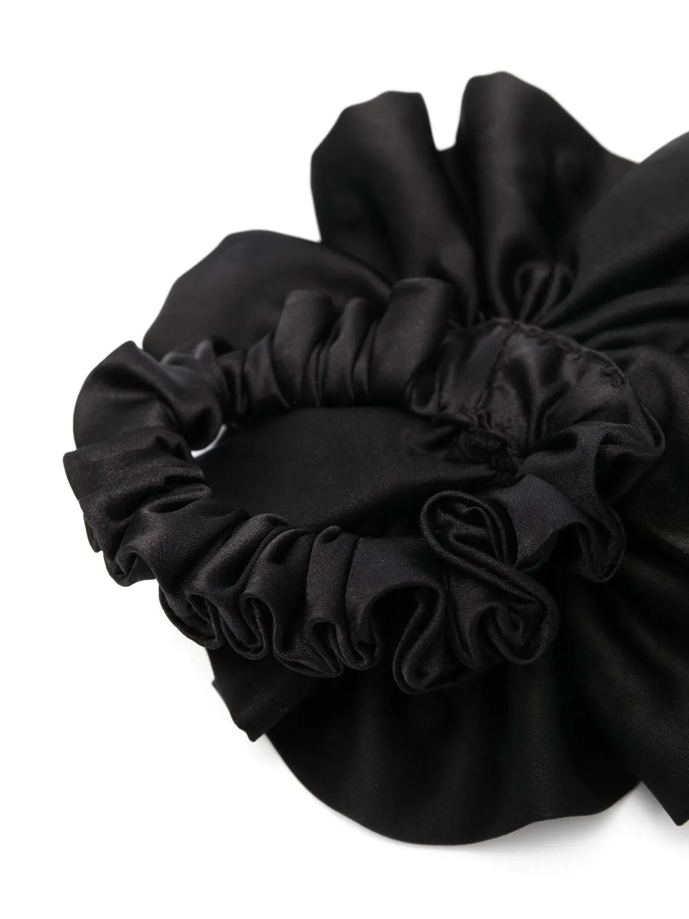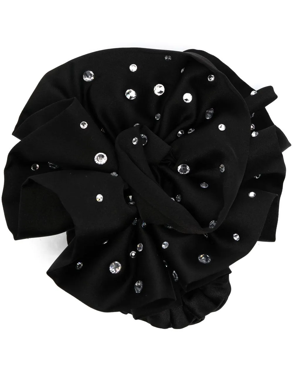 Nero, decorazione in cristalli, dettaglio con fiore applicato e dettaglio con ruches.