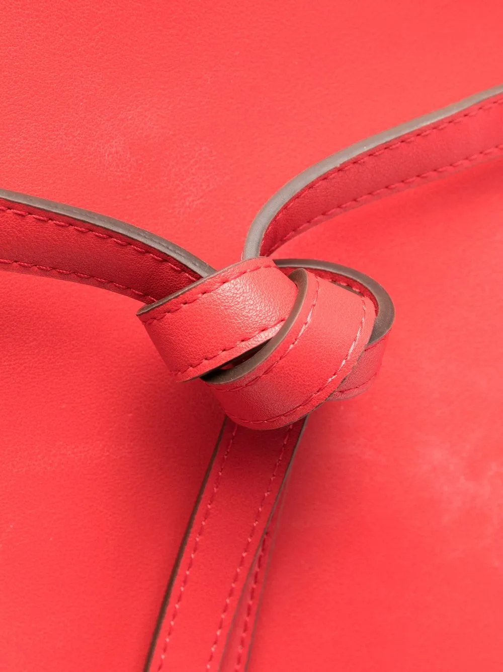 Rosso mattone, pelle cruelty-free, dettaglio con nodo, placca con logo color oro, logo inciso, due manici piatti, chiusura a coulisse, chiusura magnetica, tasca interna a soffietto e stampa interna con logo.