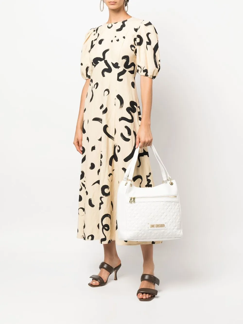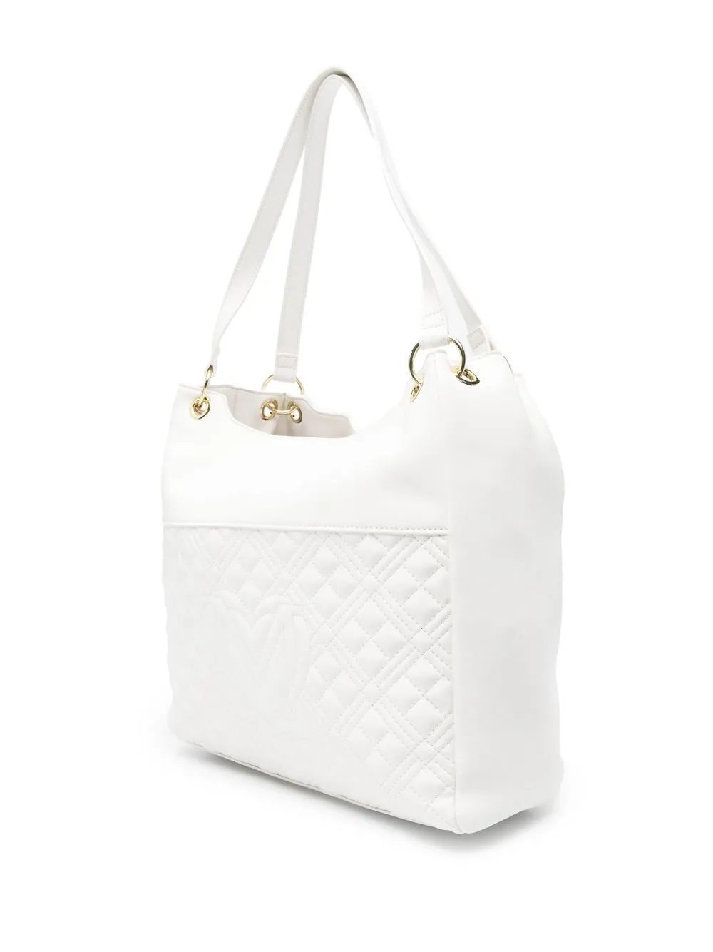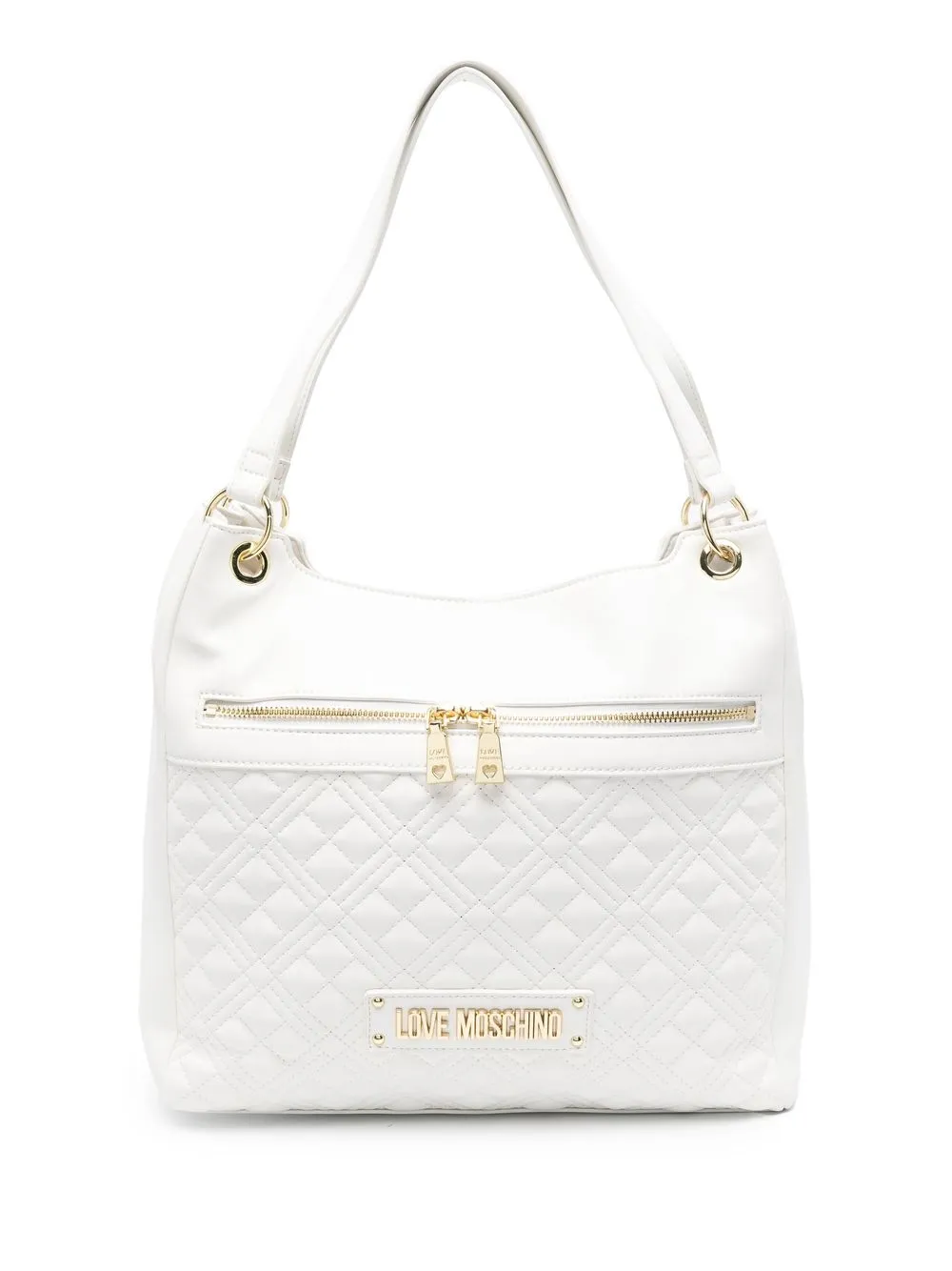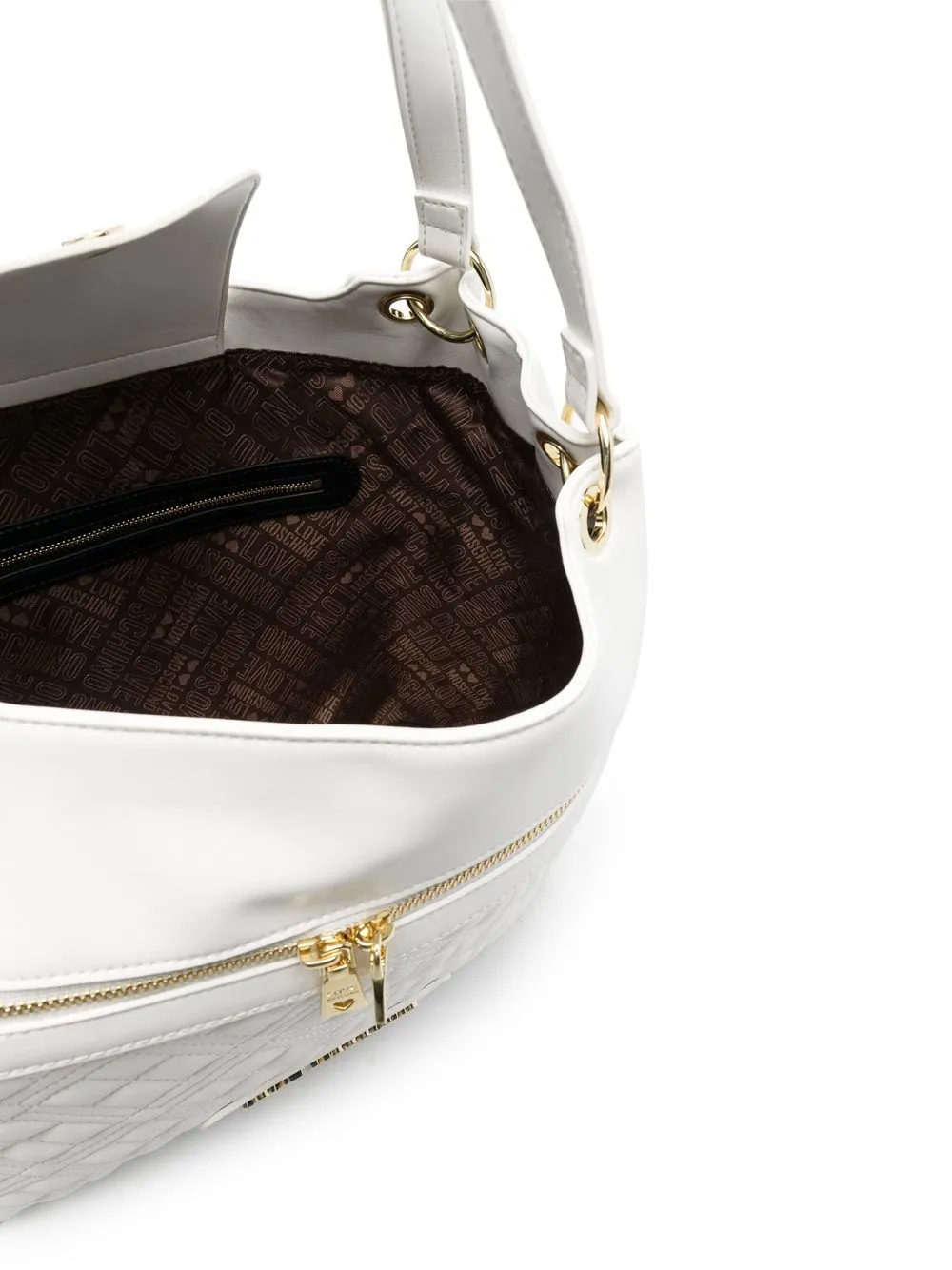 Bianco cloud, logo in lettere color oro, dettaglio trapuntato, dettagli color oro, manici piatti, tasca frontale con zip, scomparto unico e tasca interna con zip.
